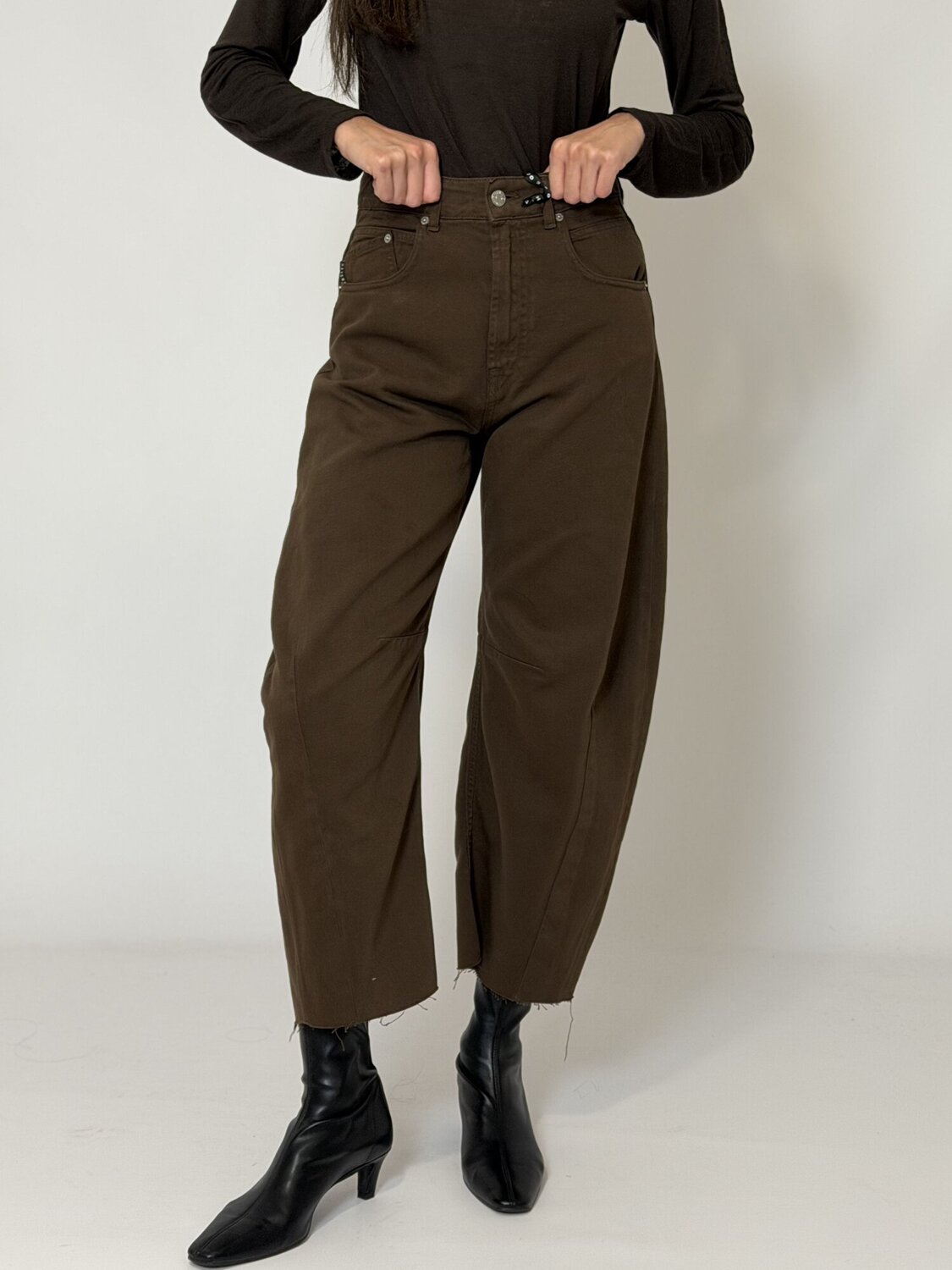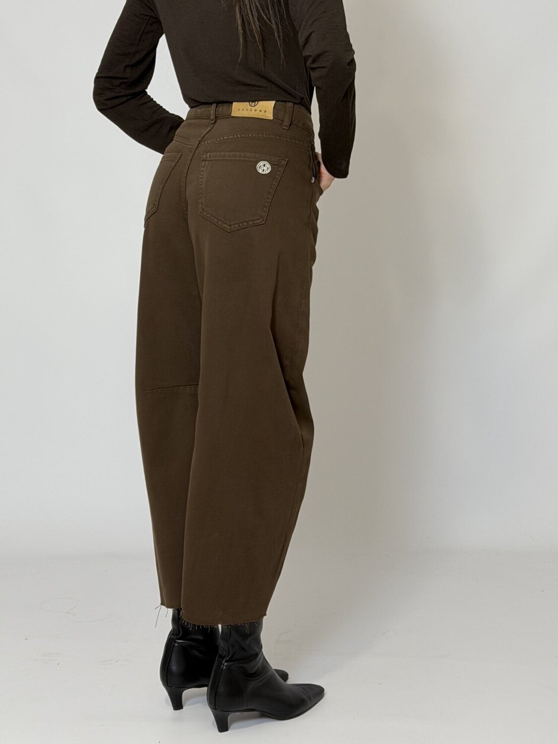 Jeans barrel leg Barbara cioccolato di Haveone. Jeans in denim rigido a vita alta con vestibilità a gamba curva (barrel leg) e taglio ampio. Punto vita liscio, orlo sfrangiato alle caviglie e passanti per cintura. Vestibilità ampia. Disponibili nel colore cioccolato.