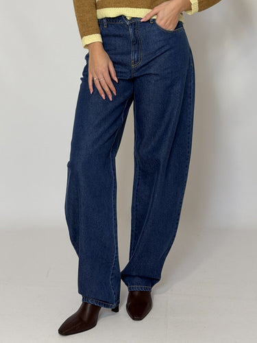 Jeans barrel blu denim. Taglio a gamba larga a barile. Vestibilità comoda. Allacciatura con bottone e zip. Passanti per la cintura. Disponibile in blu denim.