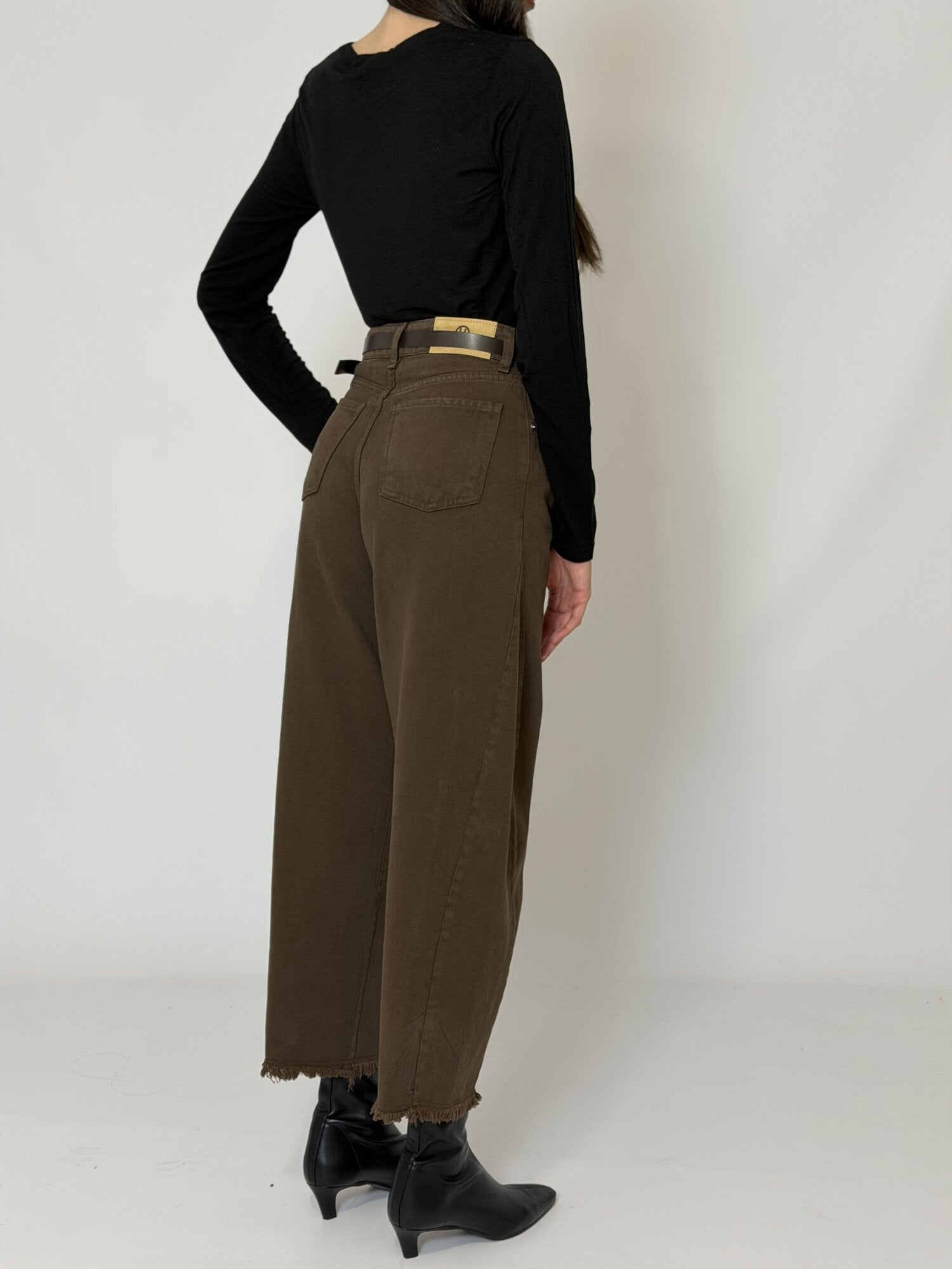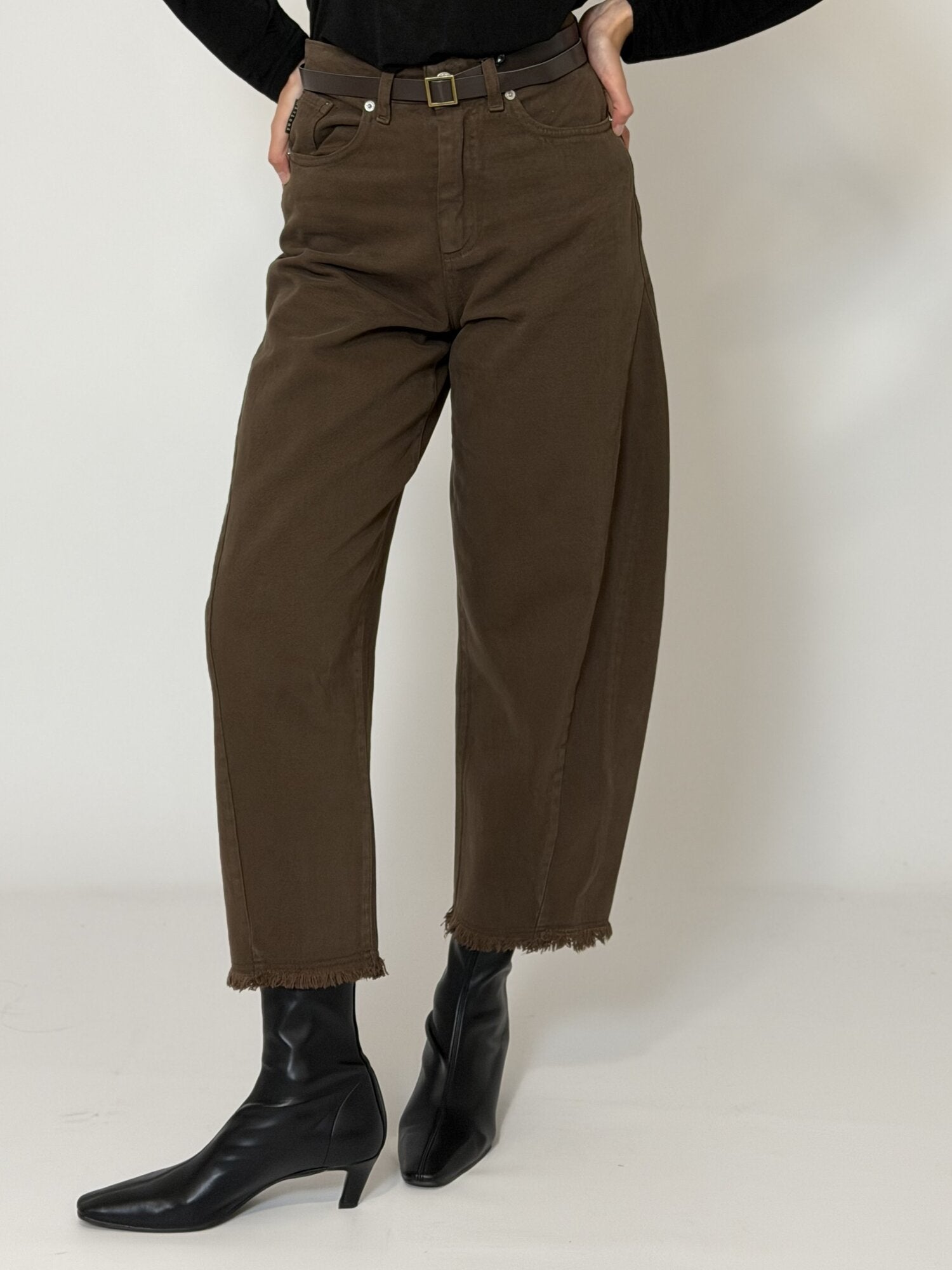 Jeans barrel leg sfrangiato con cintura cioccolato - Haveone