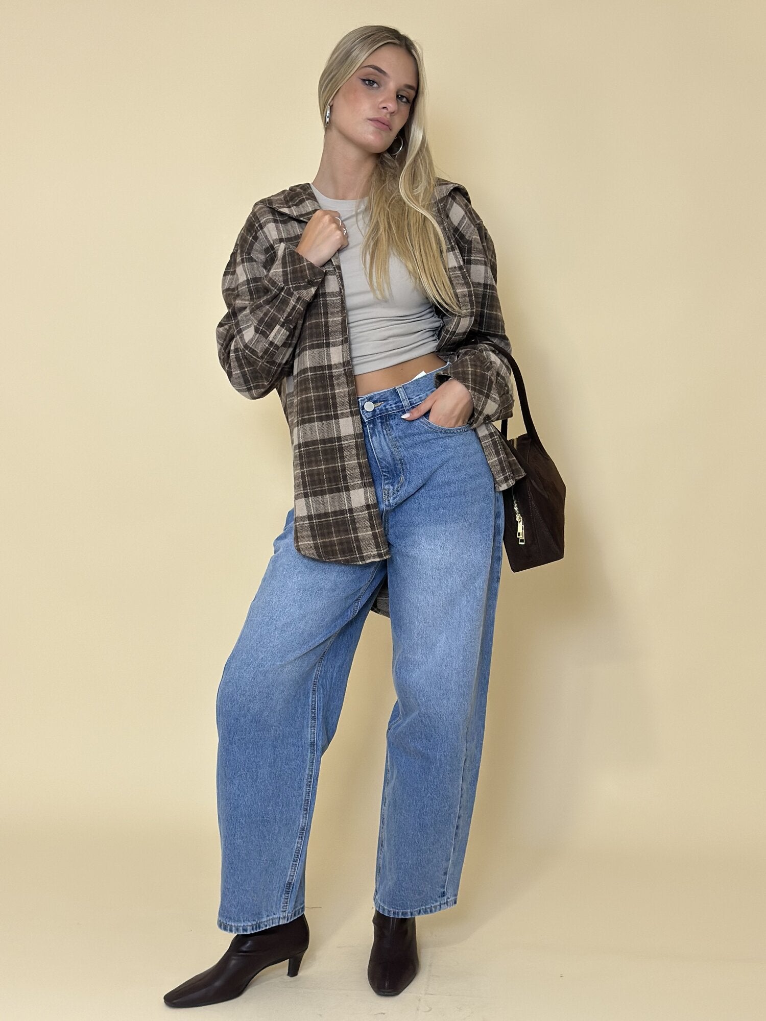 Jeans barrel Blu Denim di Eleh. Jeans a vita alta modello barrel leg 5 tasche. Passanti per cintura in vita e chiusura con bottoni. Disponibile in blu denim.