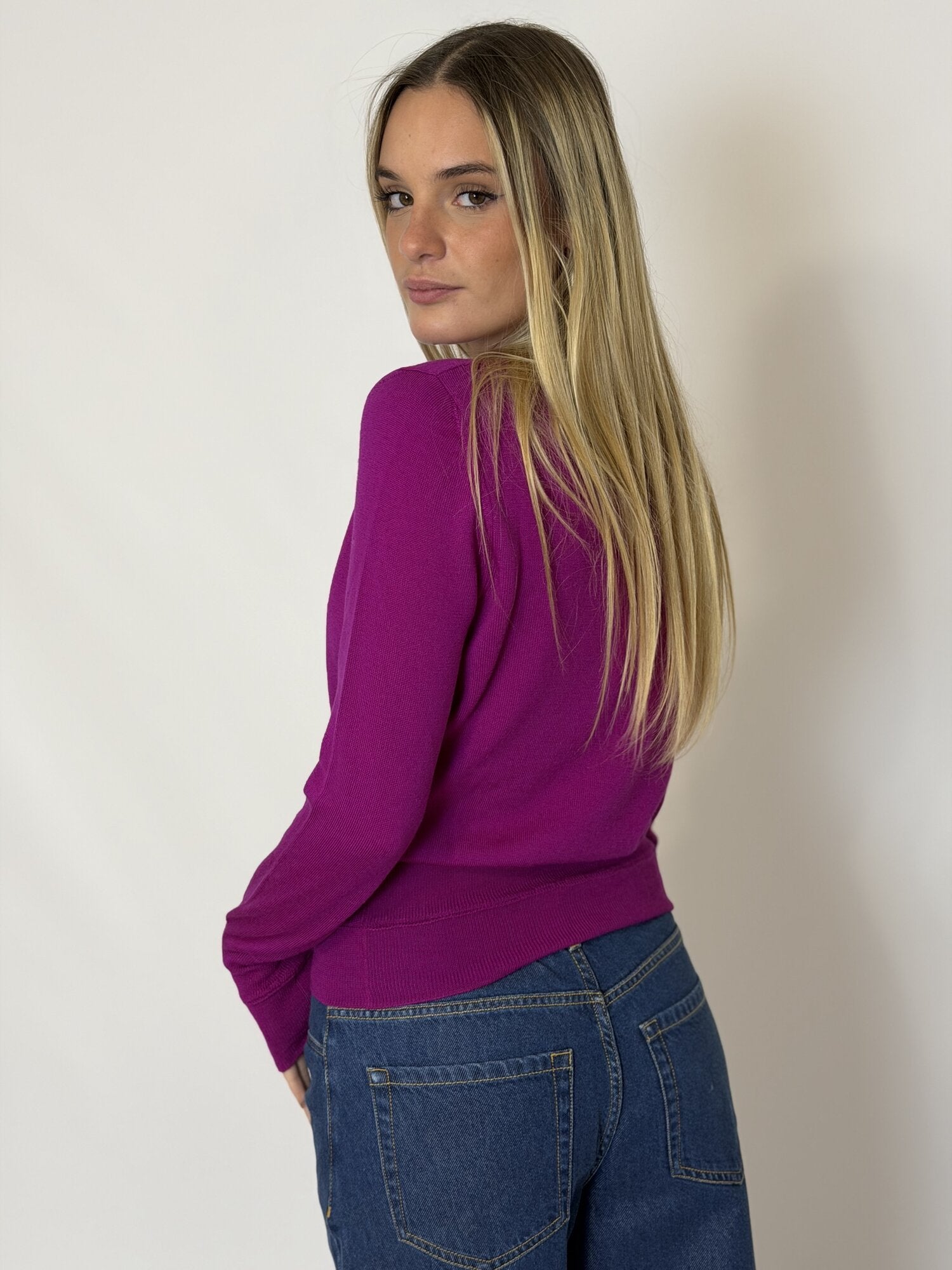 Polo in maglia con collo a listino fucsia di Meimei J . Polo a maniche lunghe in maglia rasata leggera in una delicata tonalità di beige. Presenta un collo alto a listino con una piccola apertura a V. La chiusura è caratterizzata da una abbottonatura con due bottoni a contrasto neri. Il capo ha un taglio leggermente cropped e una fascia a costine sul fondo. Disponibile in beige, tabacco e fucsia.