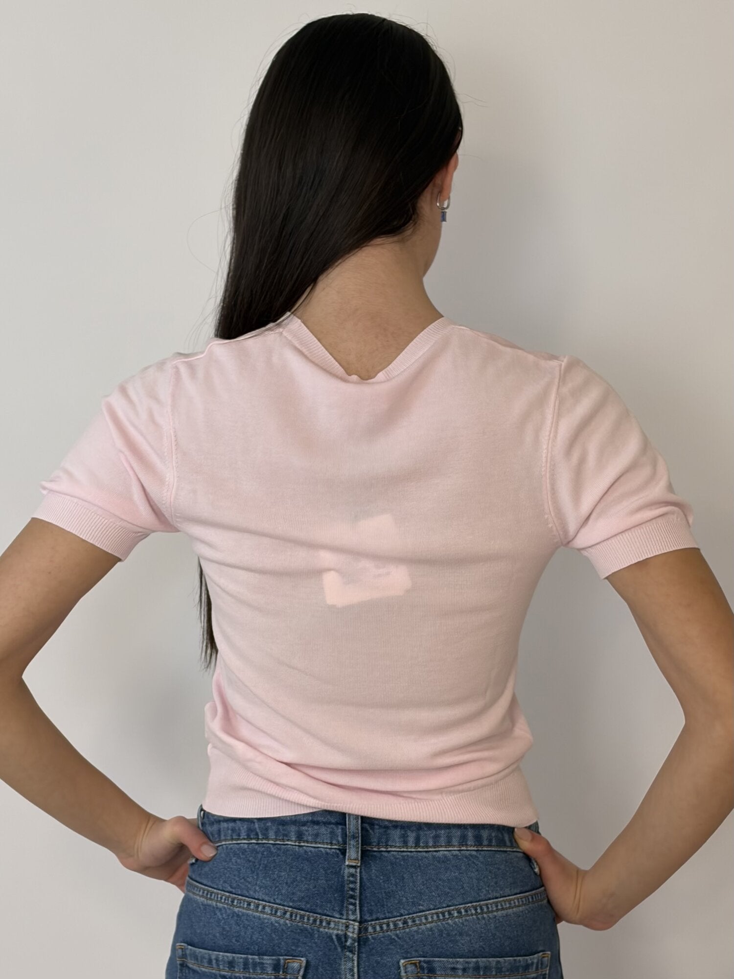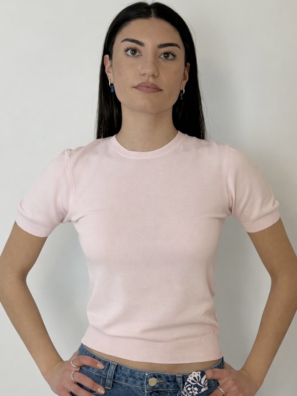 maglia girocollo a maniche corte in rosa, dal taglio essenziale e aderente.