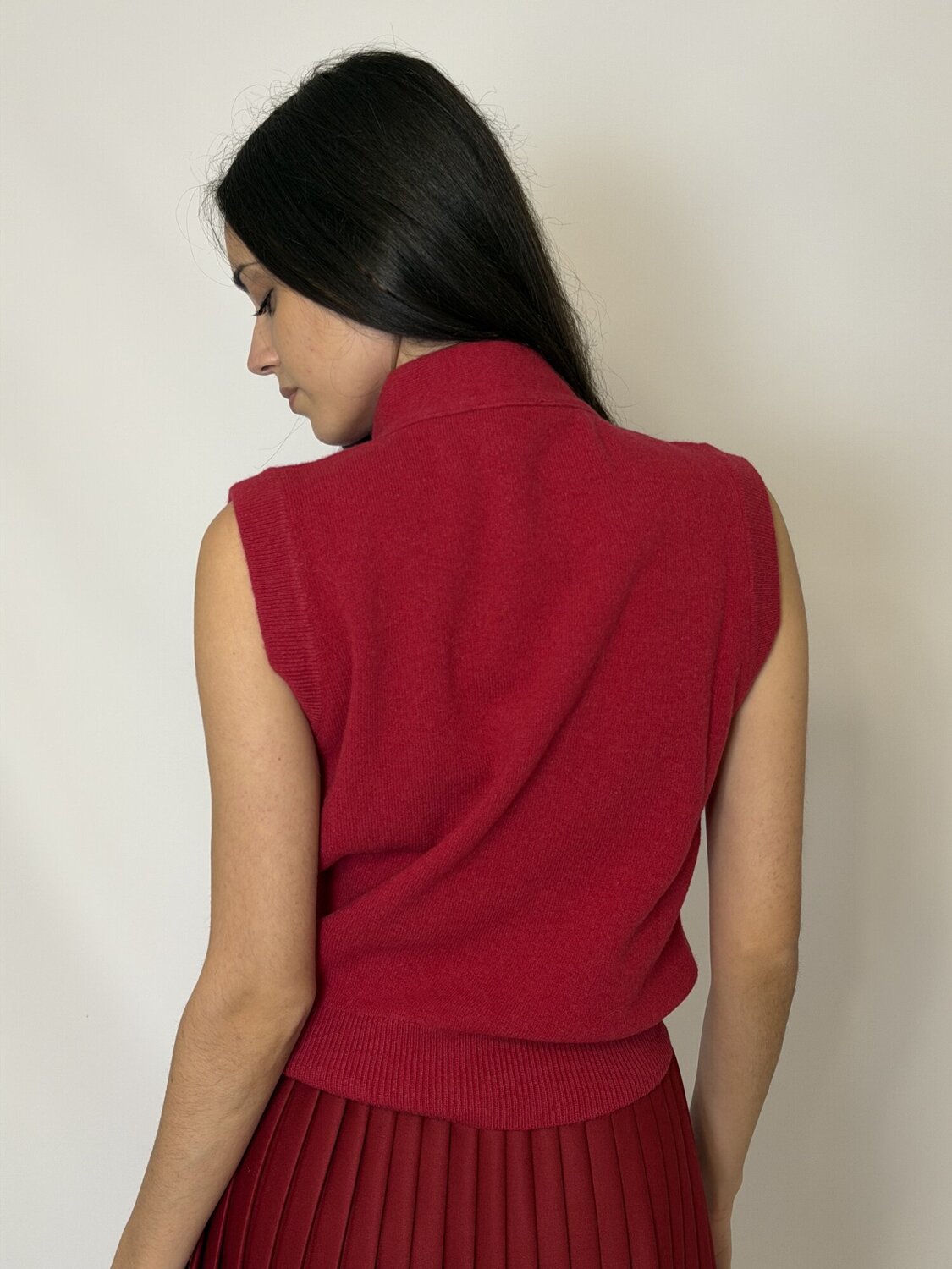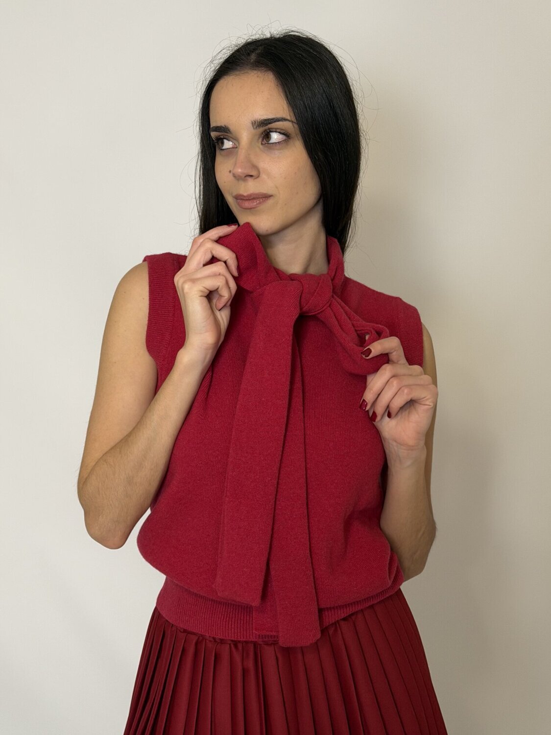 Gilet Maglia Fiocco Rosso di Vicolo. Maglia smanicata con fiocco da annodare sul collo in tessuto coordinato. Taglia unica. Disponibile in rosso.
