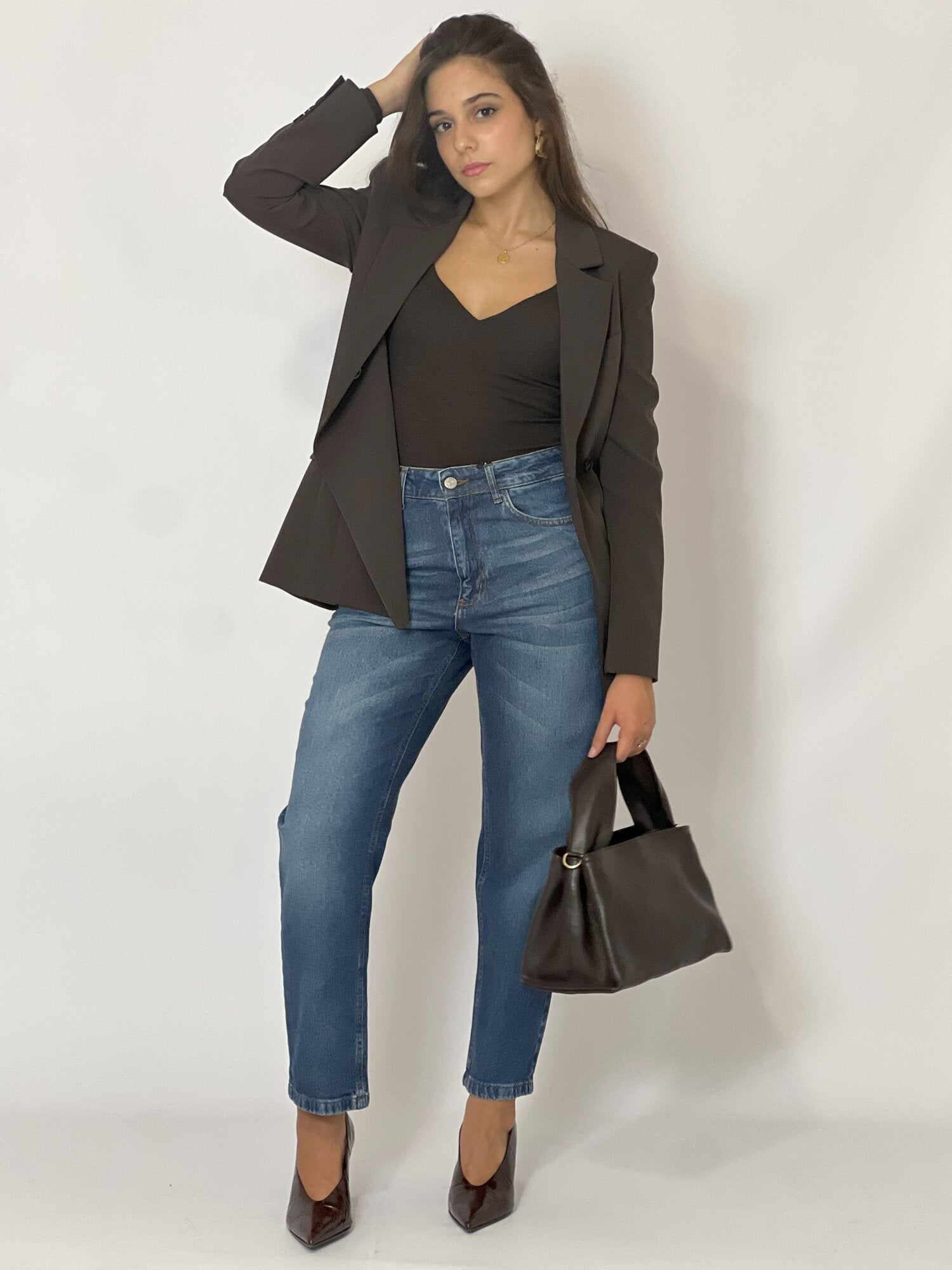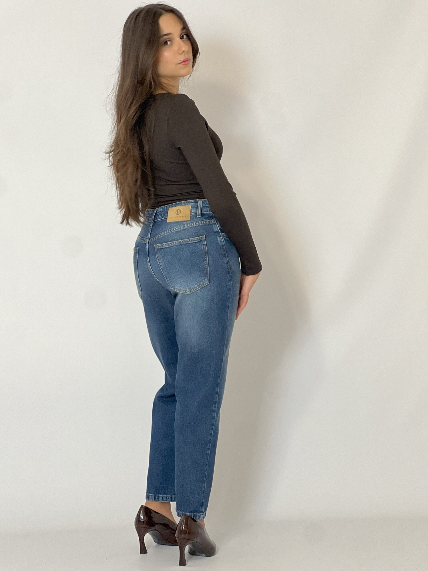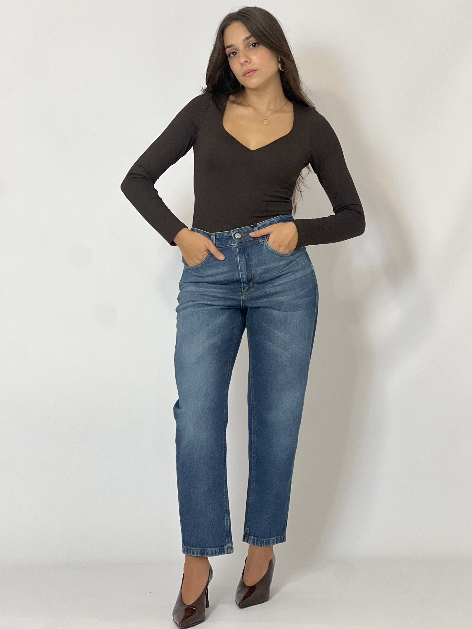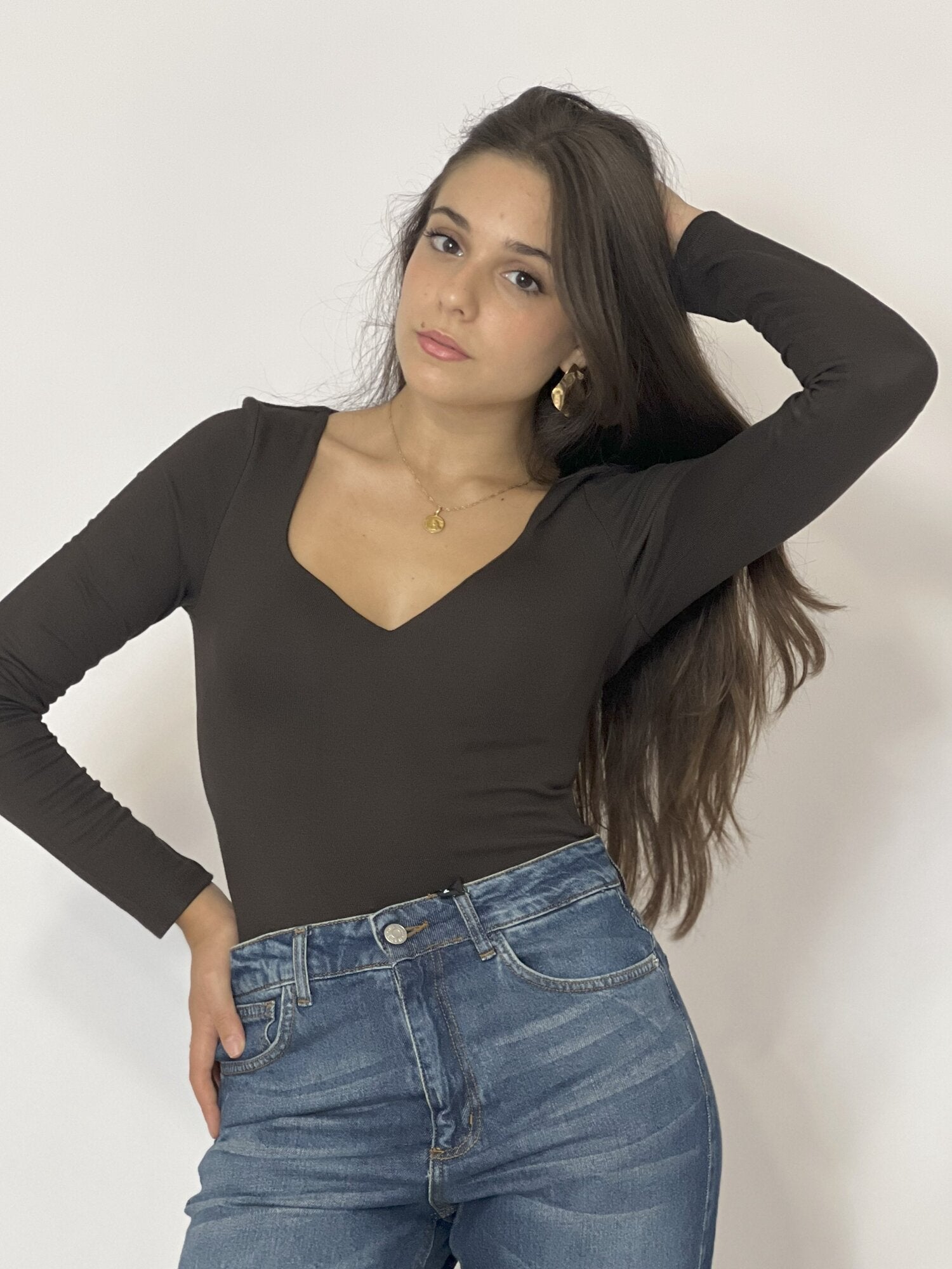 Body Scollo Cuore Moro di Haveone. Body in tessuto stretch elasticizzato con maniche lunghe e scollo a cuore con coppe imbottite. Vestibilità aderente. Disponibile in moro e nero.