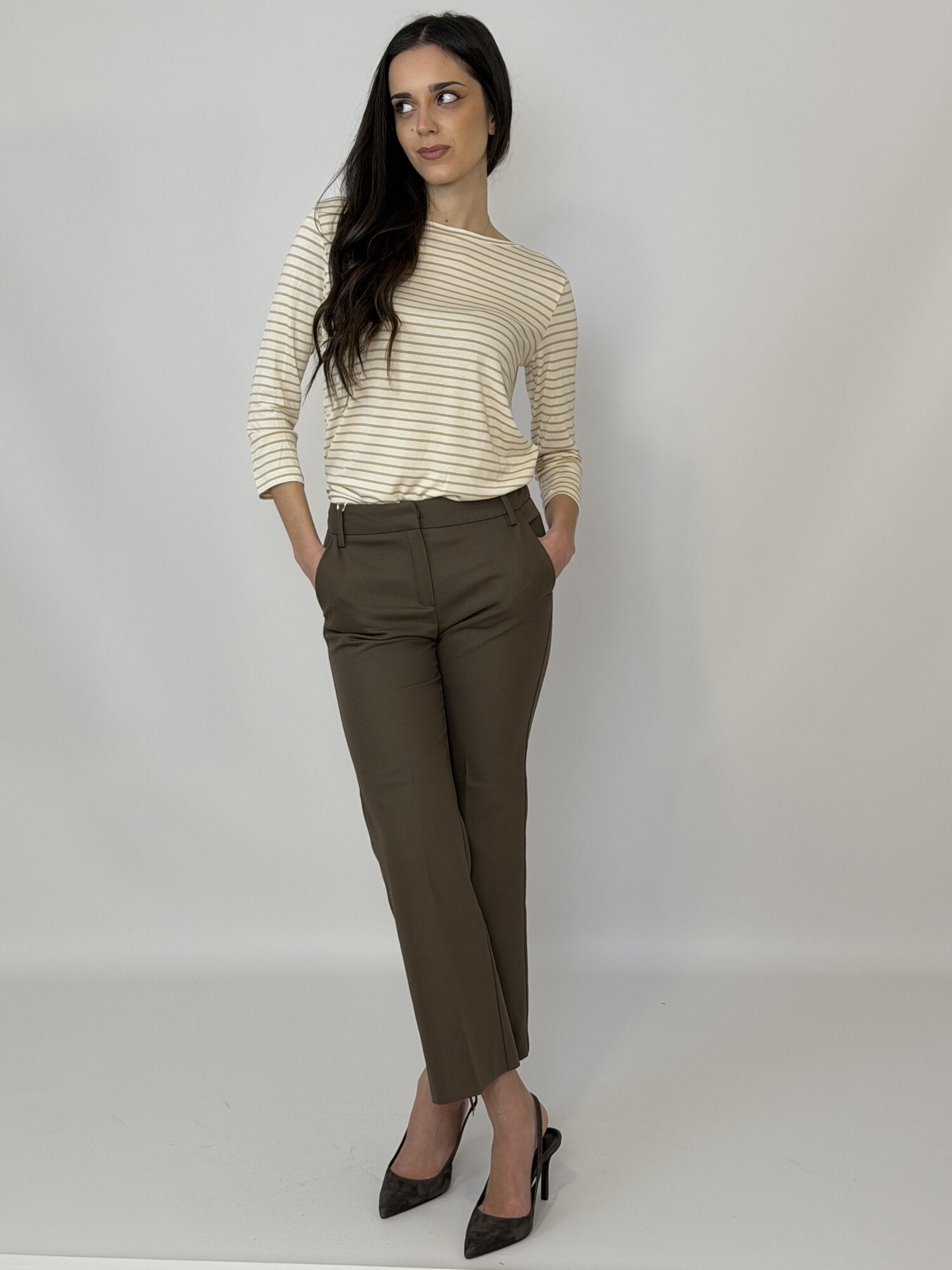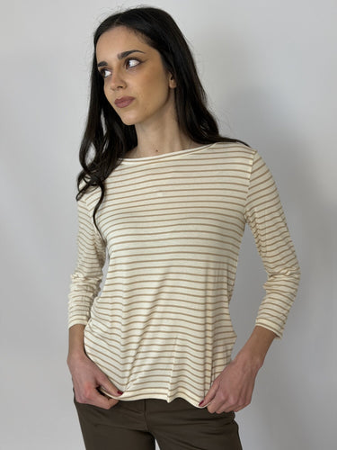Maglia Emmcosetta Righe beige di Emme. Maglia girocollo in jersey viscosa stretch rigato con manica a 3/4. Disponibile a righe rosso, beige e blu e a tinta unita panna e blu notte.