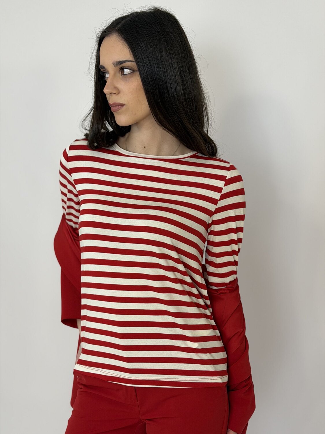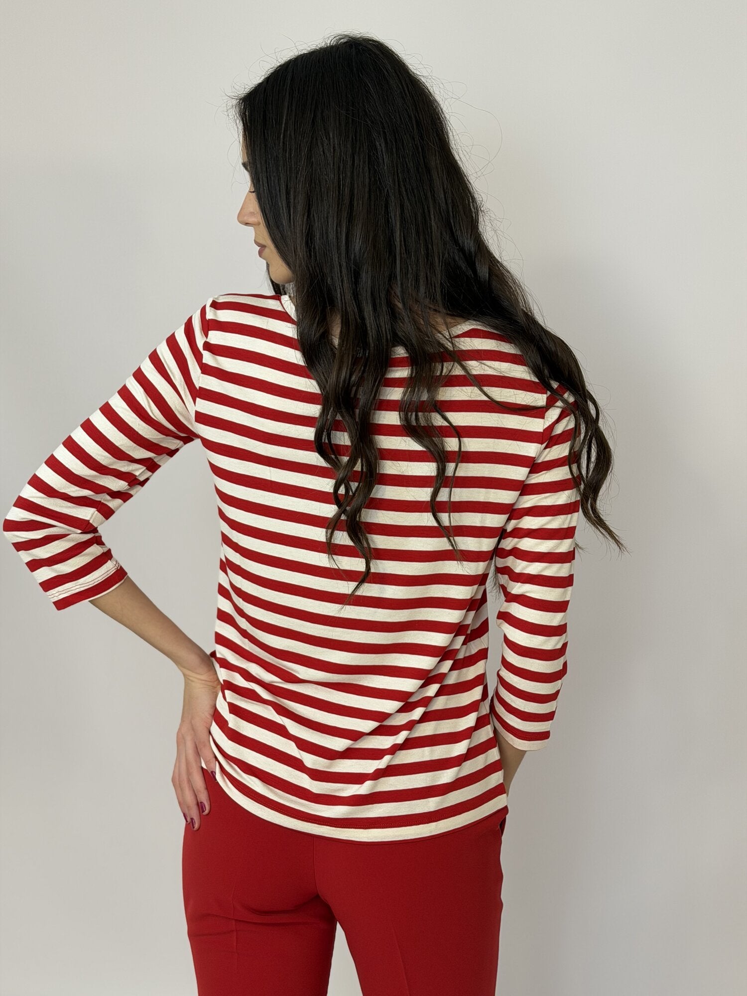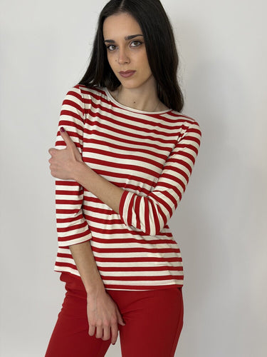 Maglia Emmcosetta Righe Rosso di Emme. Maglia girocollo in jersey viscosa stretch rigato con manica a 3/4. Disponibile a righe rosso, beige e blu e a tinta unita panna e blu notte.