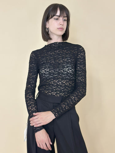 T-shirt Pizzo Shady Nero di Grace & Mila. T-shirt in pizzo elasticizzato dal taglio aderente e femminile. Maniche lunghe, modello accollato con finiture smerlate su scollatura, polsini e orlo. Disponibile in panna e nero.