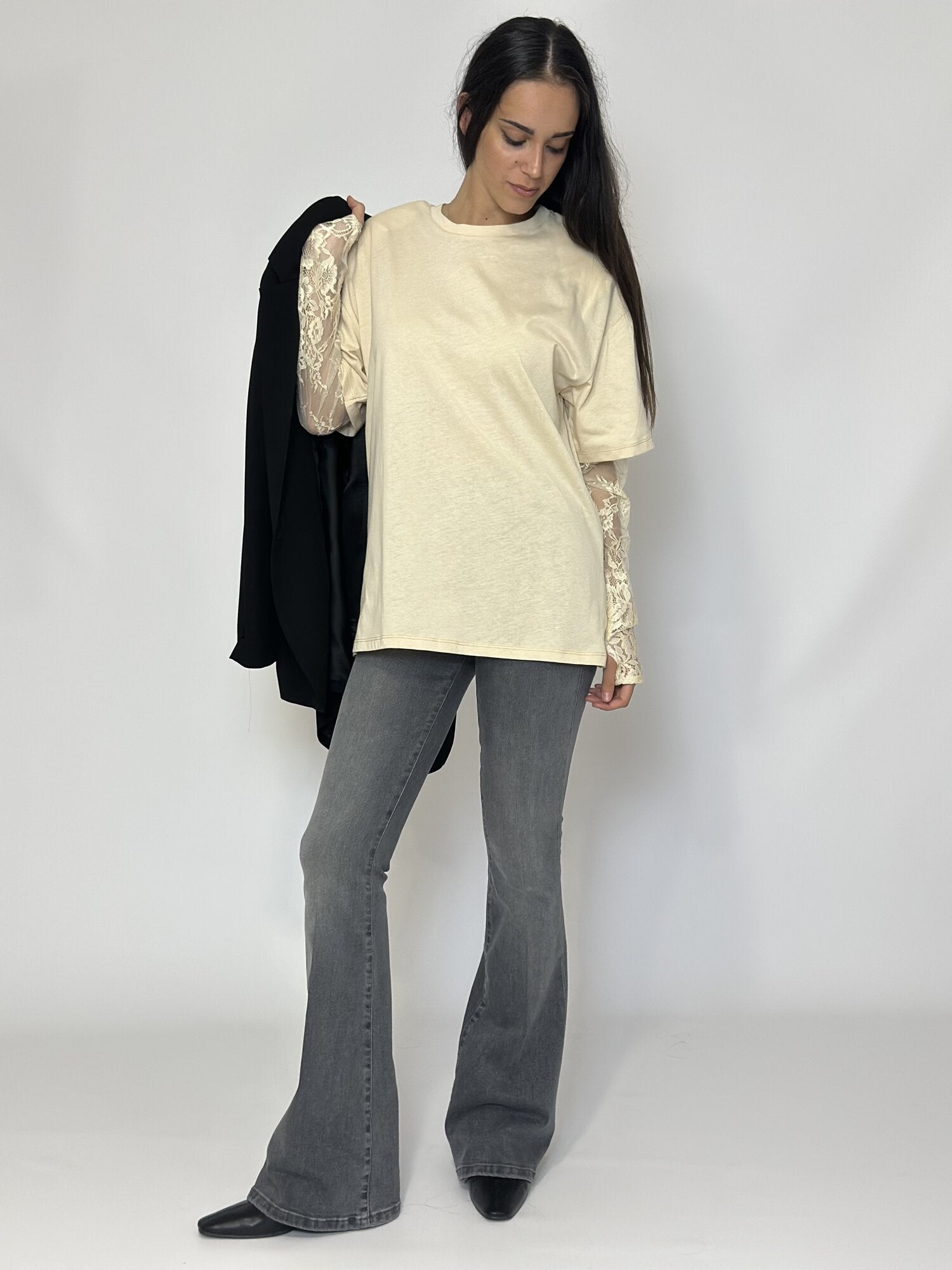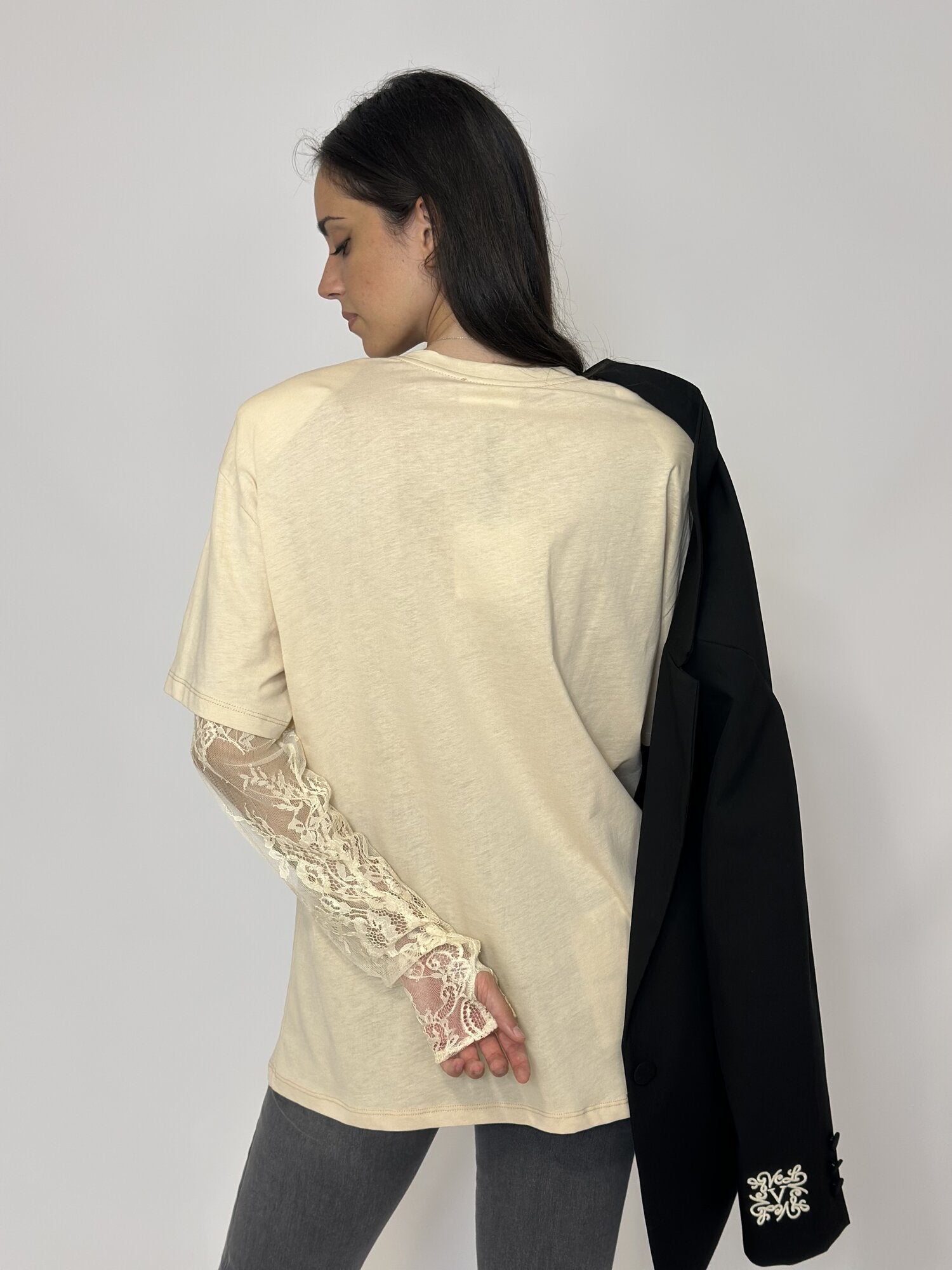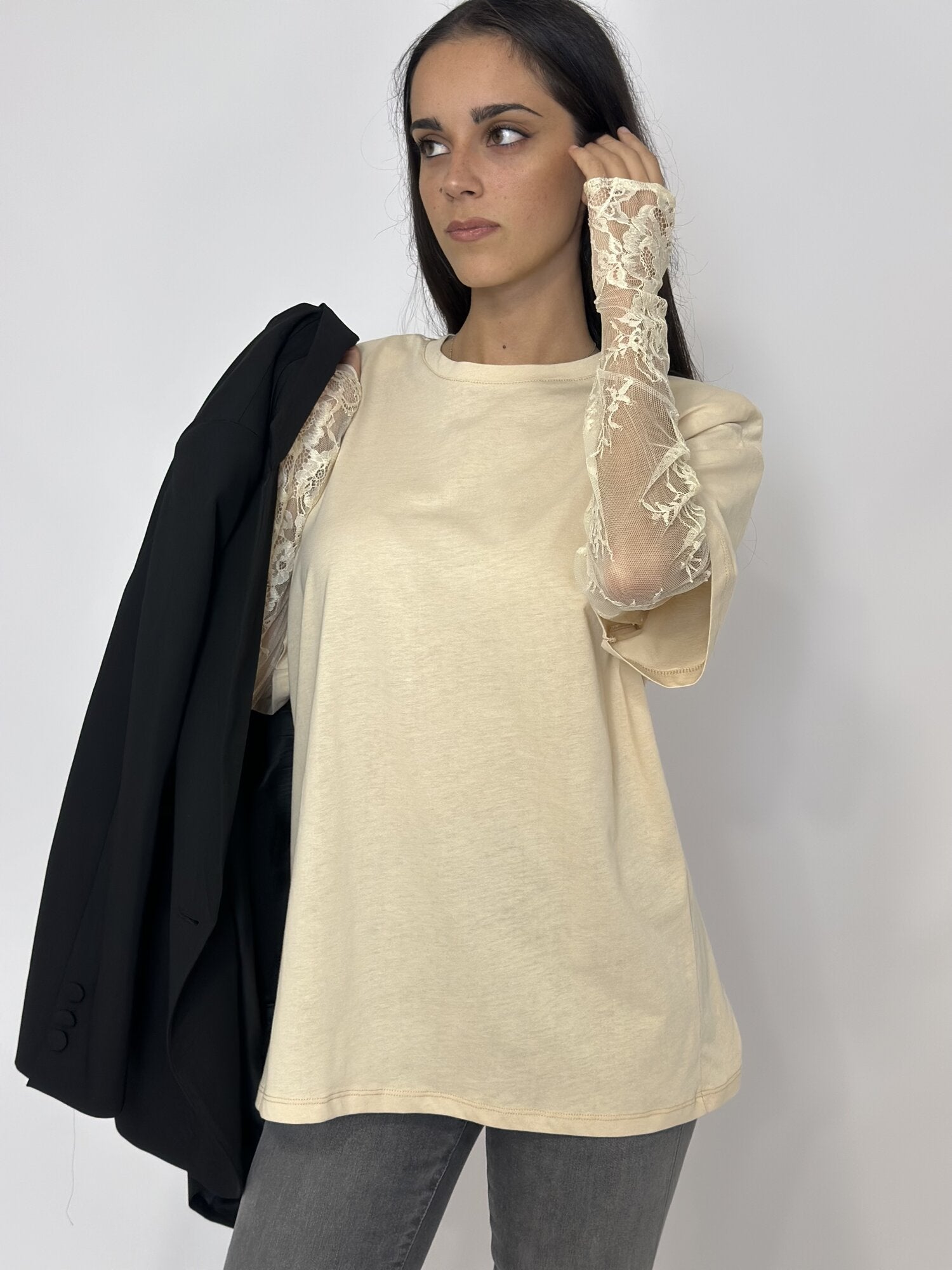 Tshirt con maniche di pizzo crema di Vicolo. T-shirt a maniche lunghe. Scollo rotondo e maniche ampie. Maniche lunghe in pizzo a contrasto. Vestibilità morbida e destrutturata. Disponibile nel colore crema.