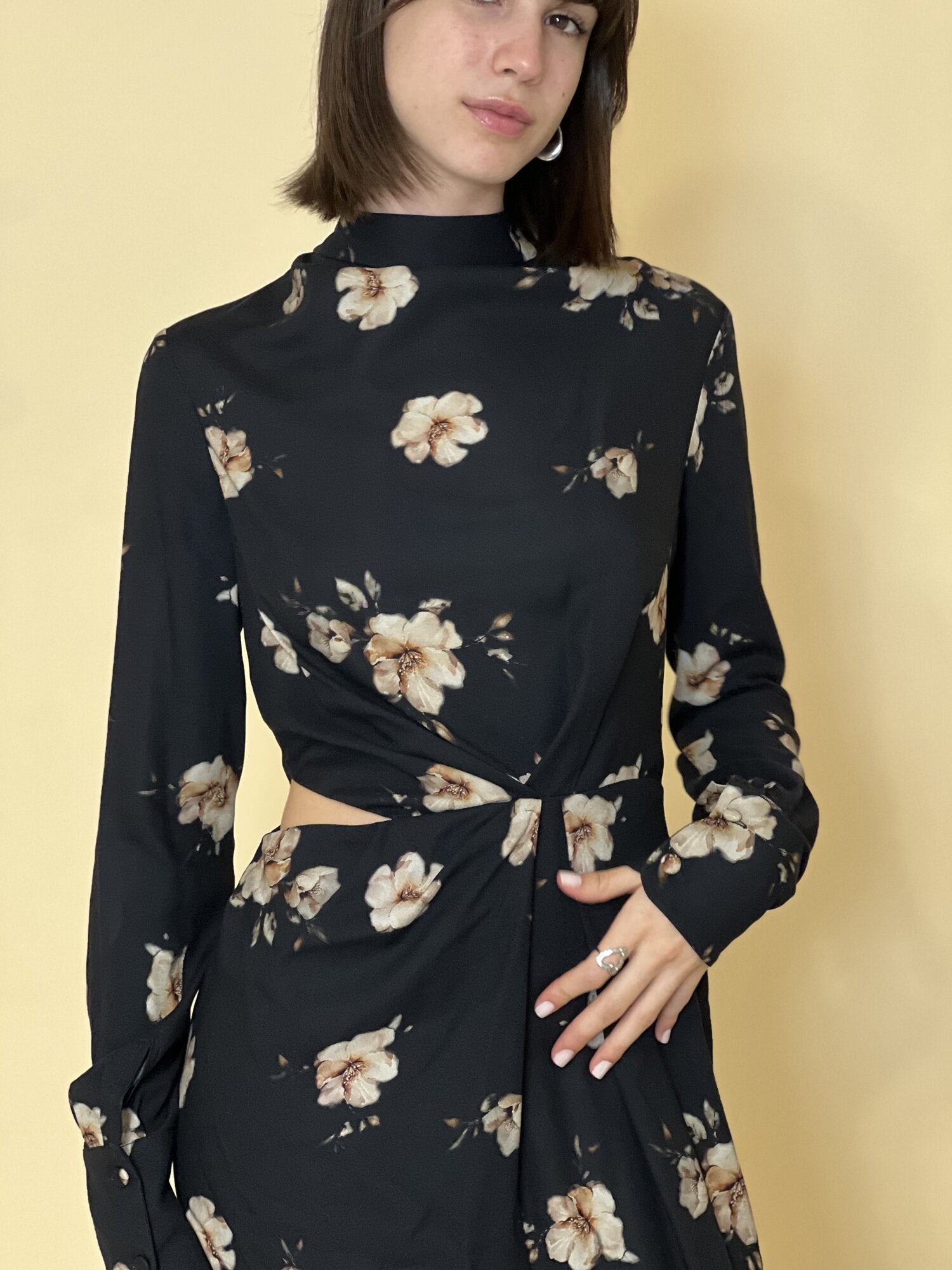 Abito lungo Maggie fiori nero di Mar De Margaritas. Abito a fantasia floreale midi con scollo a barca e maniche lunghe. Ripresa centrale in vita e dettaglio cut-out. Gonna svasata. Vestibilità morbida e dritta. Tessuto leggero e fluido con stampa floreale di fiori di albicocco. Disponibile nel colore nero.