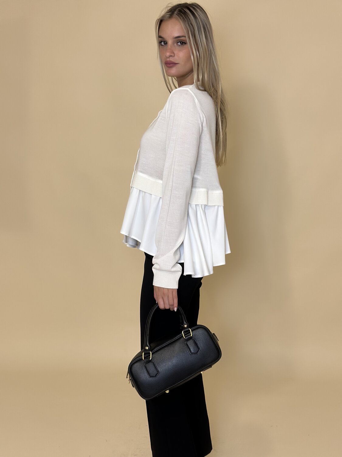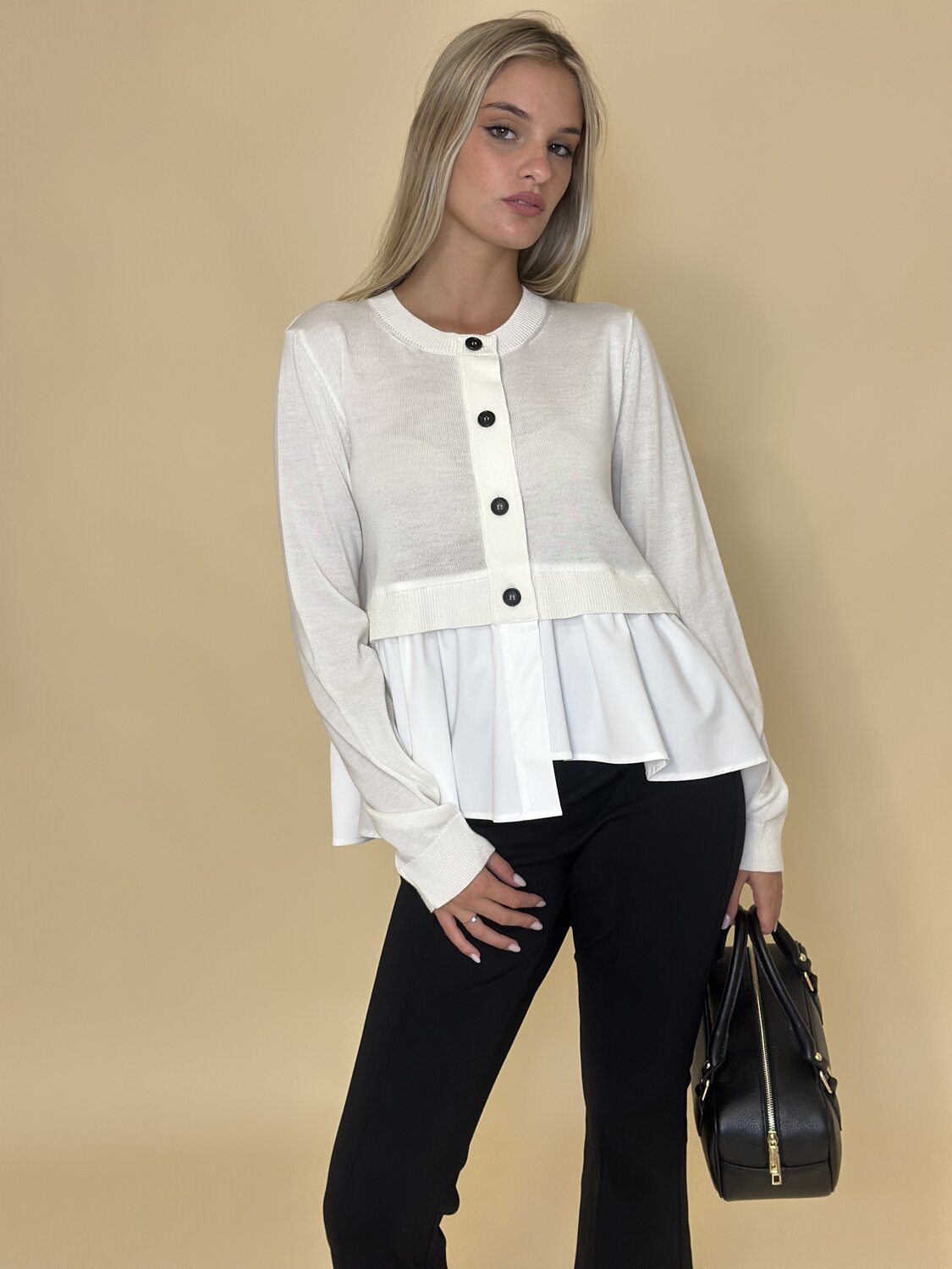 Cardigan panna con volant di Meimei J. Cardigan a maniche lunghe con scollo rotondo e abbottonatura frontale con bottoni neri a contrasto. Dettaglio di volant in tessuto leggero sul fondo. Vestibilità ampia. Tessuto morbido e sottile. Disponibile nel colore bianco.