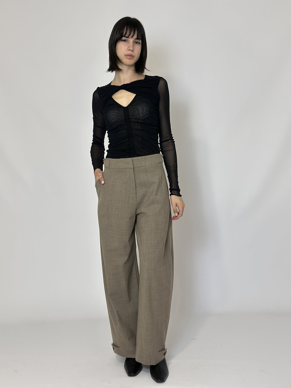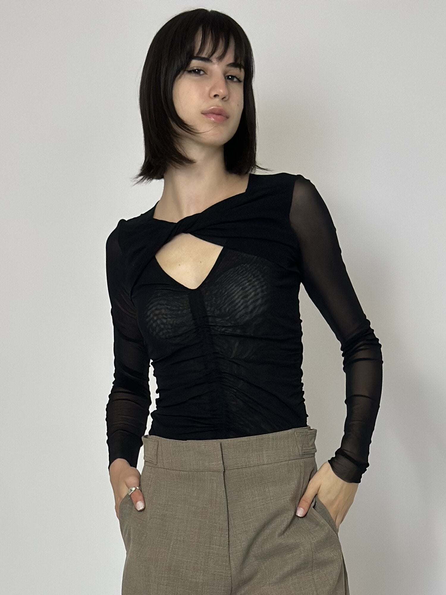 Maglia cut out tulle nero di Meimei J. Top a maniche lunghe con scollo tondo. Dettaglio con arricciature centrali e cut-out. Vestibilità aderente. Materiale in tulle. Disponibile nel colore nero.