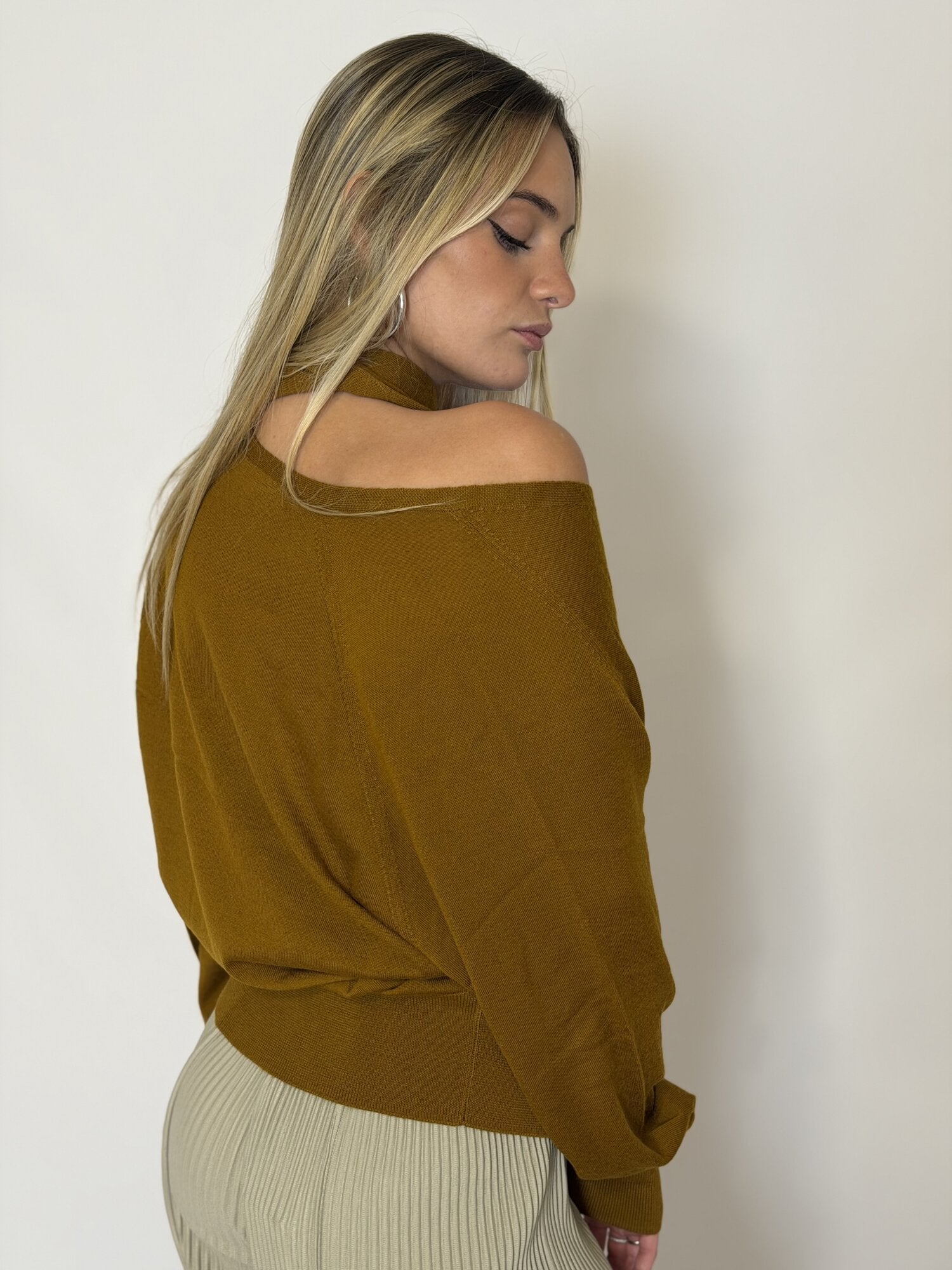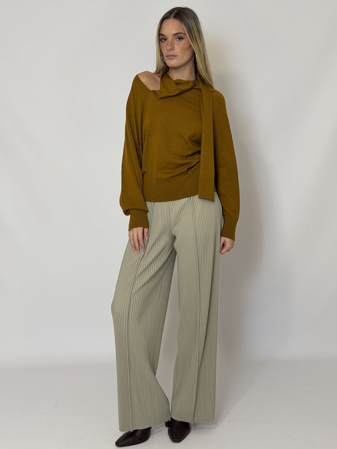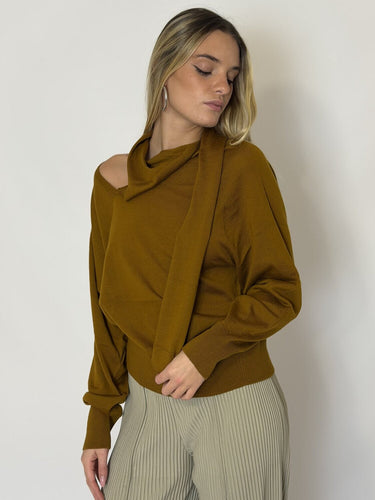 Maglia fusciacca tabacco di Meimei J. Maglia a maniche lunghe dalla vestibilità morbida. Cut out sulla spalla e fusciacca al collo. Disponibile in vinaccio e tabacco.