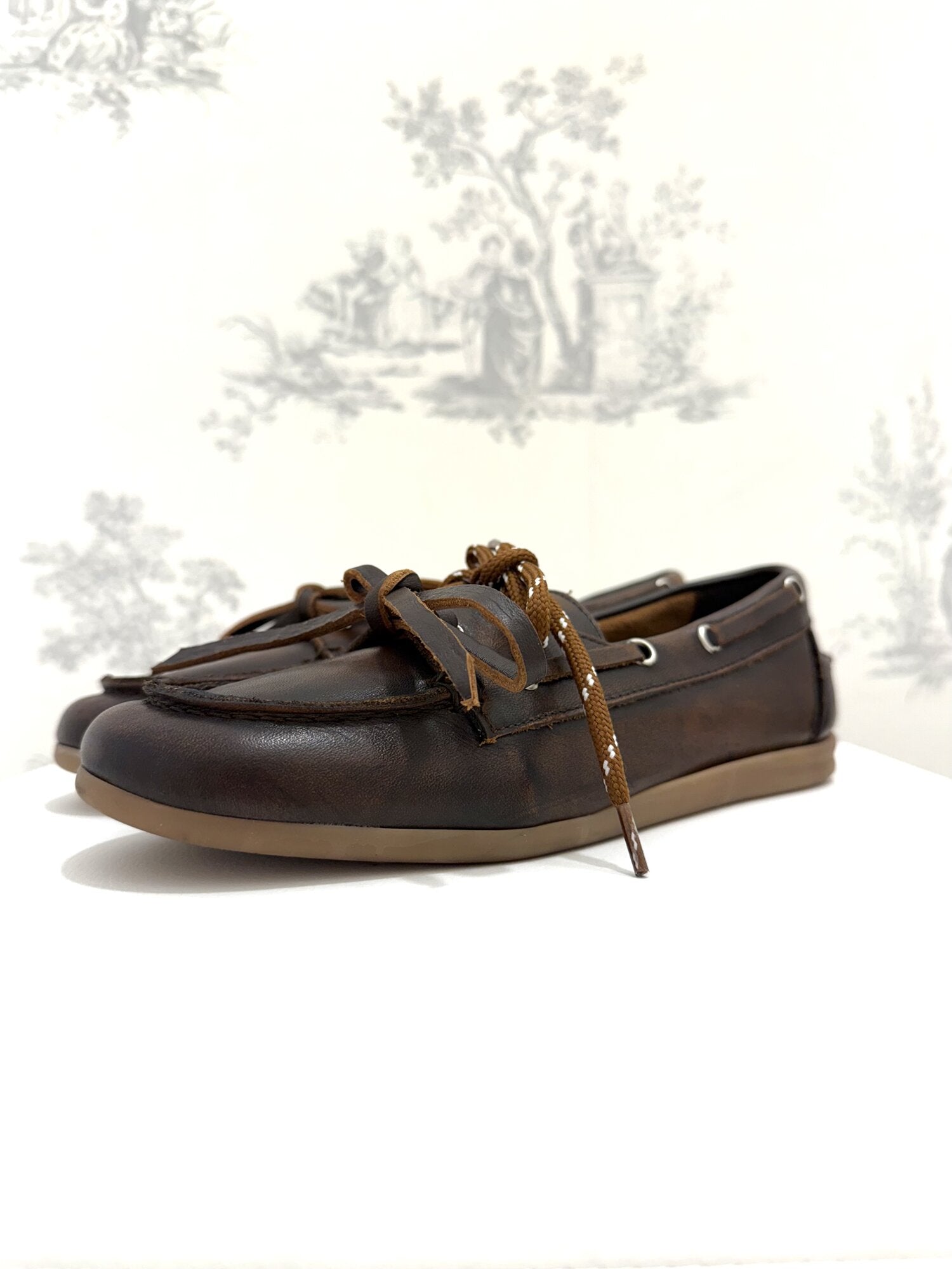 Mocassini da barca pelle invecchiata moro di Ovyé. Mocassini da barca in pelle invecchiata con cuciture a vista. Suola in gomma. Vestibilità morbida e confortevole. Disponibili nel colore moro con lacci bordeaux.