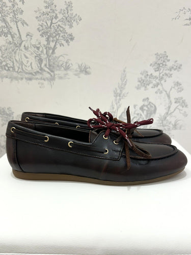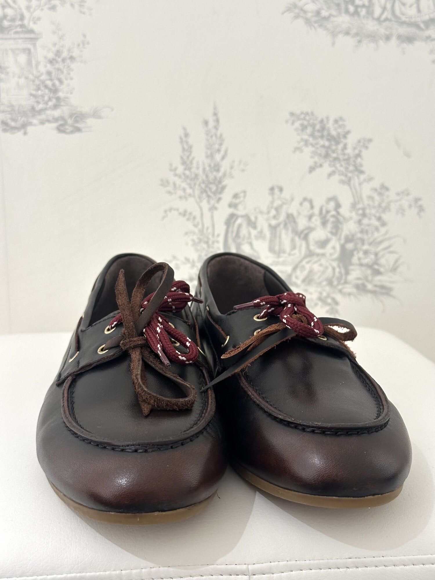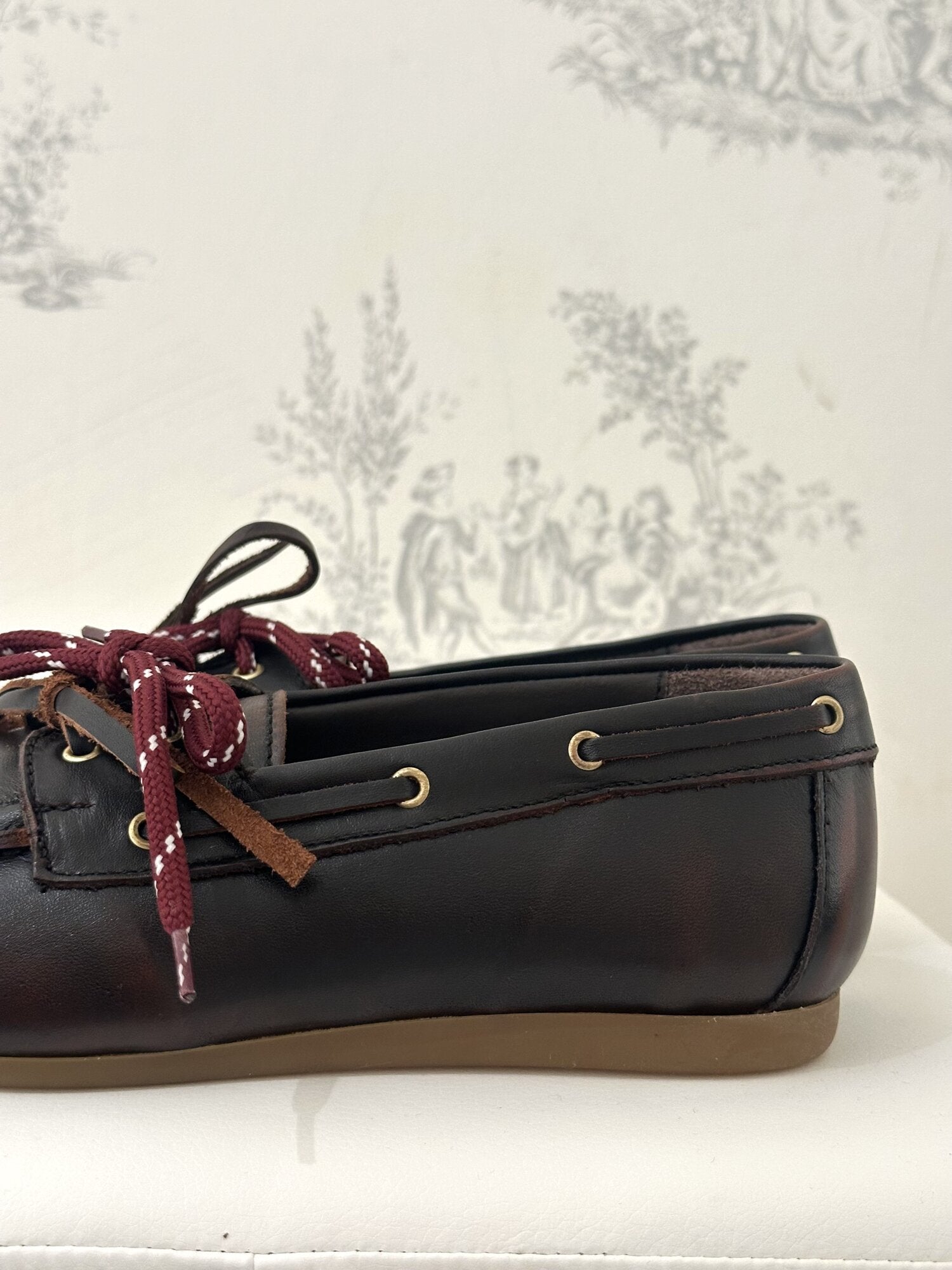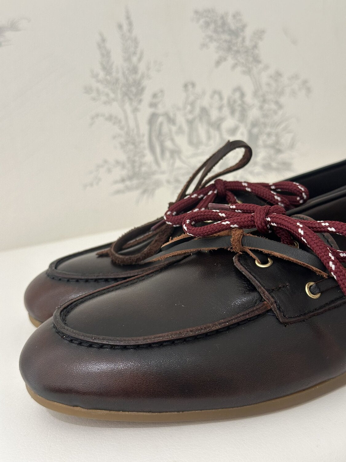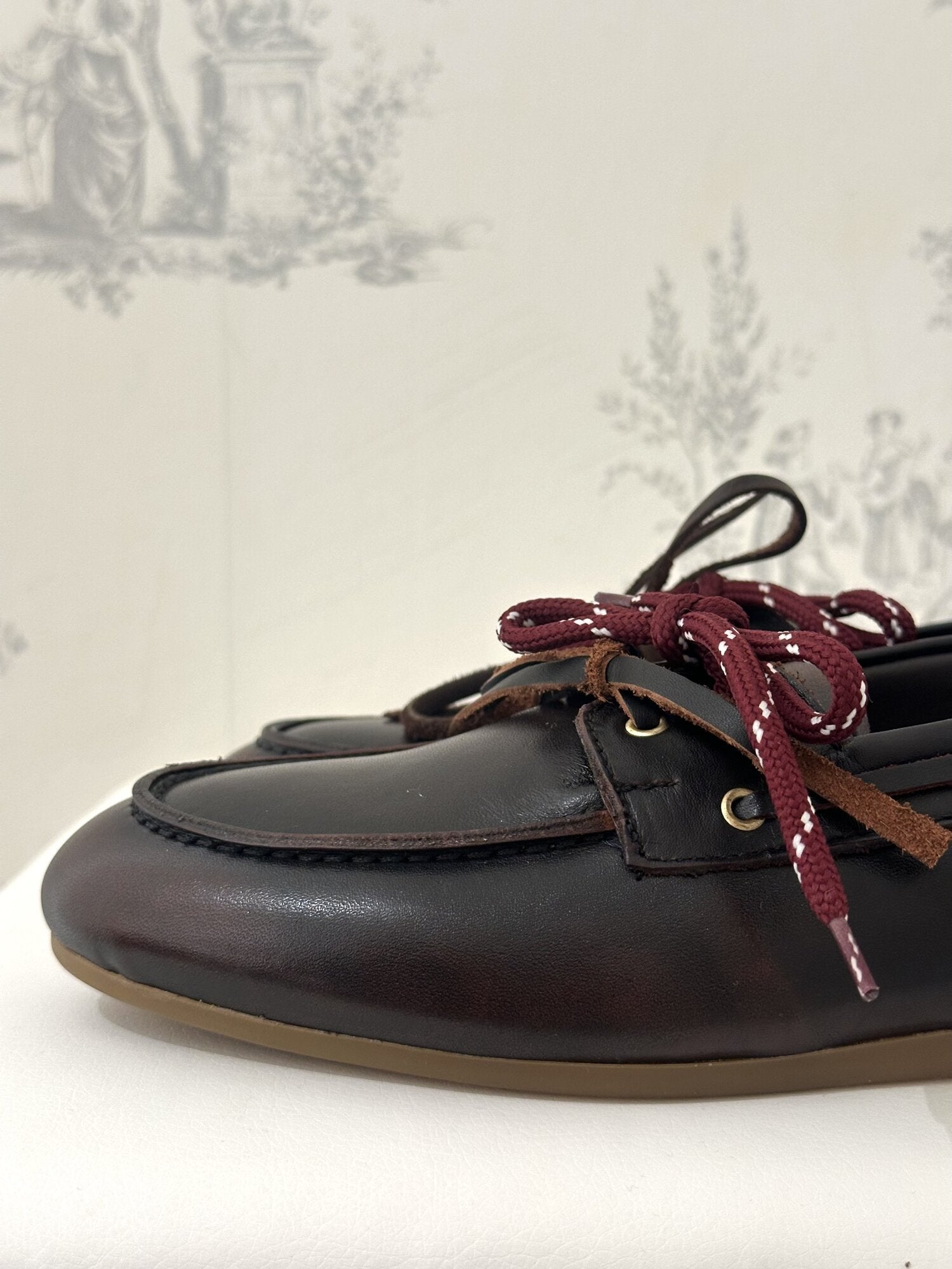 Mocassino Basso in pelle Moro di Ovyé. Mocassino basso in pelle con lacci bicolor. Punta tonda. Fondo in gomma. Disponibile in moro.