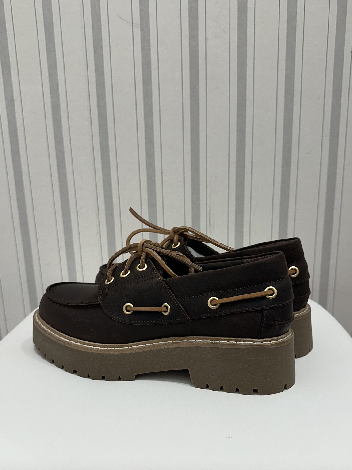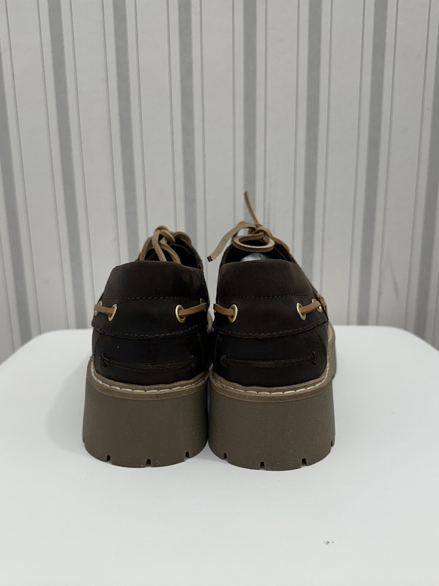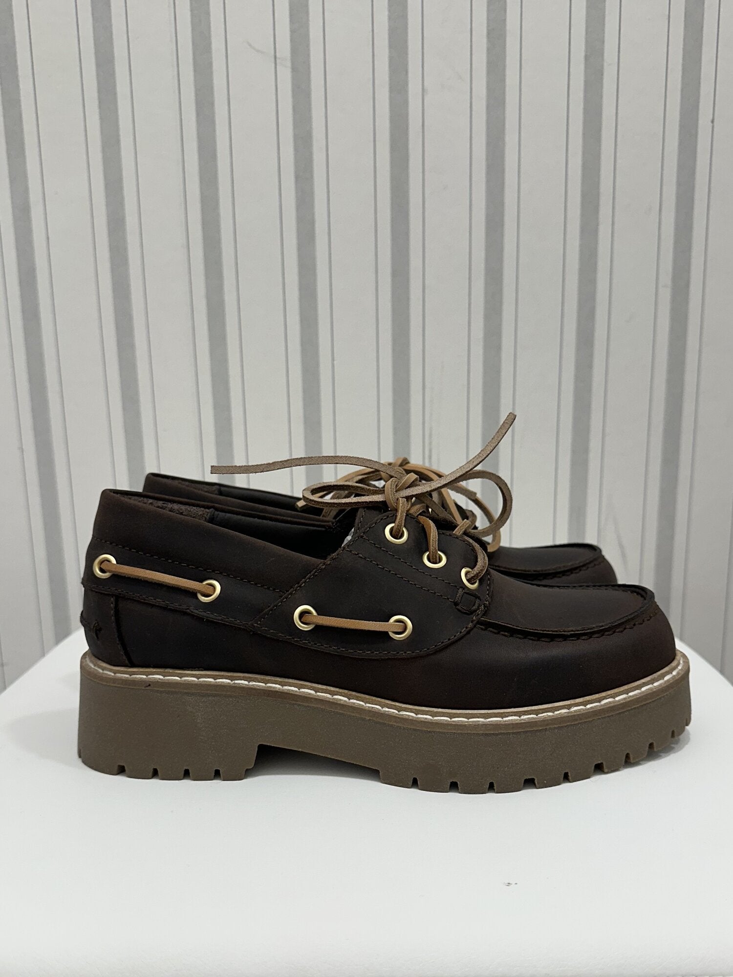 Mocassino da barca platform moro di Ovyè. Mocassino in pelle ingrassata con suola platform e lacci da annodare. Lacci decorativi ai lati. Altezza platform 4 cm. Disponibile in moro.