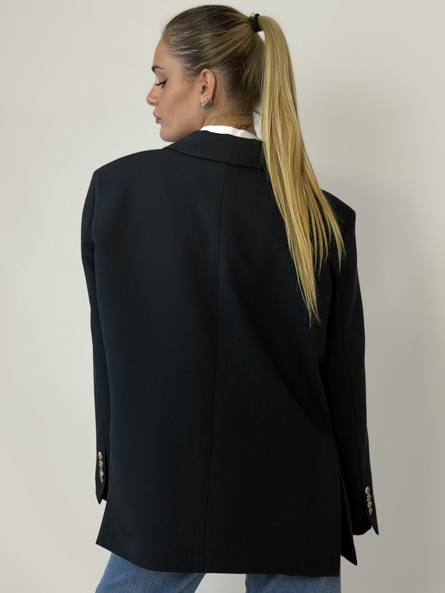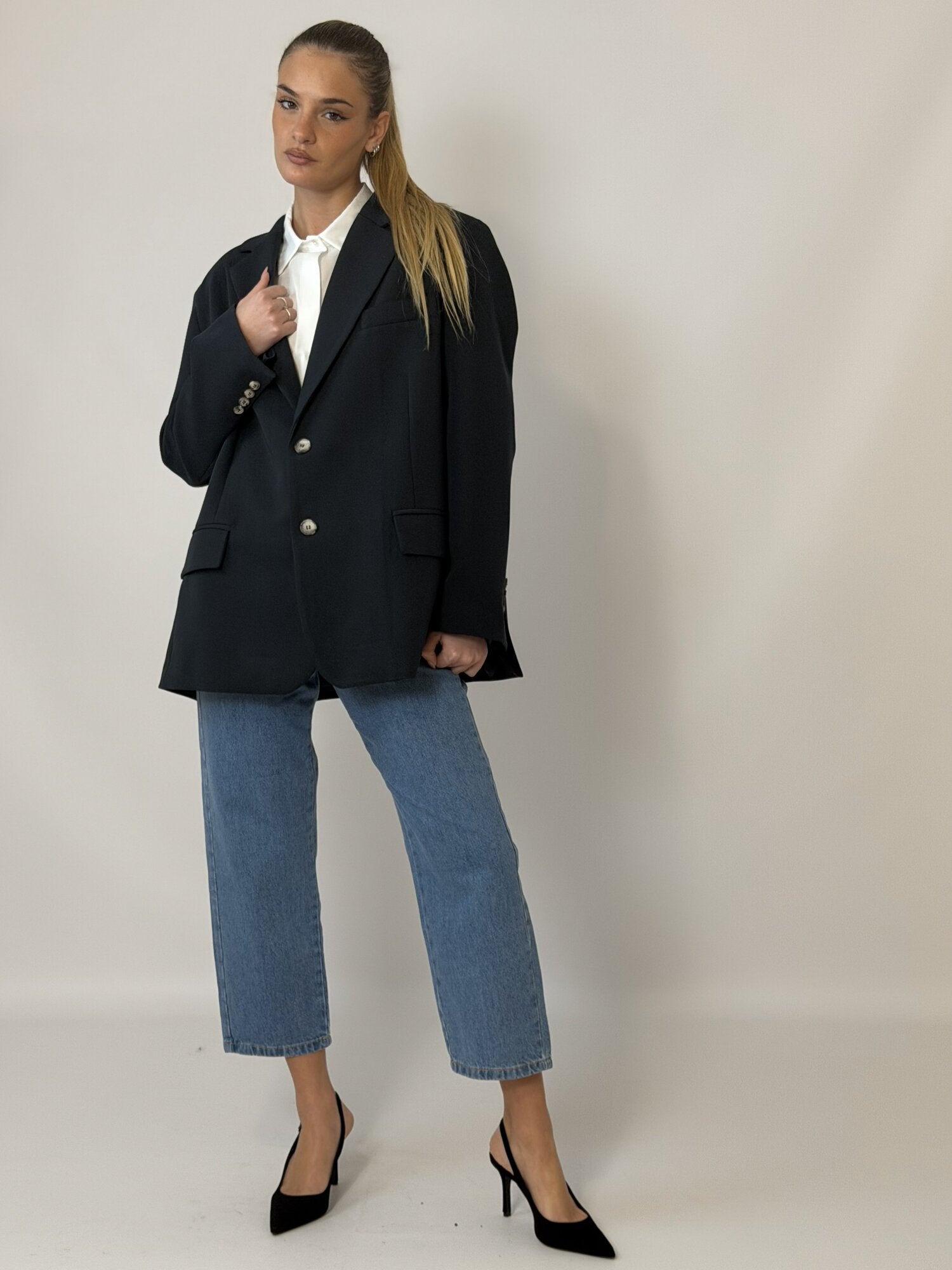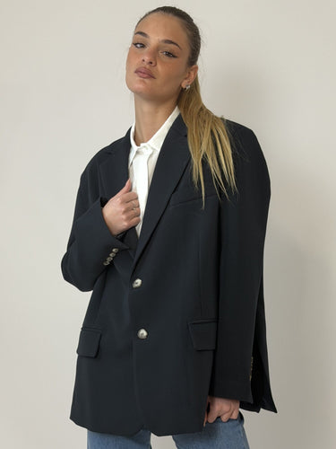 Giacca Chiusura Asimmetrica Blu Notte di Vicolo. Caratterizzata da un taglio oversize di ispirazione "boyfriend", questa giacca offre linee squadrate e ampie che conferiscono un'aria moderna. Il capo presenta una doppia chiusura monopetto con due bottoni a contrasto o chiusura asimmetrica che la rende più avvitata. Arricchita da classici rever a lancia e tasche laterali con patta. Le maniche sono rifinite con una serie di bottoni ornamentali sui polsi. Il retro presenta spacchi laterali che favorisce la libertà di movimento. Foderata. Disponibile in blu notte.