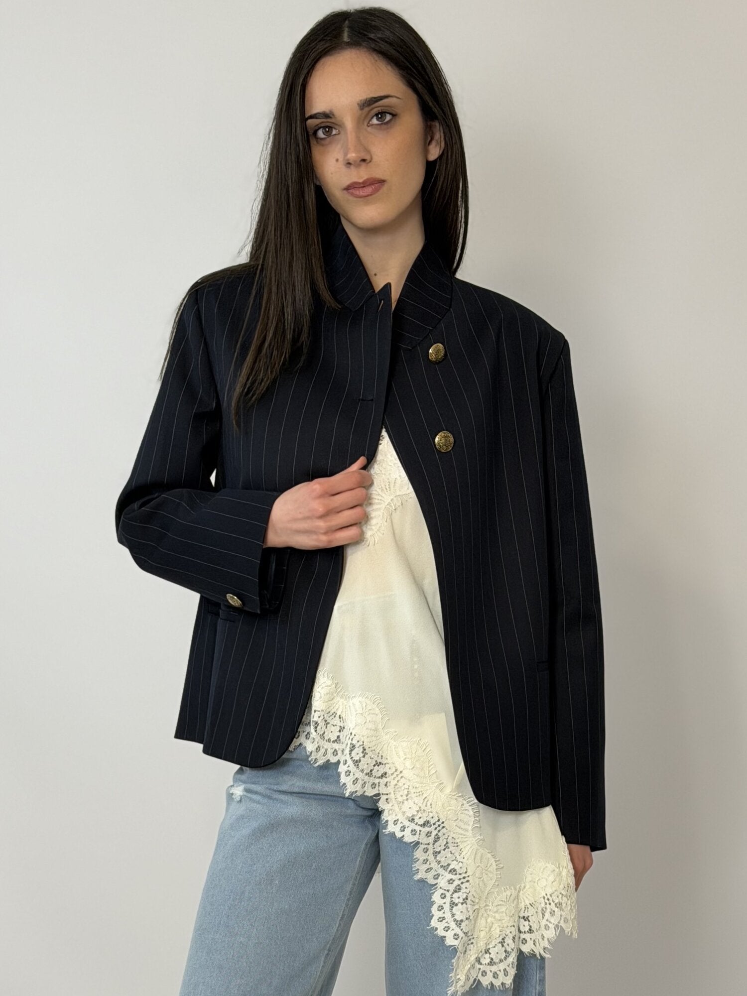 Giacca gessata blu notte a due bottoni dal taglio strutturato e raffinato. Le righe sottili verticali slanciano la figura, mentre i bottoni dorati aggiungono un accento elegante e deciso. Un capo versatile, perfetto per dare carattere sia a look formali sia a combinazioni più casual e moderne.