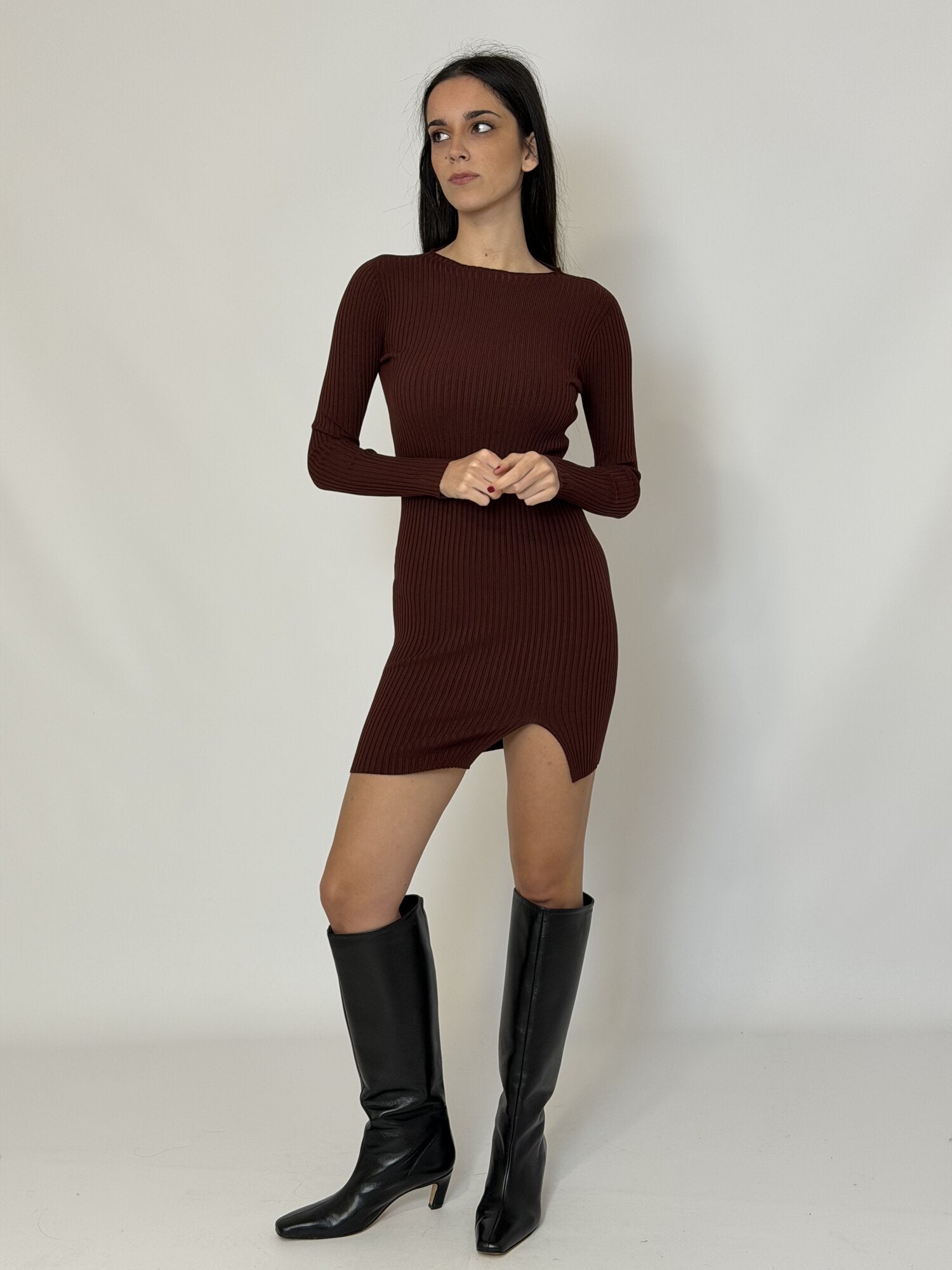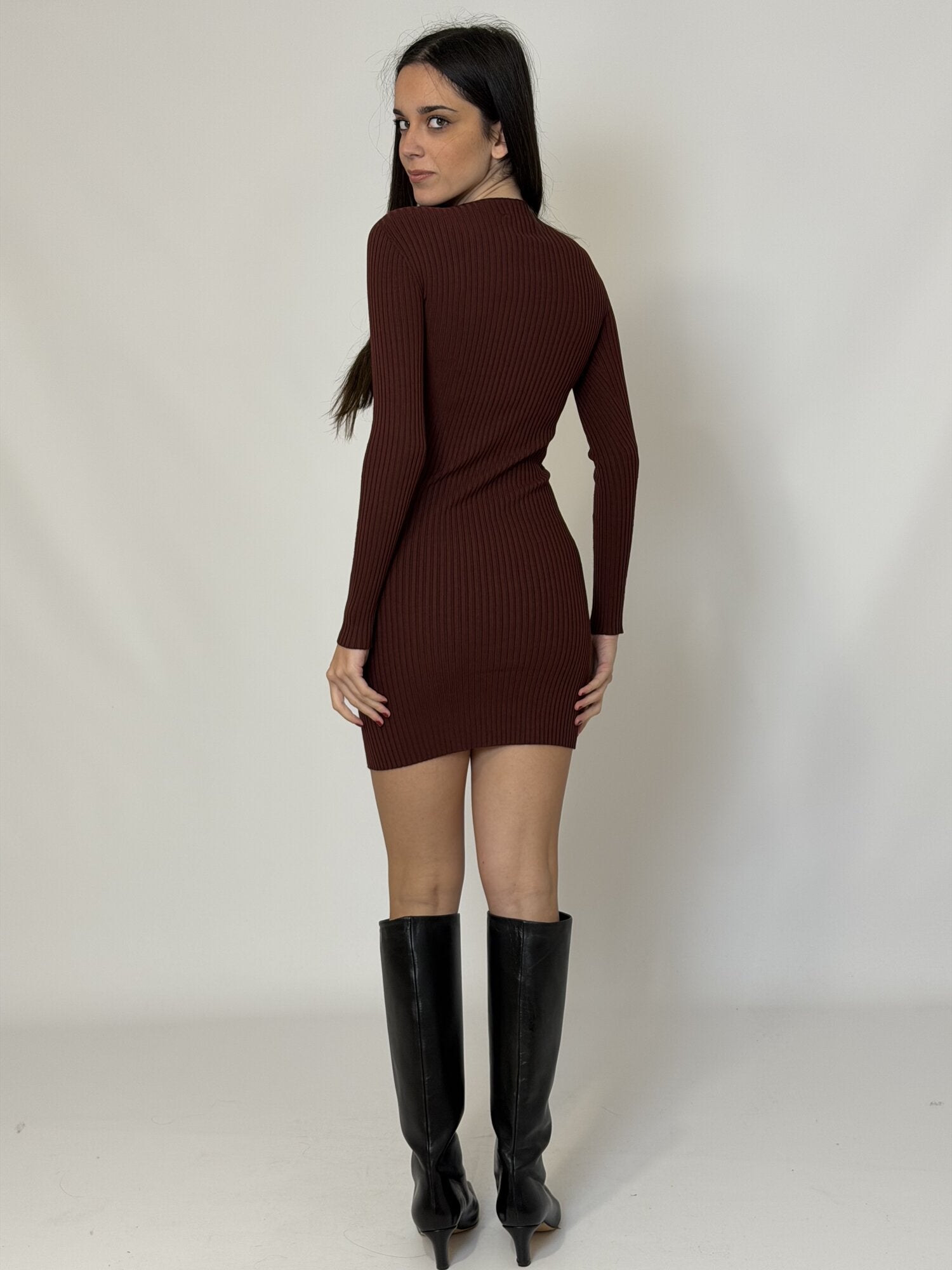 Abito corto in maglia a coste bordeaux di Vicolo. Abito in maglia a coste con vestibilità aderente (bodycon) e lunghezza mini/corta. Maniche lunghe e un piccolo spacco laterale. Disponibile in nero, moro e bordeaux.