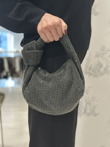 Borsa Strass Nodo Nera. Borsa a mano con strass e manico con nodo. Chiusura con cerniera. Interno in tessuto. Inclusa tracolla a catena sottile. Disponibile in oro, nero, argento e argento-nero.