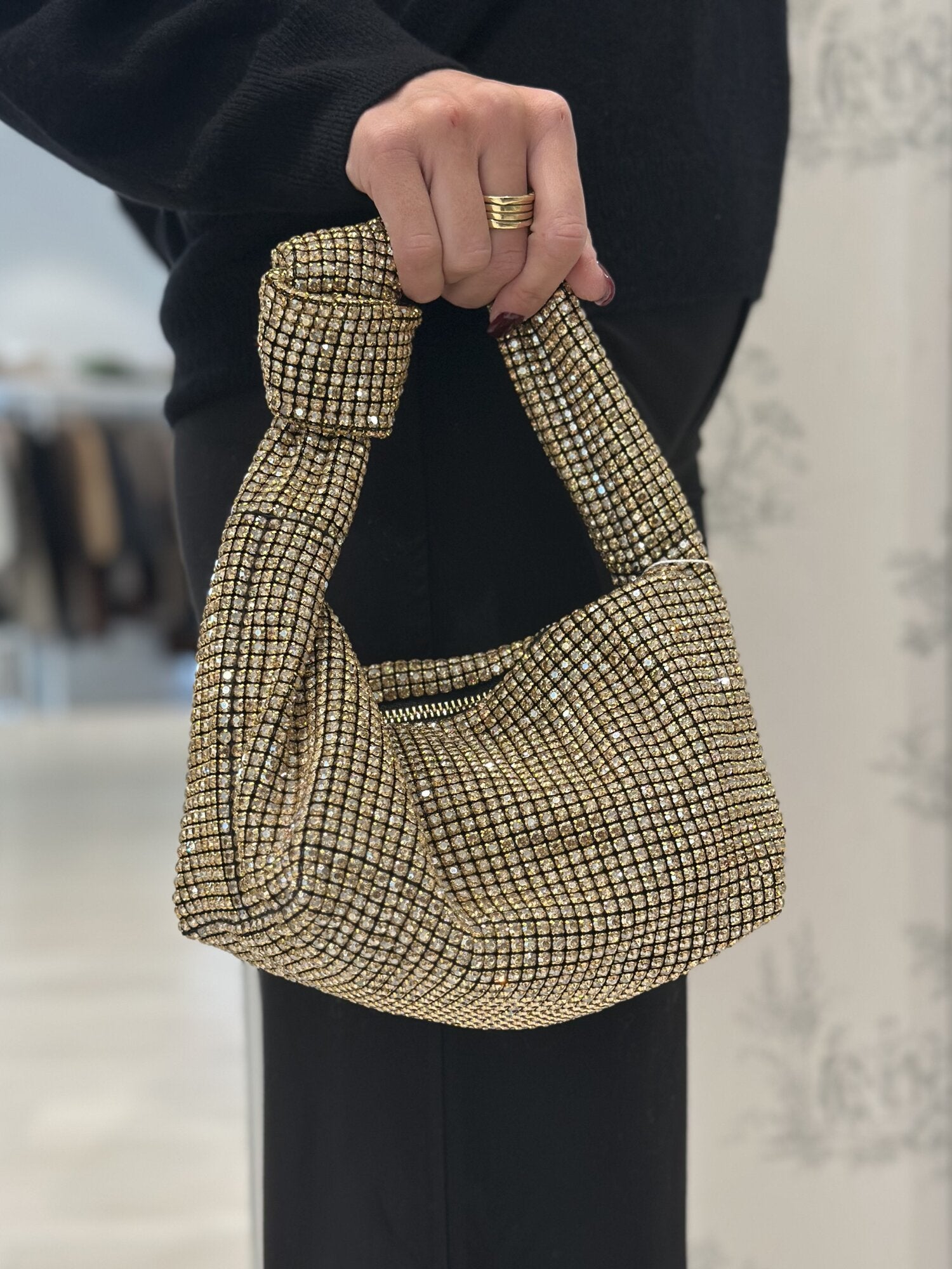Borsa Strass Nodo Oro. Borsa a mano con strass e manico con nodo. Chiusura con cerniera. Interno in tessuto. Inclusa tracolla a catena sottile. Disponibile in oro, nero, argento e argento-nero.