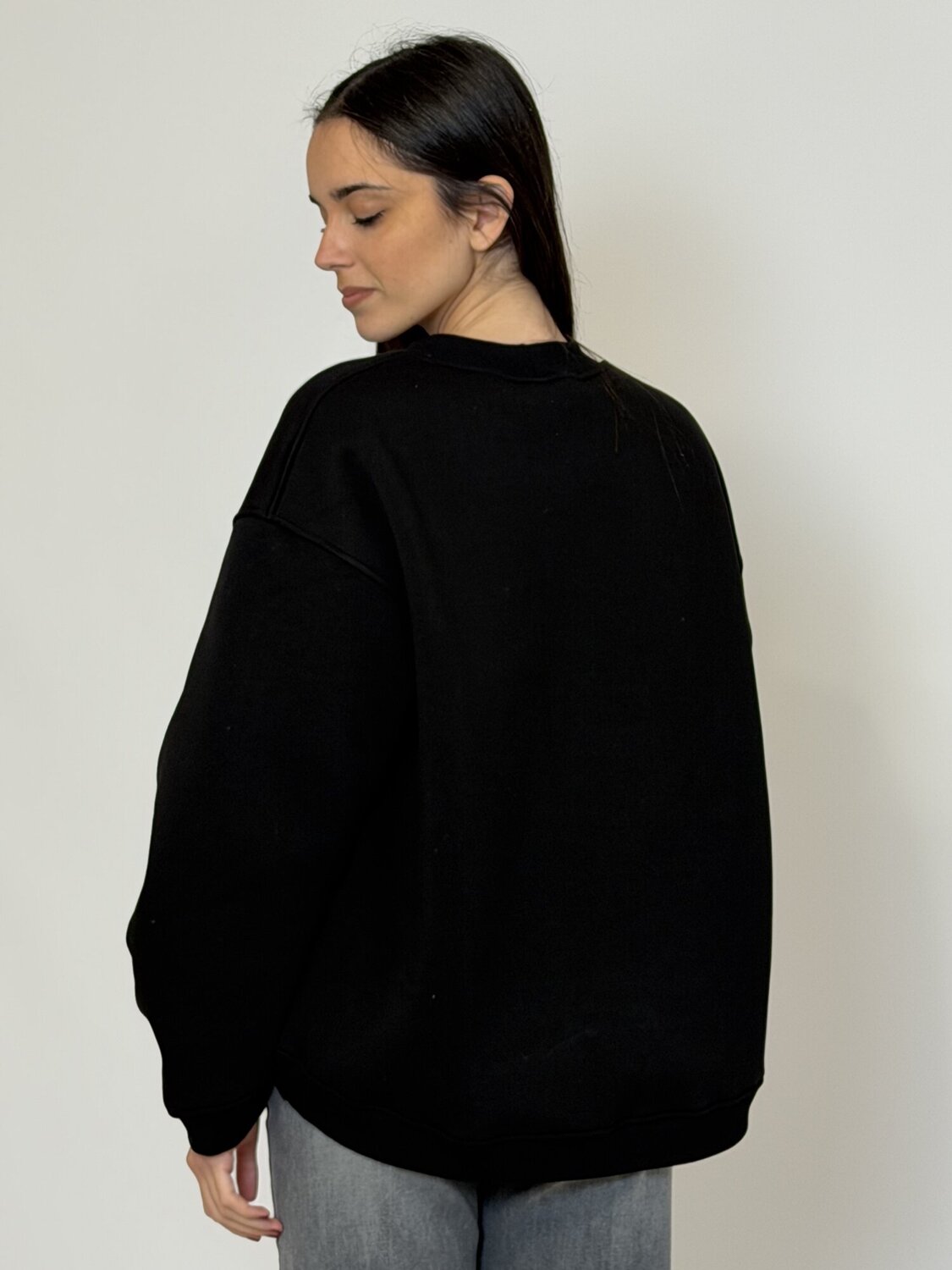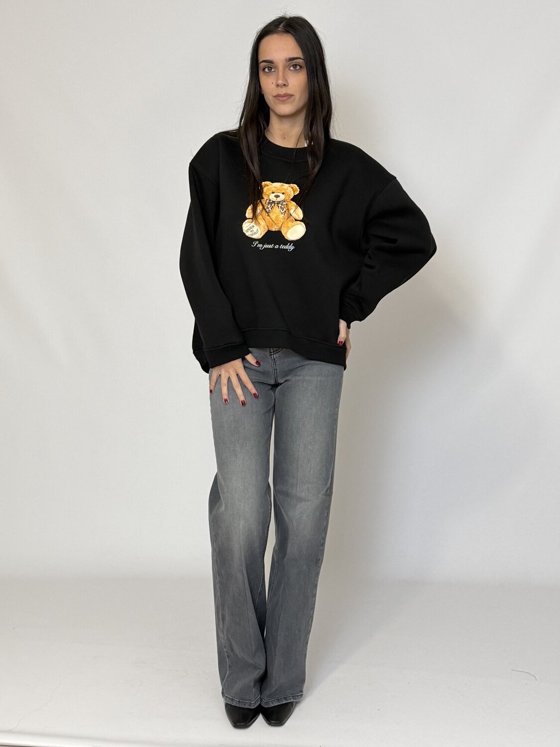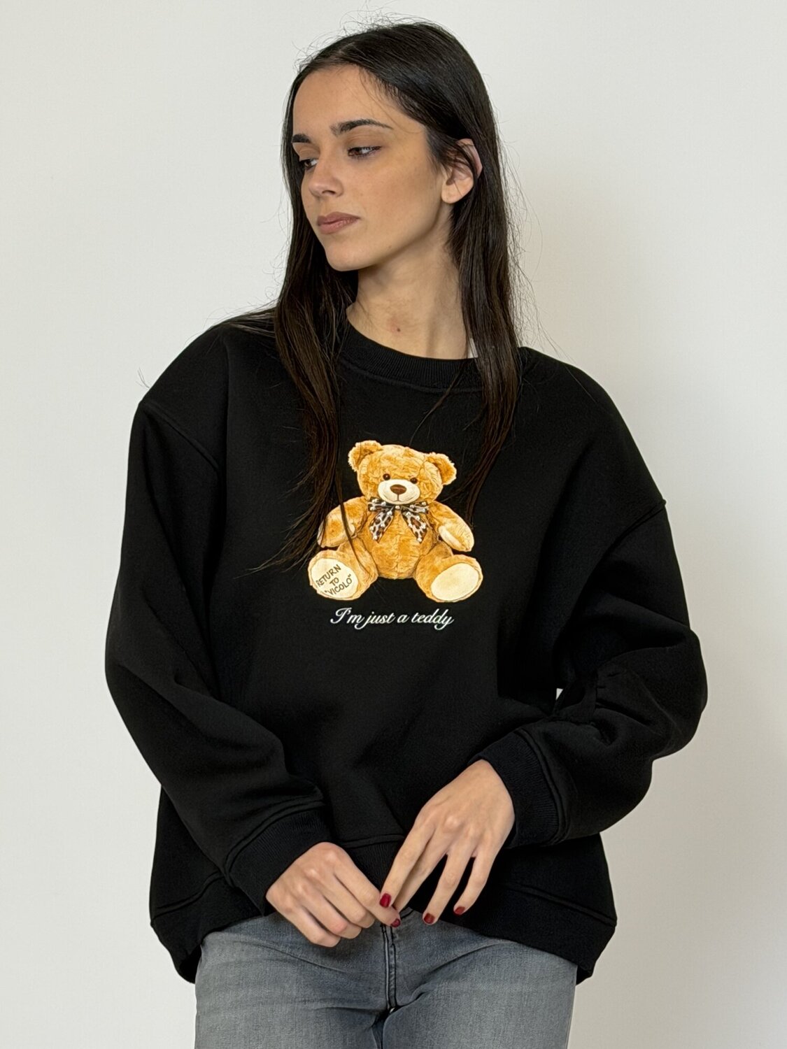 Felpa Girocollo Orsetto nera di Vicolo. Felpa girocollo oversize color nero con stampa Teddy Bear di Vicolo. Felpa in tessuto felpato con vestibilità oversize e girocollo. Stampa centrale orsetto con papillon leopardato e scritta "I'm just a teddy". Disponibile nel colore nero e marrone.
