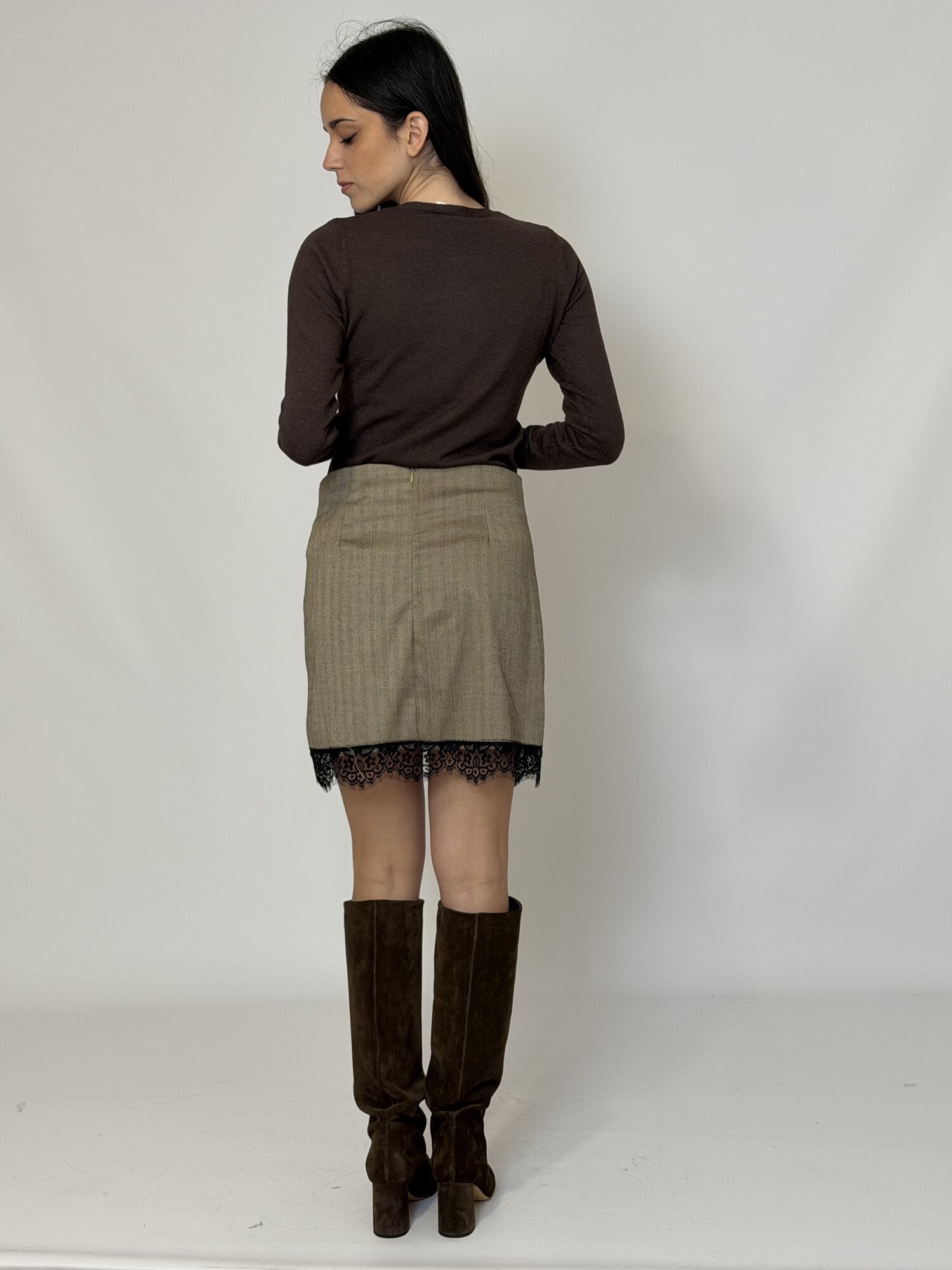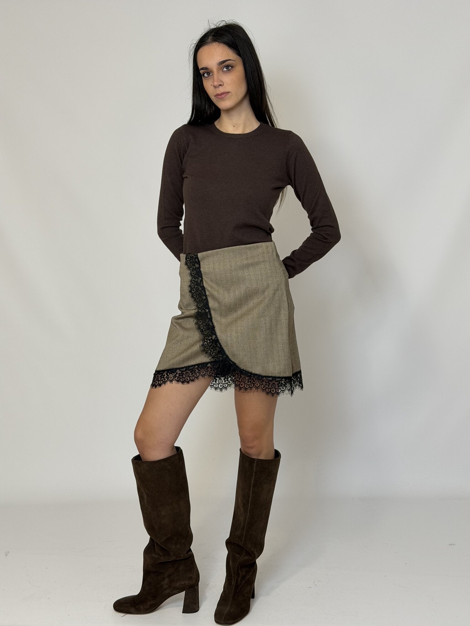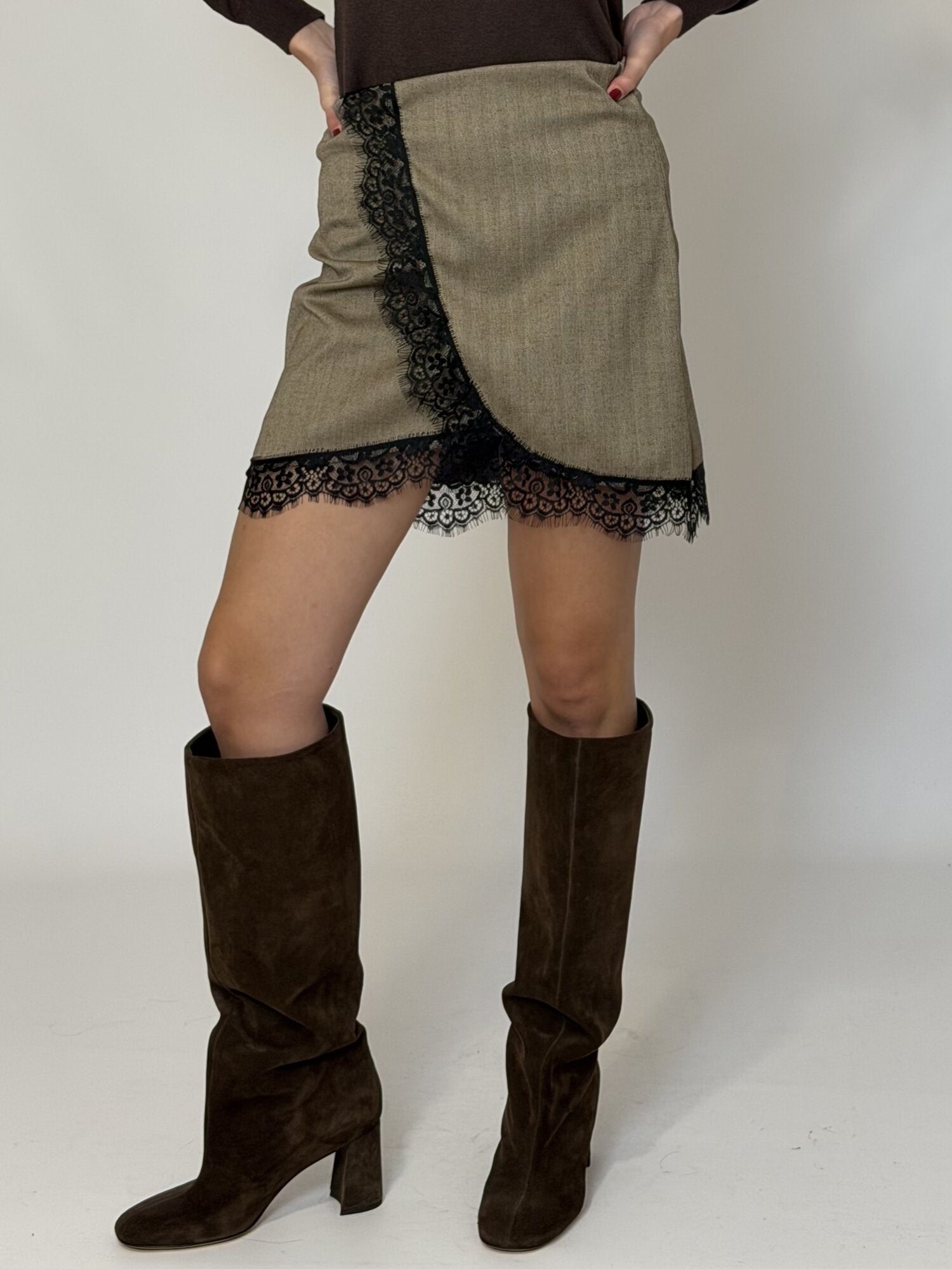 Minigonna a pannelli asimmetrica in tessuto tweed/spigato color cammello con pizzo di Haveone. Minigonna con taglio a portafoglio asimmetrico e lunghezza corta (mini). Tessuto tweed o spigato nei toni del cammello/kaki. Bordo in pizzo nero che decora l'orlo e la chiusura a portafoglio.