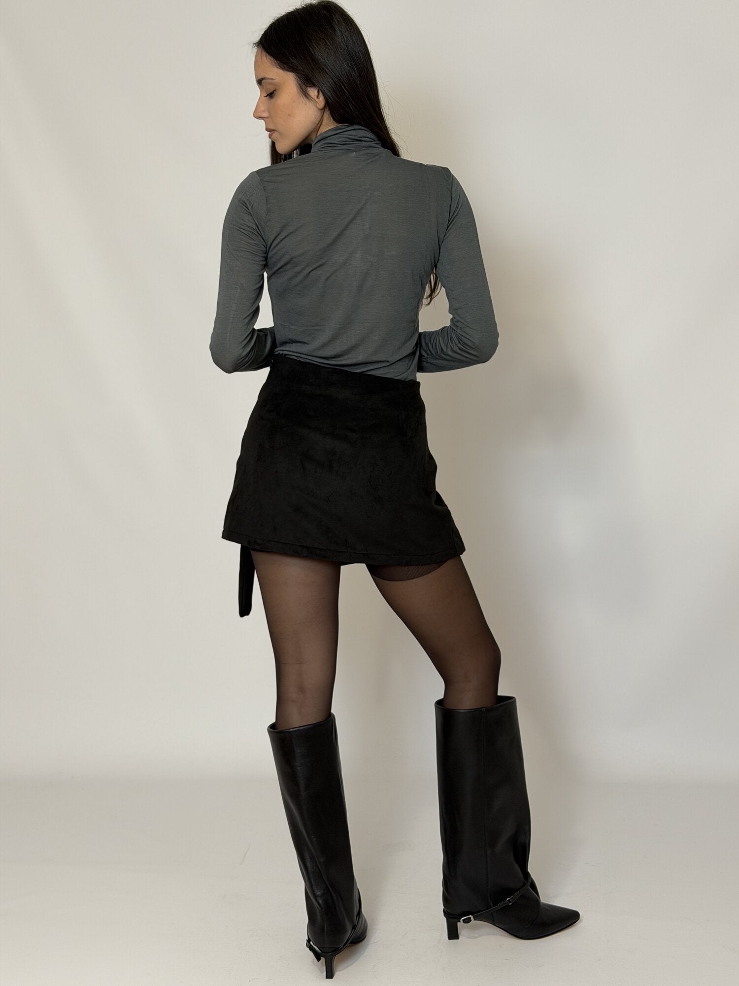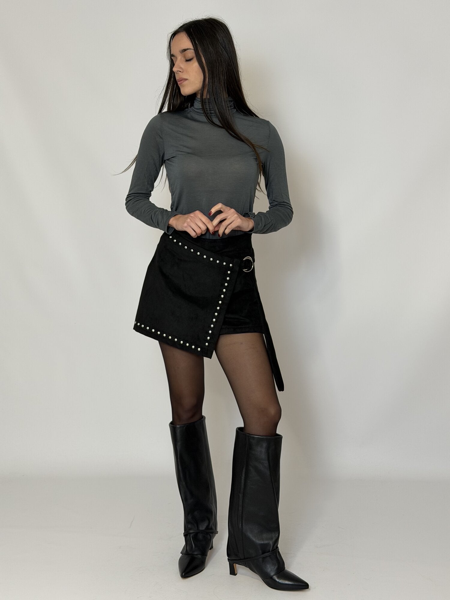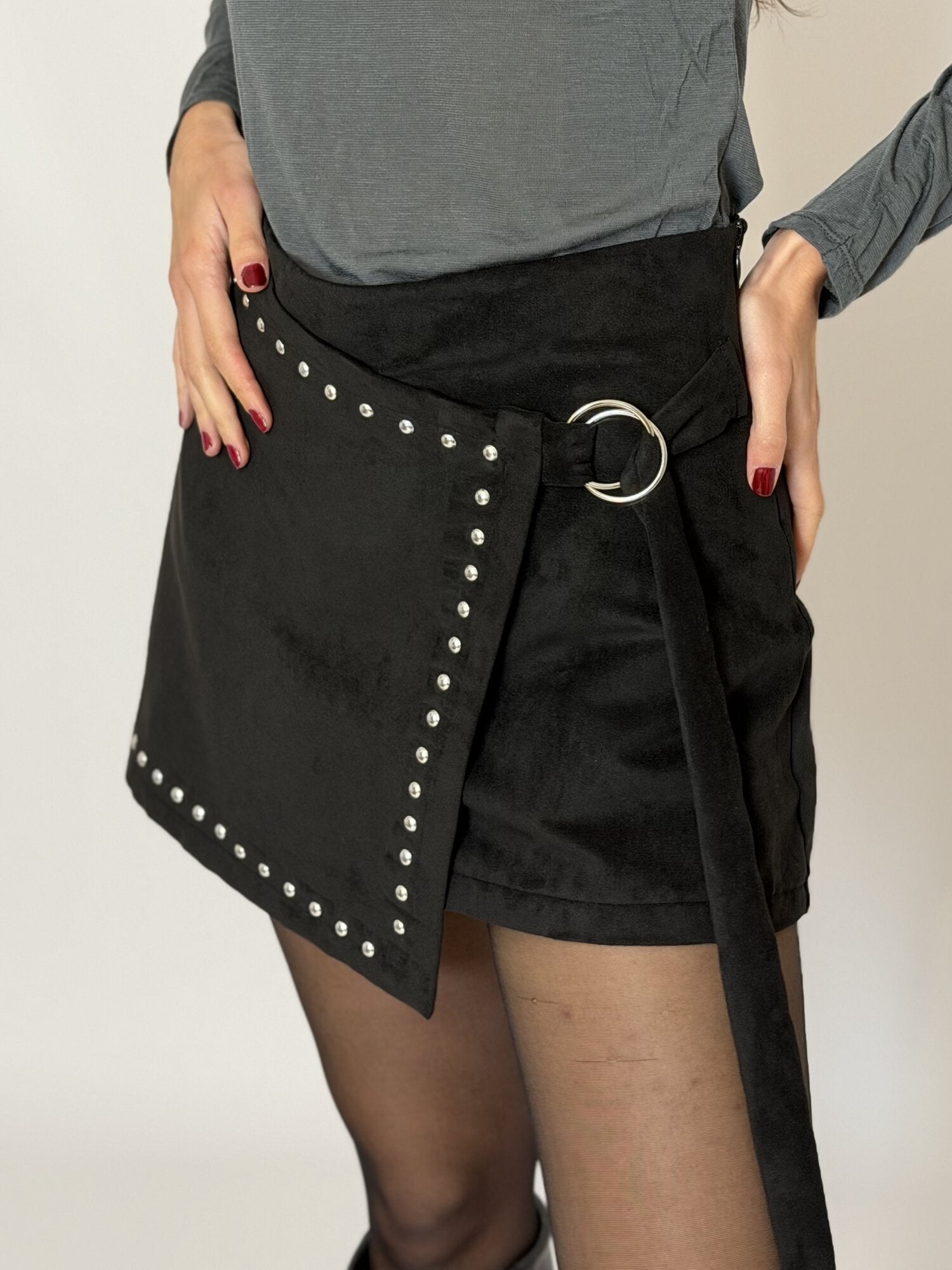 Minigonna a portafoglio borchiata in ecopelle scamosciata nero di Haveone. Minigonna in ecopelle scamosciata. Taglio a portafoglio asimmetrico. Dettaglio distintivo di borchie metalliche che decorano il bordo frontale. Presenta una cintura in suede con fibbia ad anello. Disponibile nel colore nero.