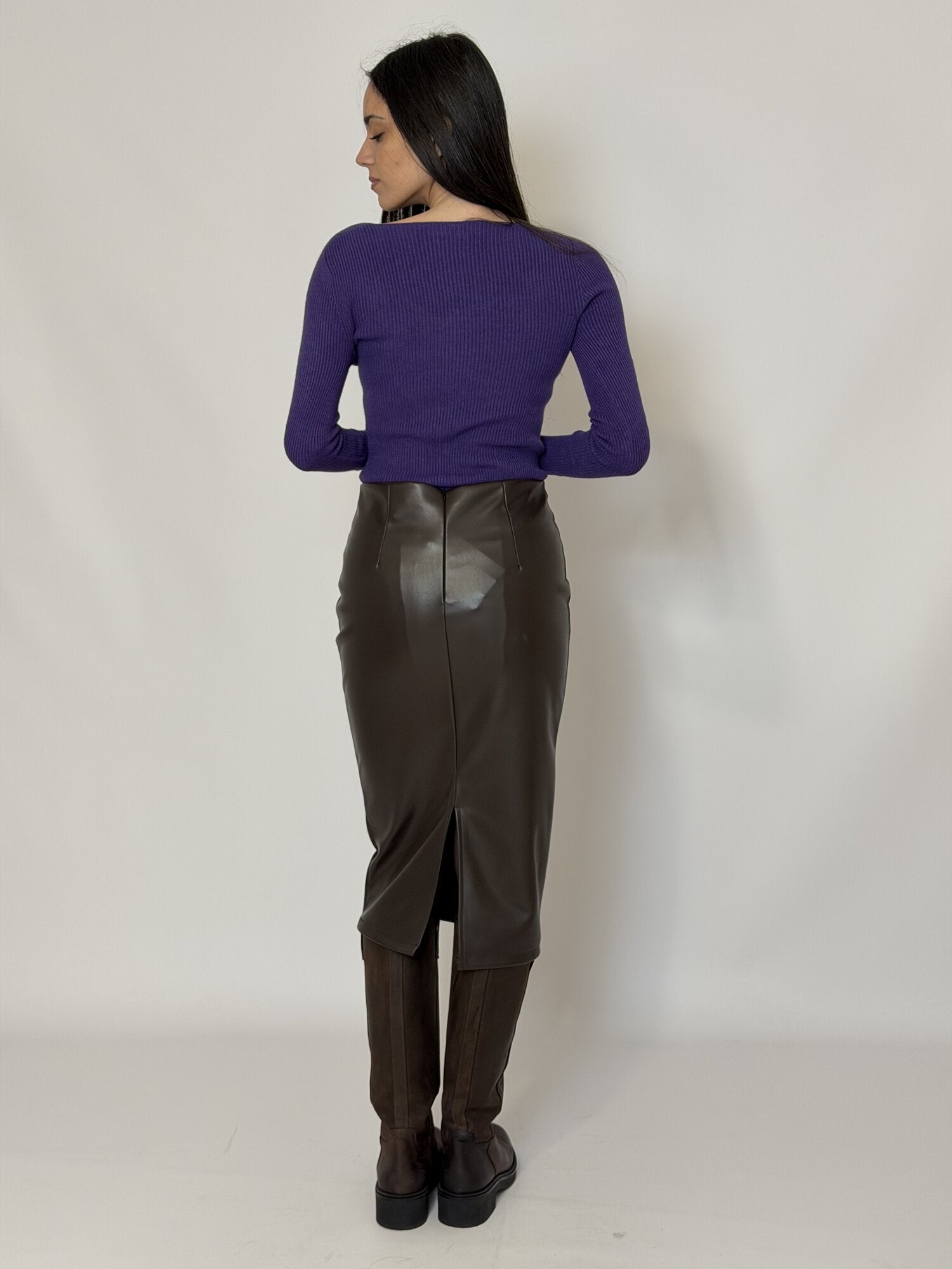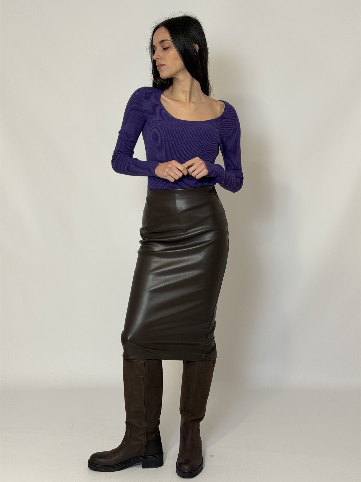 Gonna longuette a tubino in ecopelle moro di Haveone. Gonna in ecopelle lucida. Vestibilità a tubino (dritta e aderente) con lunghezza midi. Vita alta. Disponibile nel colore bordeaux e moro.