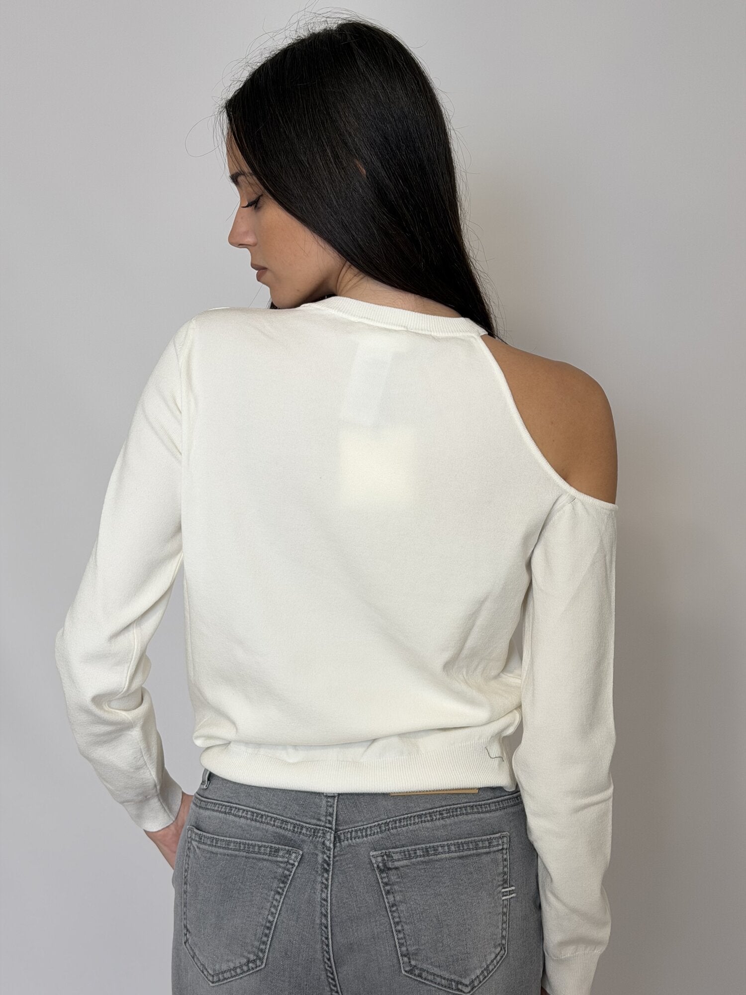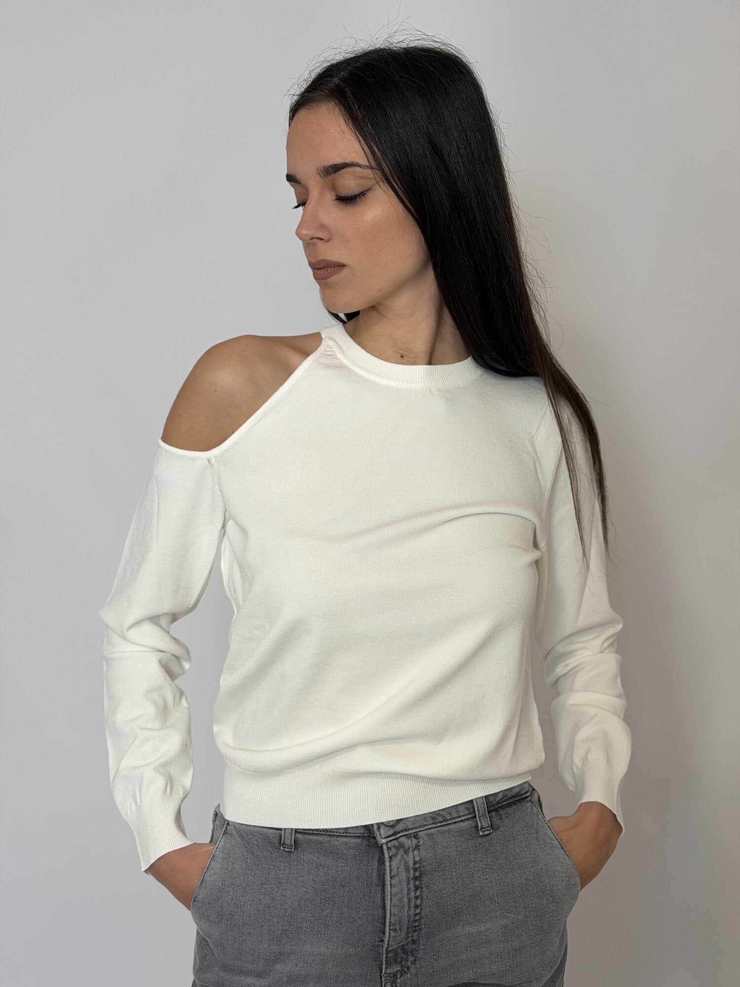 Maglia Oblò Spalla panna di Vicolo. Maglia girocollo a maniche lunghe con dettaglio cut out sulla spalla. Vestibilità aderente. Taglia unica. Disponibile in verde oliva, panna, bordeaux e moro.