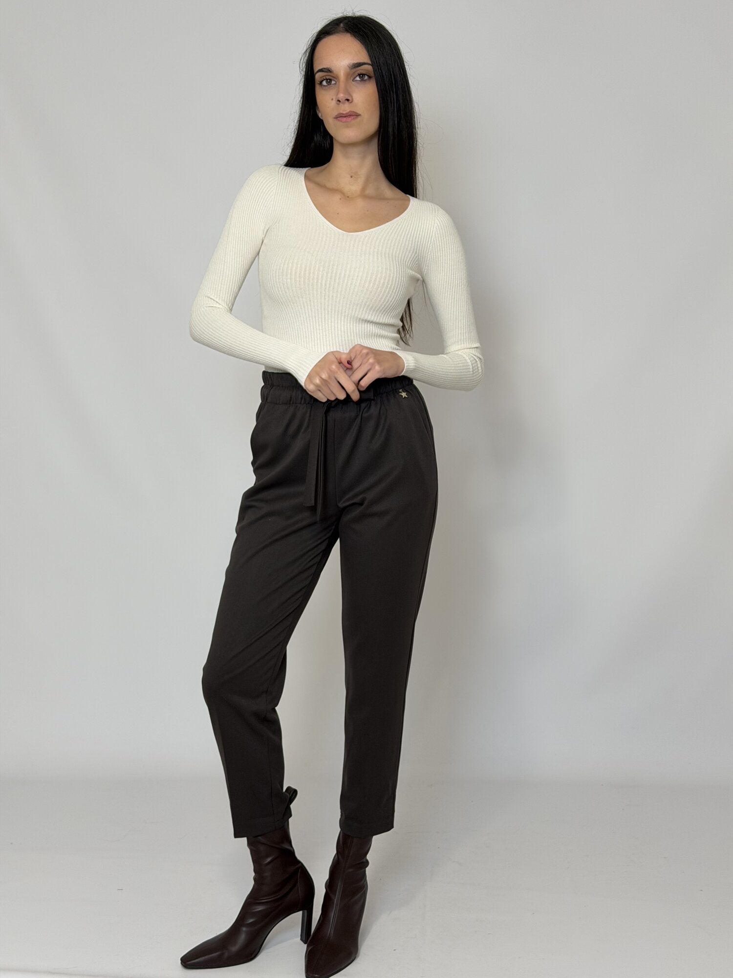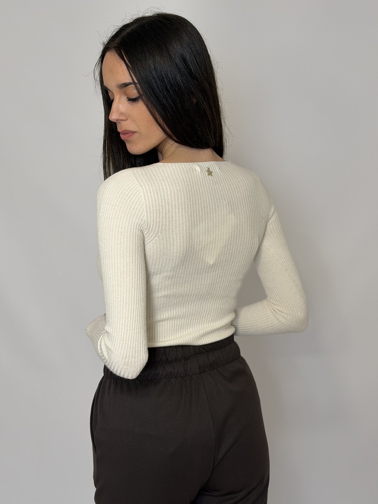 Maglia scollo v costine panna di Souvenir. Vestibilità aderente. Disponibile in nero, moro, panna e bordeaux e grigio.