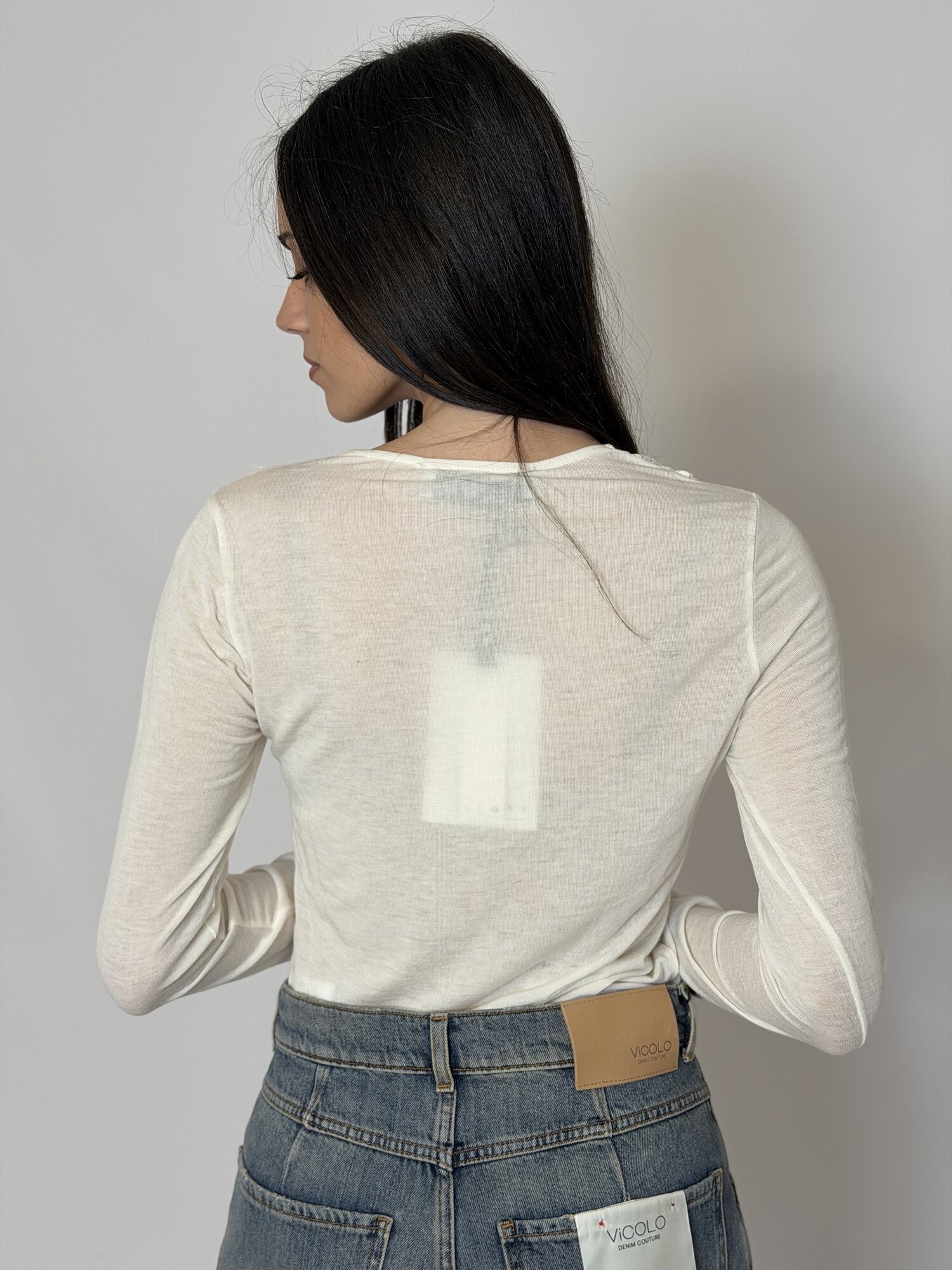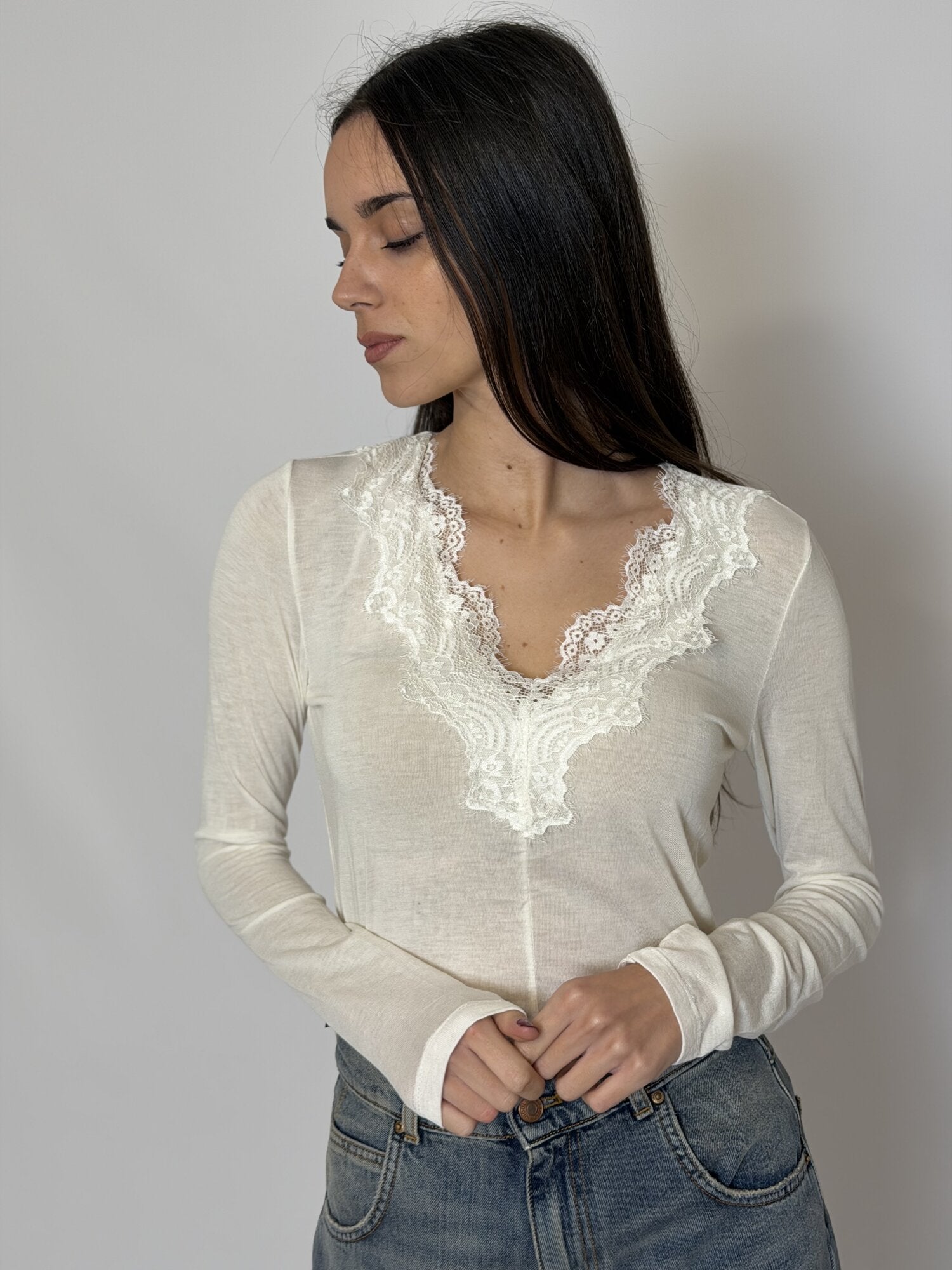 Maglia a maniche lunghe in maglia fine panna con inserto in pizzo V-neck di Haveone. Maglia a maniche lunghe in tessuto leggero e sottile. Presenta uno scollo con un ampio inserto a V in pizzo. Disponibile nel colore panna, nero e moro.