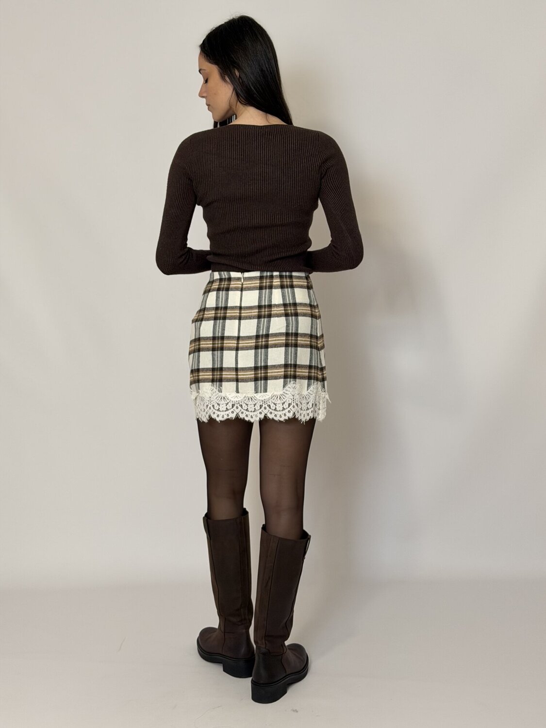 Minigonna a pannelli asimmetrica a fantasia scozzese con inserto in pizzo bianco di Haveone. Minigonna/Gonna-pantalone con taglio asimmetrico e lunghezza corta (mini). Un pannello è in fantasia scozzese/tartan. L'altro pannello presenta inserti e bordi in pizzo bianco che decora il taglio asimmetrico. Disponibile in grigio e moro.