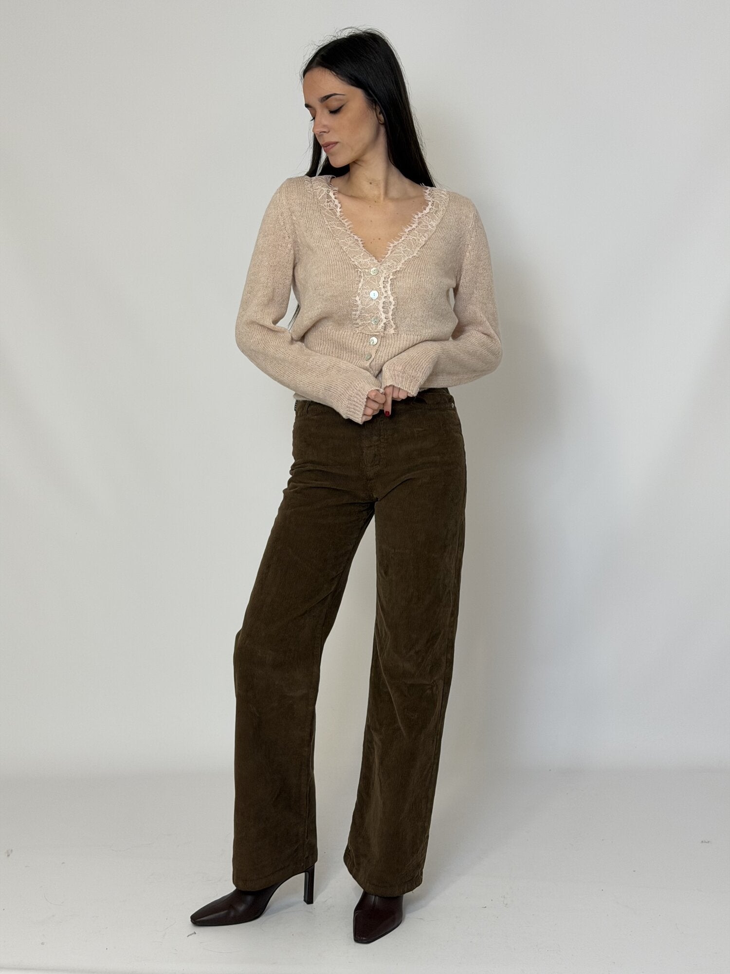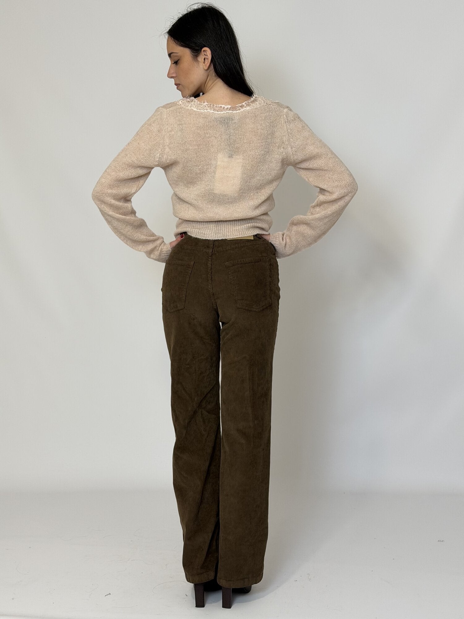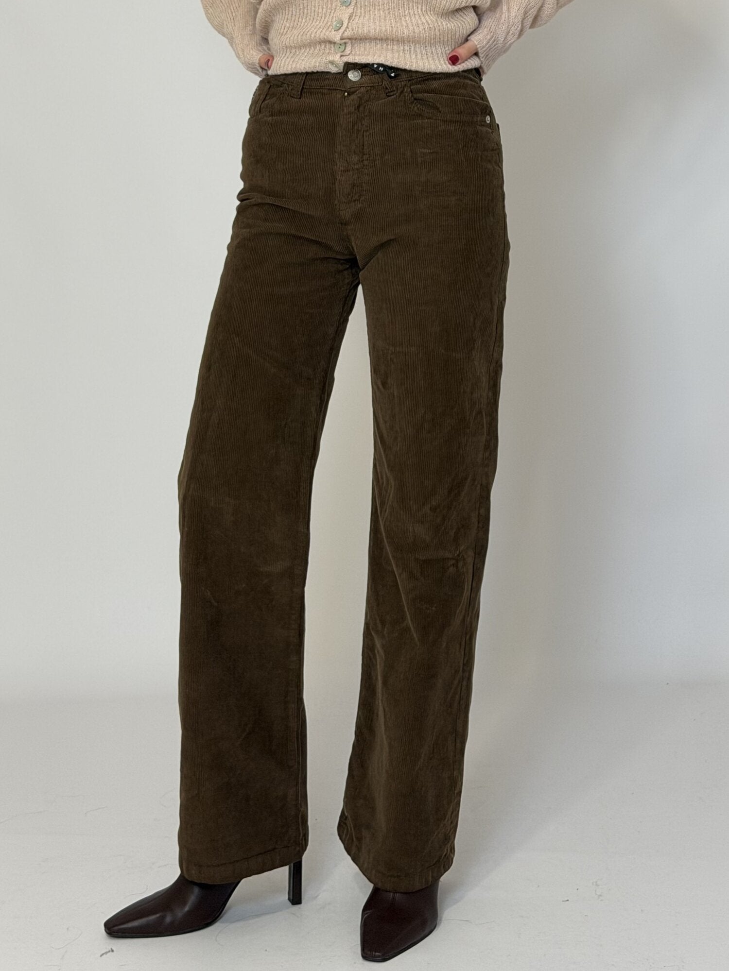 Pantaloni a gamba larga in velluto a coste color marrone cioccolato di Haveone. Pantaloni in velluto a coste. Vestibilità a vita alta con chiusura con bottone e passanti per cintura. Taglio a gamba dritta. Disponibili nel colore marrone cioccolato e burro.