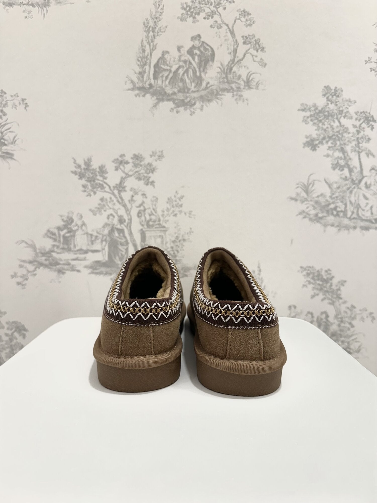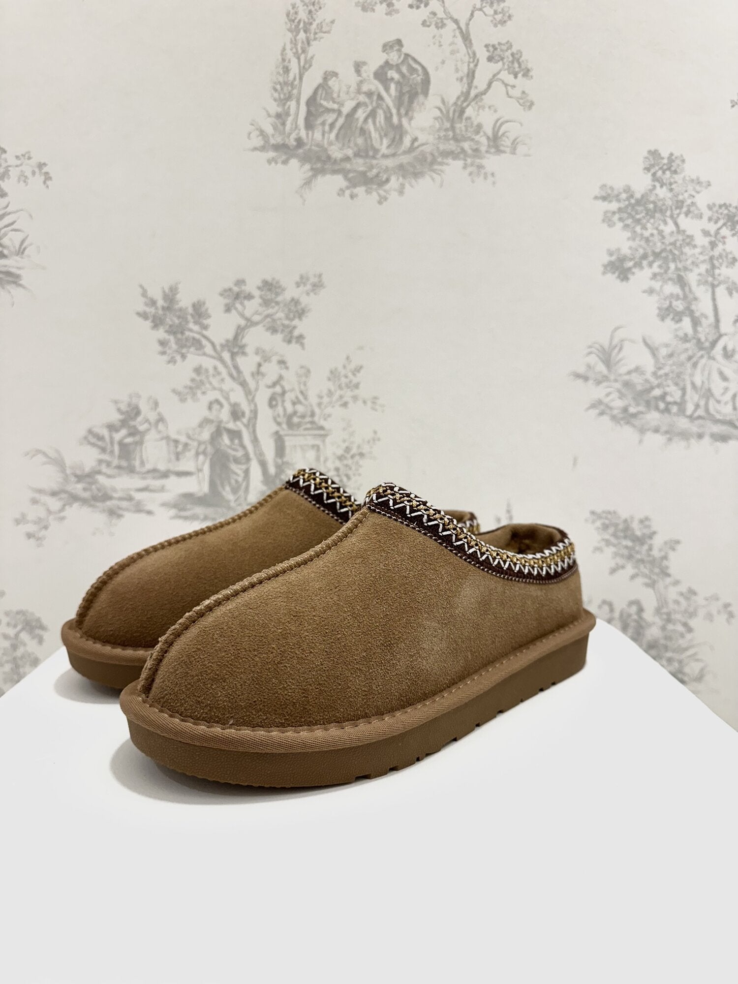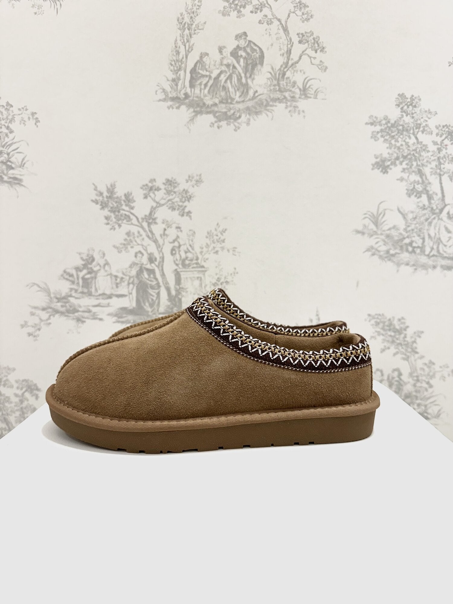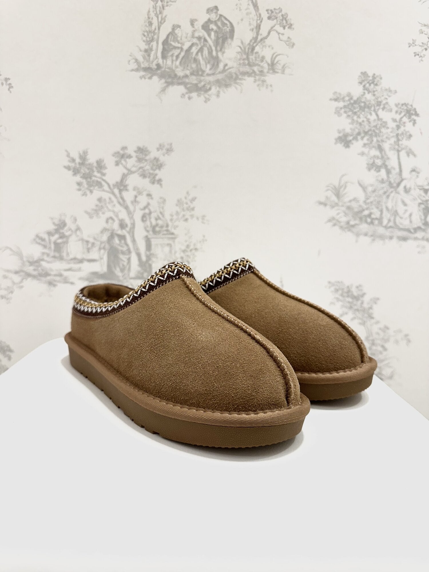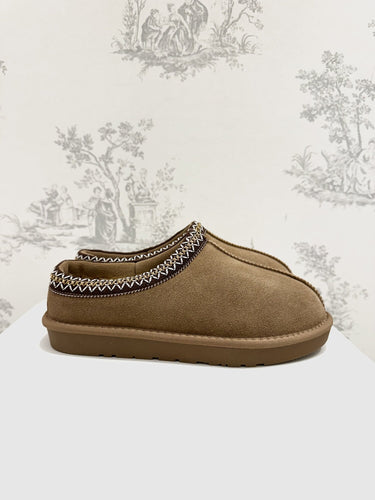 Mules Bassa Camoscio Cammello di Ovyé. Mules in camoscio con suola in gomma, ecopelliccia interna e ricami. Altezza suola 2 cm. Disponibile in cammello.