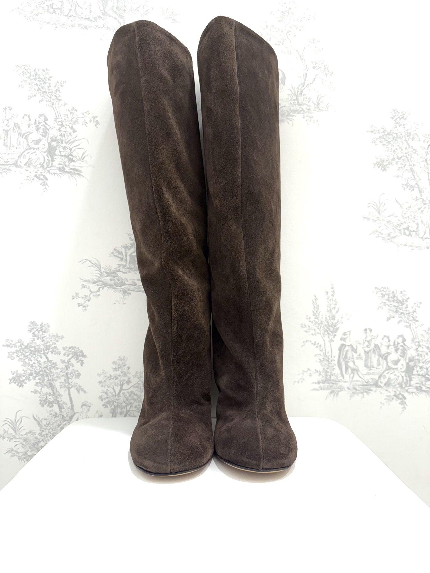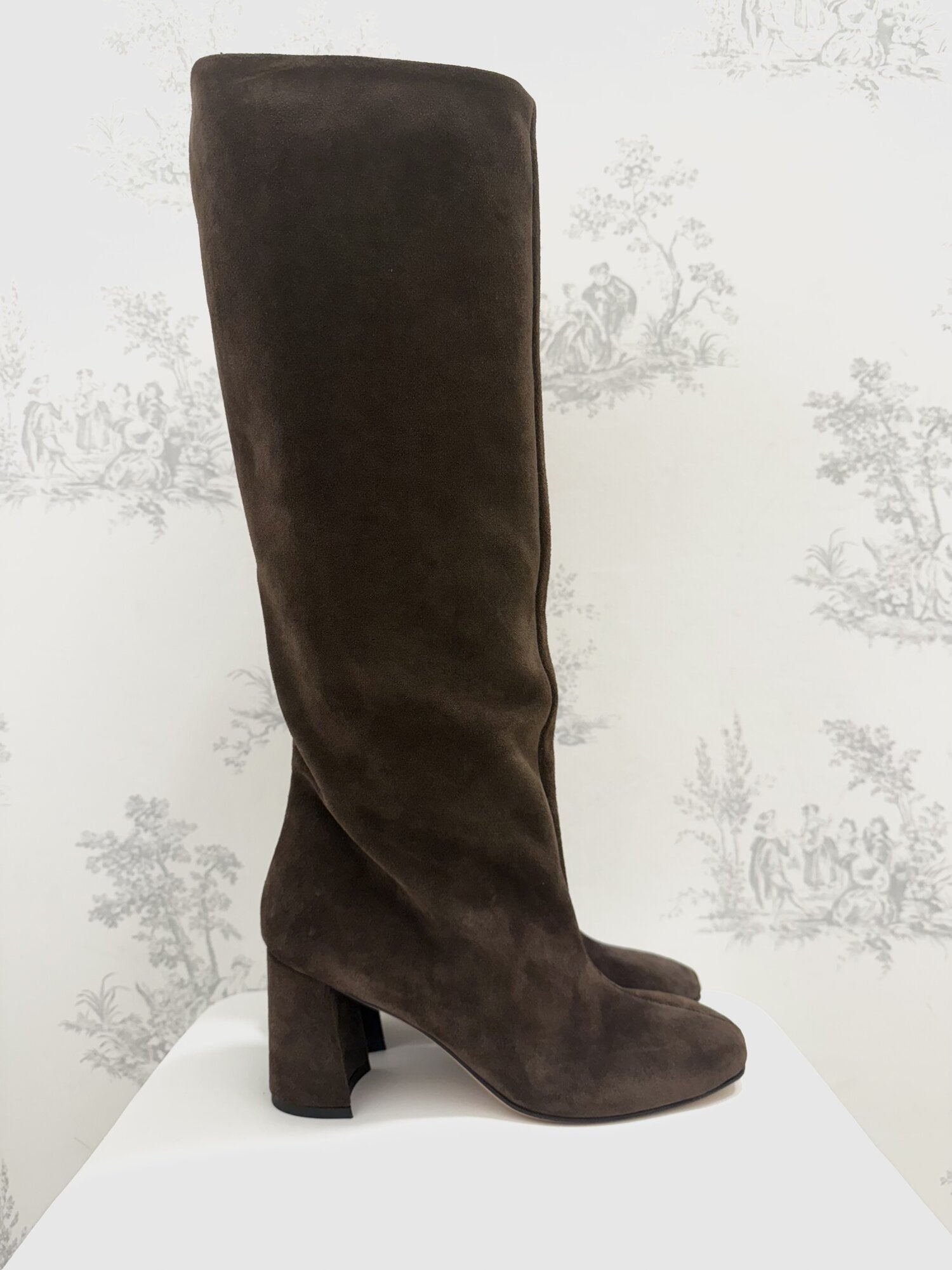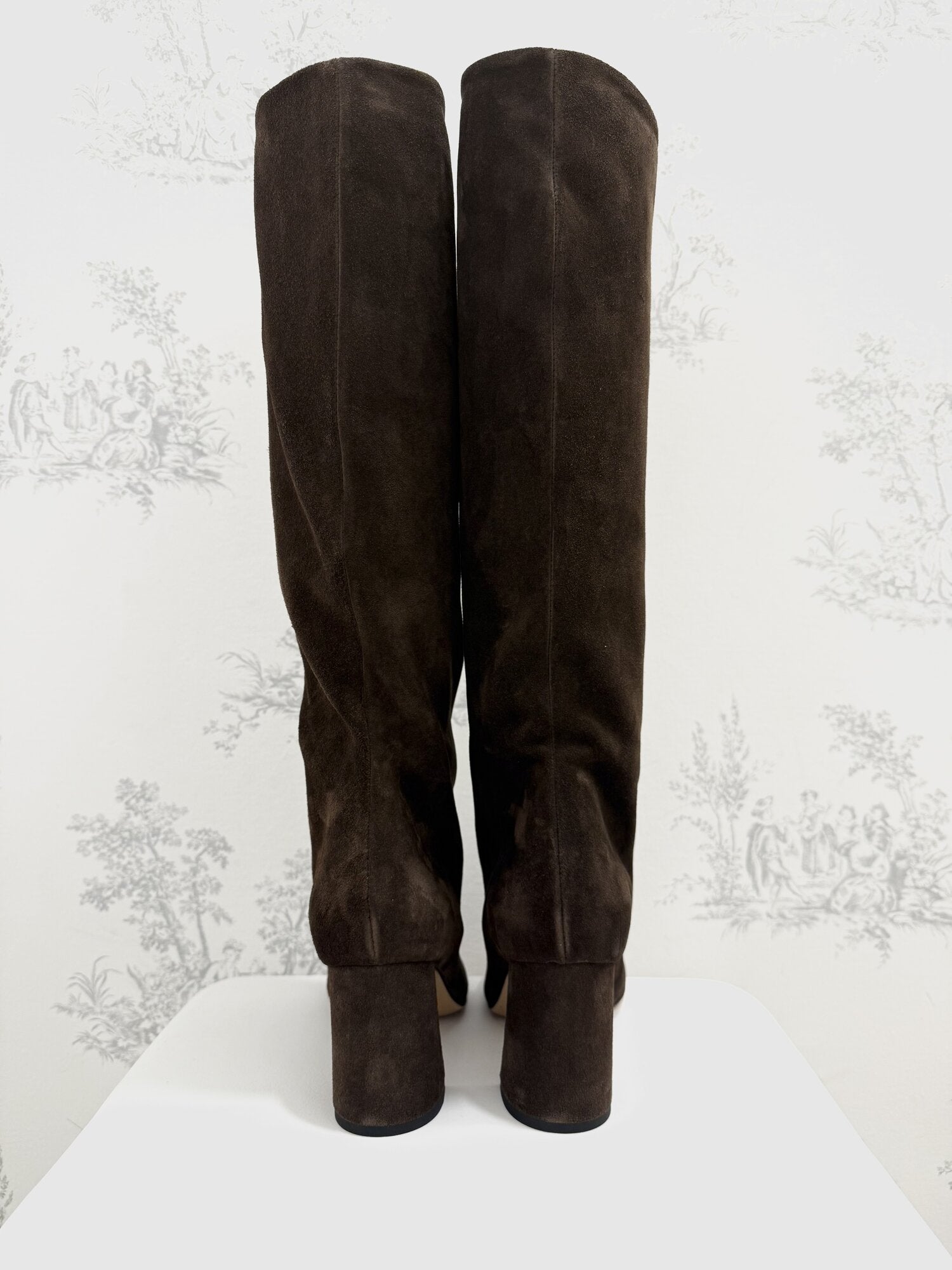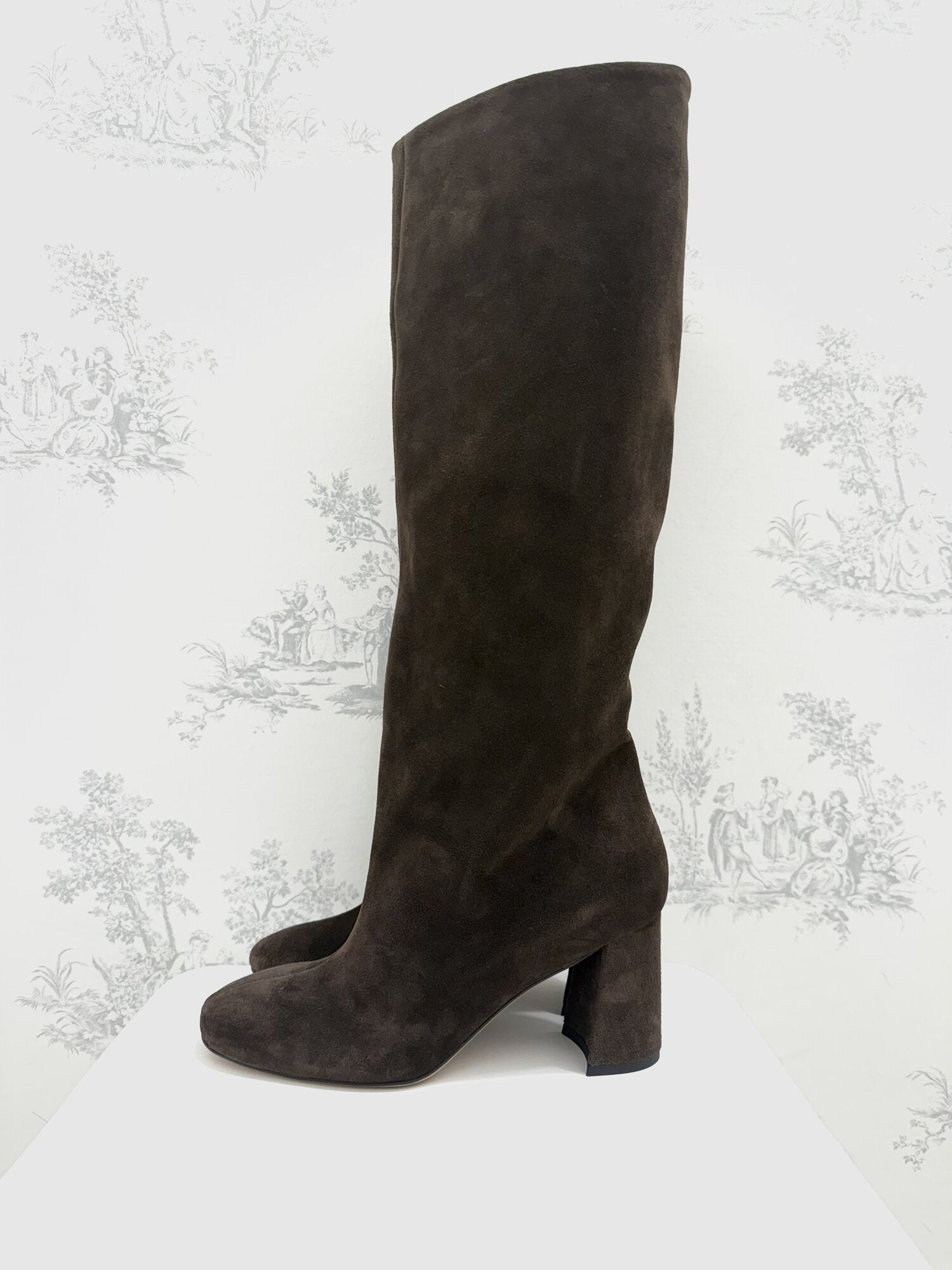 Stivali alti con tacco camoscio moro di Ovyé. Stivali alti in morbido camoscio con punta arrotondata. Tacco a blocco in tinta e vestibilità morbida sul gambale. Disponibili nel colore moro.