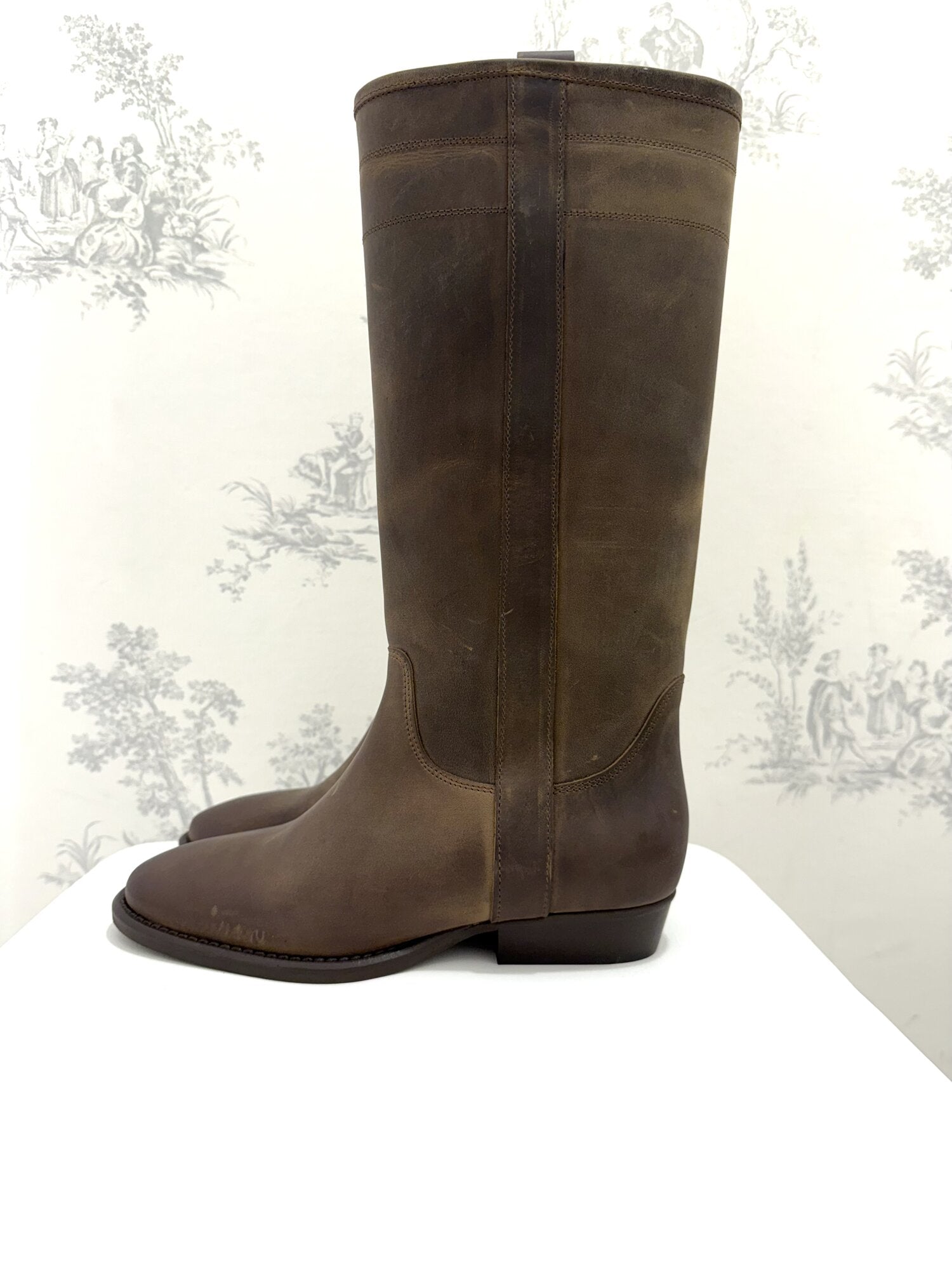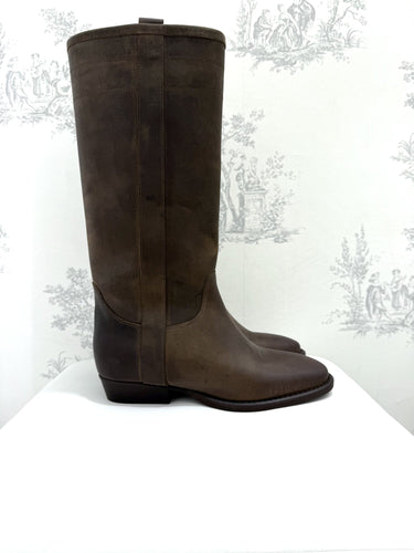 Stivale camperos pelle invecchiata caffè di Ovyé. Stivali alti in pelle con scollo frontale e punta affusolata. Tacco basso a blocco e gambale dritto. Dettaglio di cuciture a contrasto. Disponibili nel colore caffè.