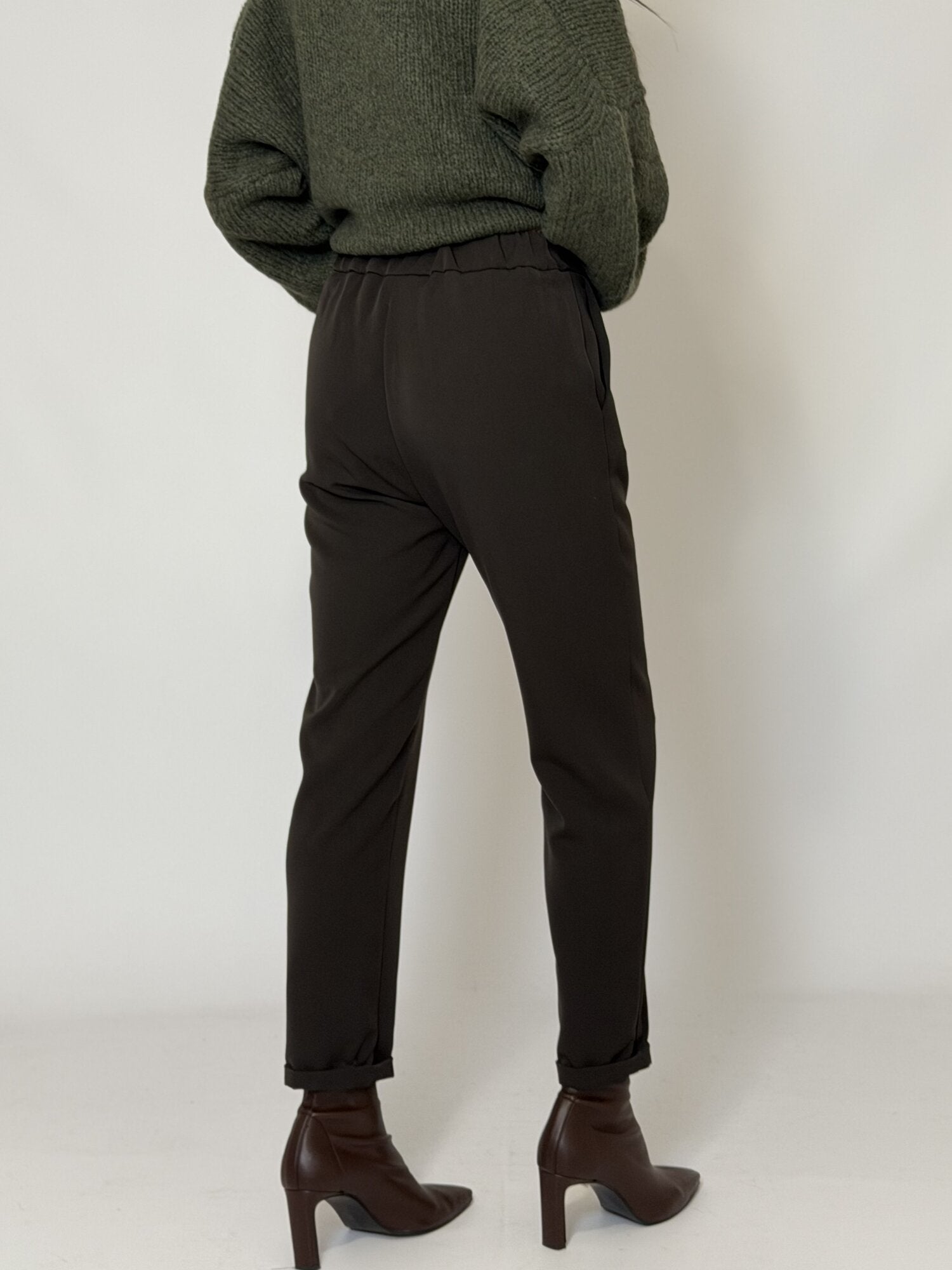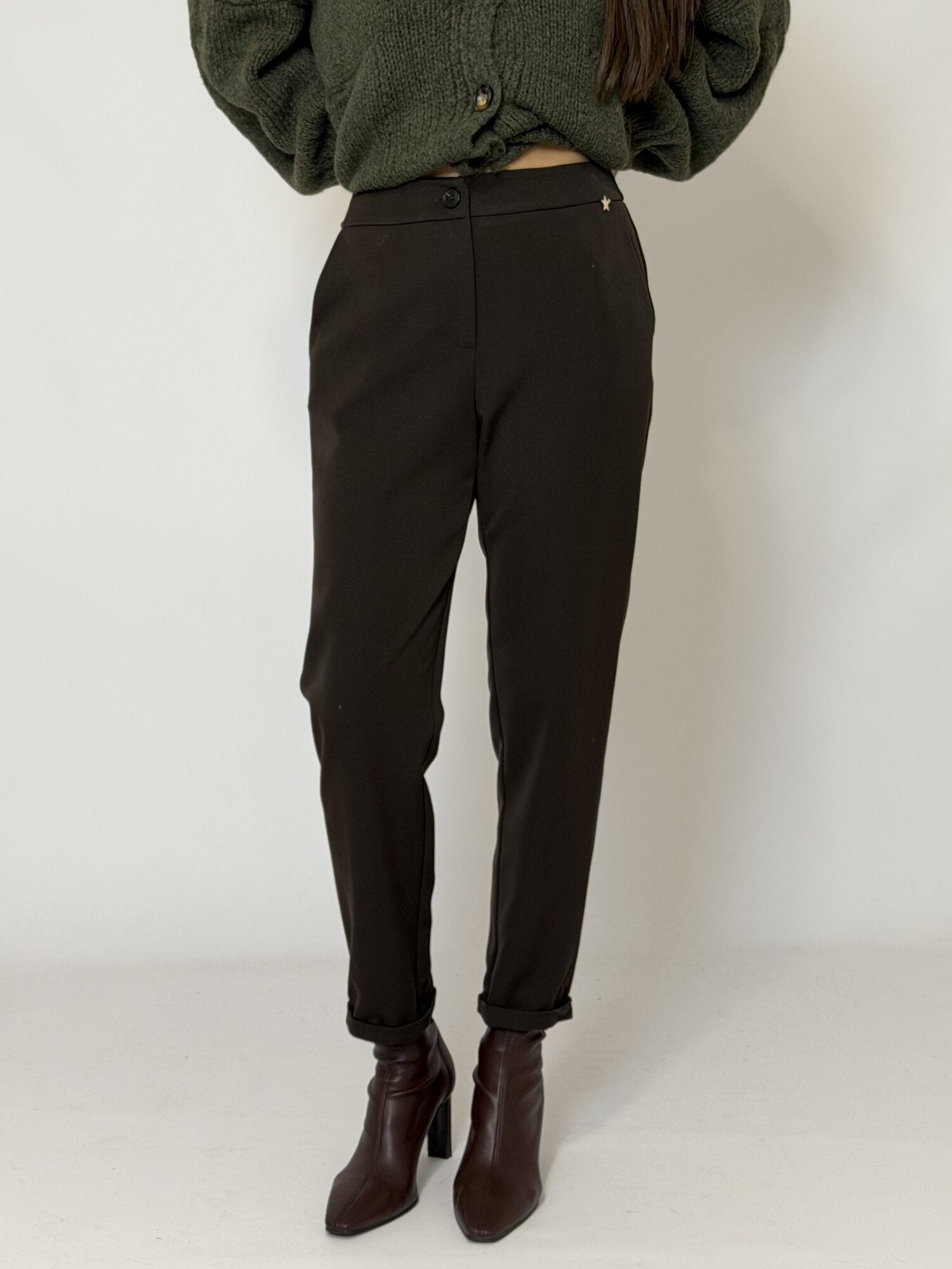 Pantalone carrot moro di Souvenir. Pantaloni con vestibilità carrot e lunghezza alla caviglia con risvolto. Chiusura con bottone e zip. Elastico in vita sul retro. Disponibili nel colore marrone, moro e nero.