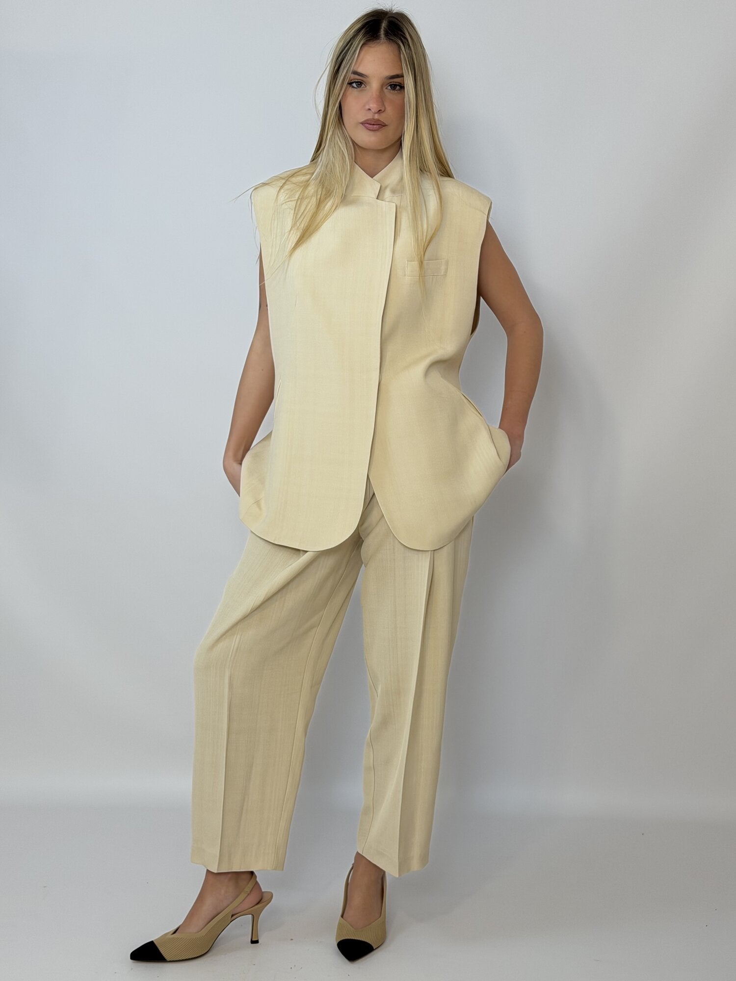 Pantalone Pences balloon Beige di Meimei J. Pantalone a vita alta modello balloon con piega stirata frontale. Passanti per cintura in vita. Tasche a filo oblique laterali. Taschini a filo sul retro. Chiusura con cerniera e gancio. Da abbinare al gilet lungo oversize. Disponibile in beige.