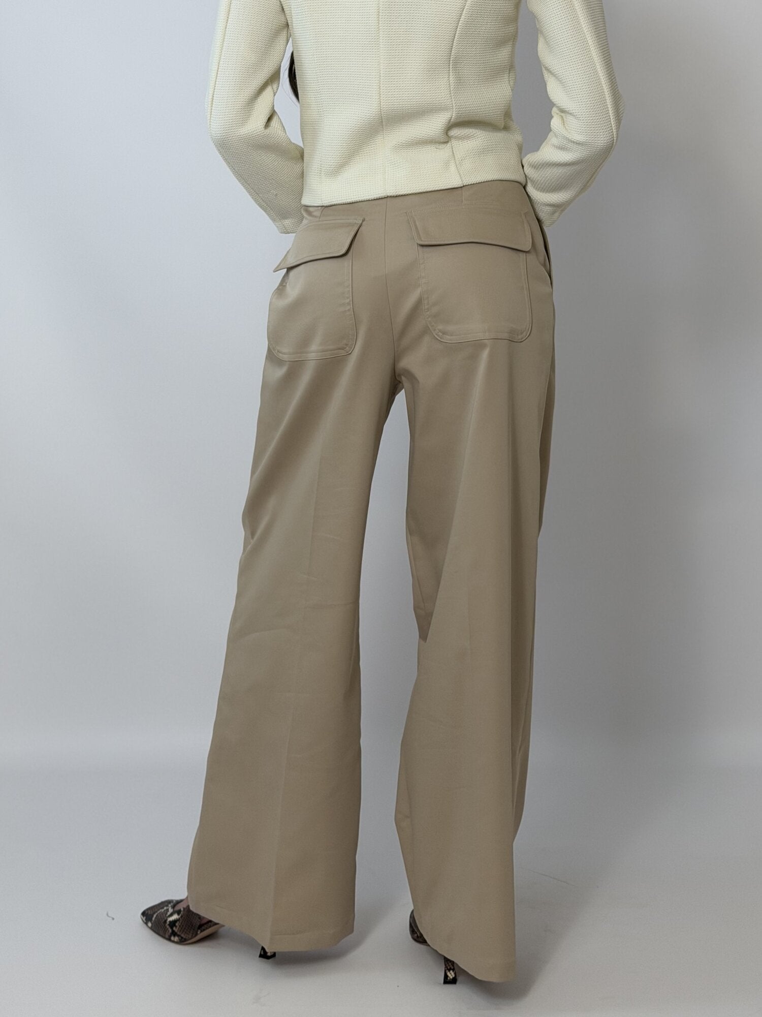 Il tessuto compatto accompagna il movimento senza risultare rigido. Sul retro presenta tasche applicate con patta che aggiungono un dettaglio distintivo al design essenziale. Perfetto sia con maglie aderenti che con blazer coordinati.