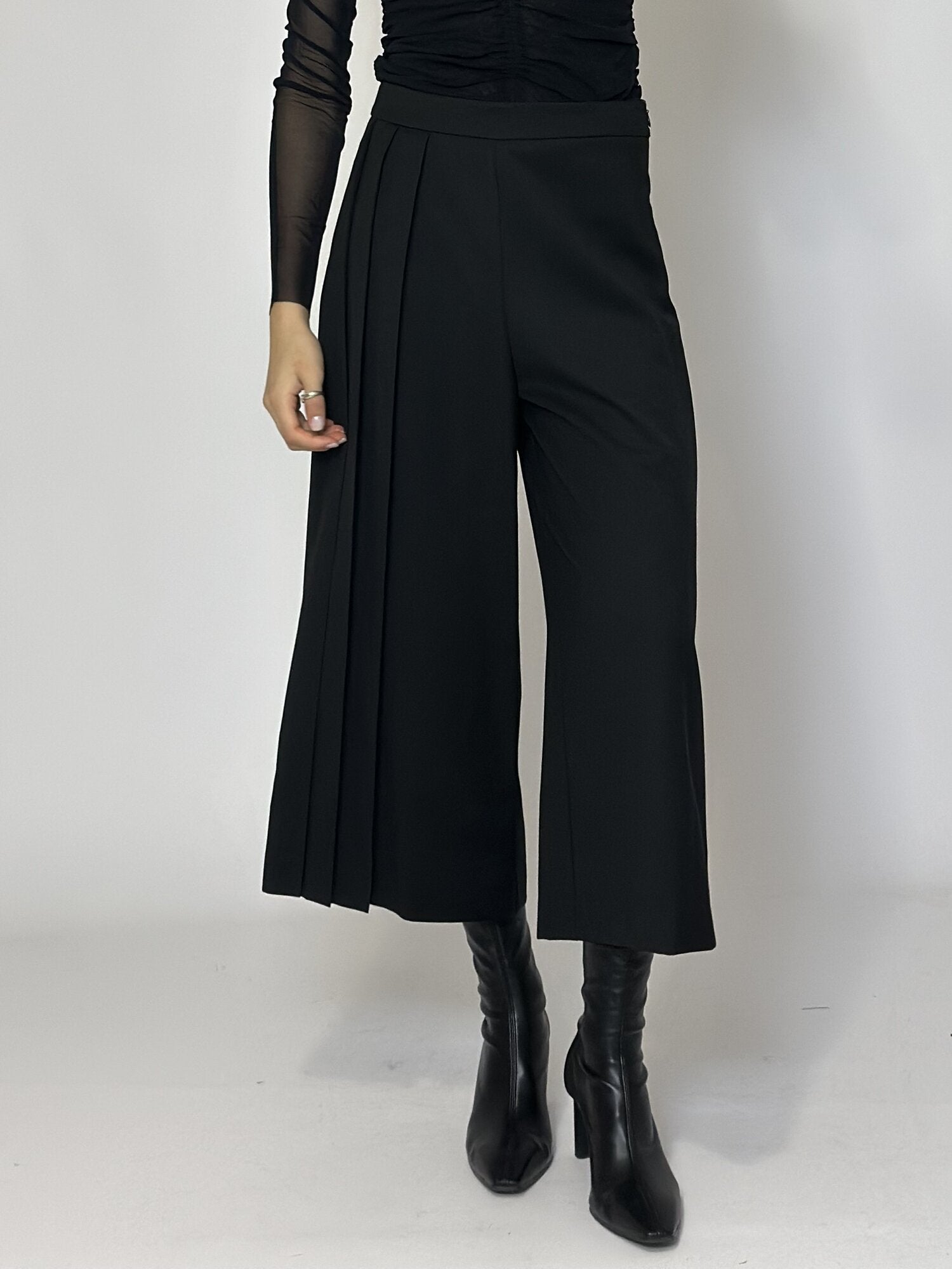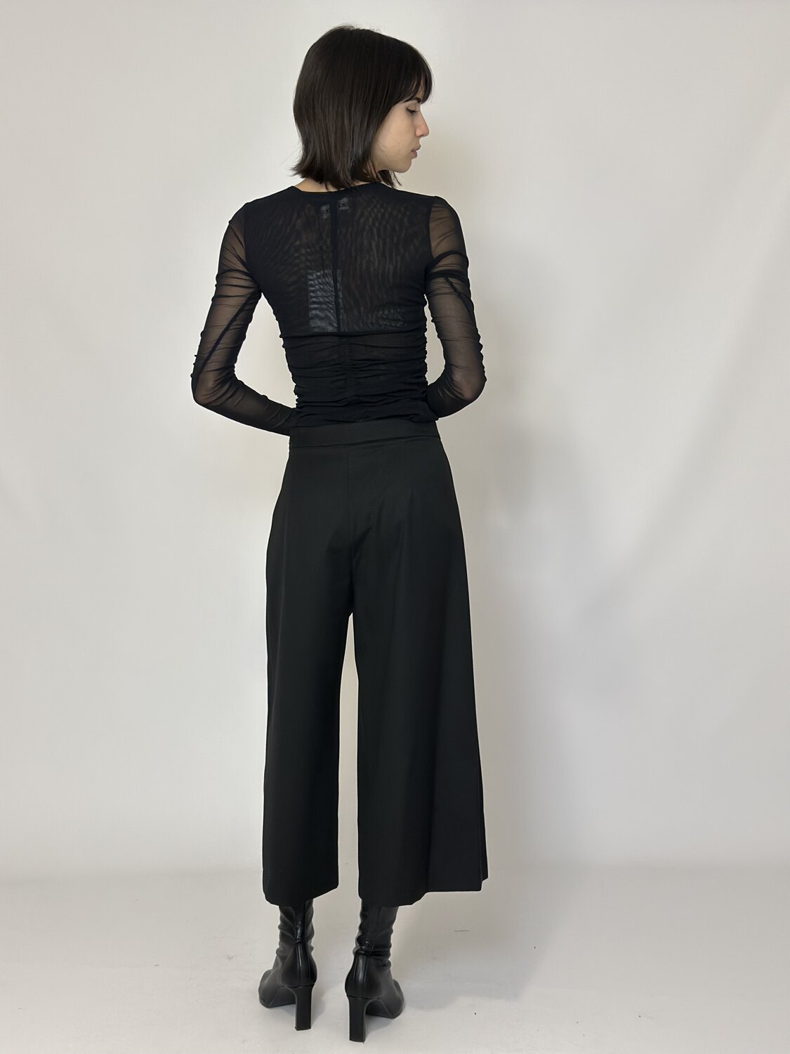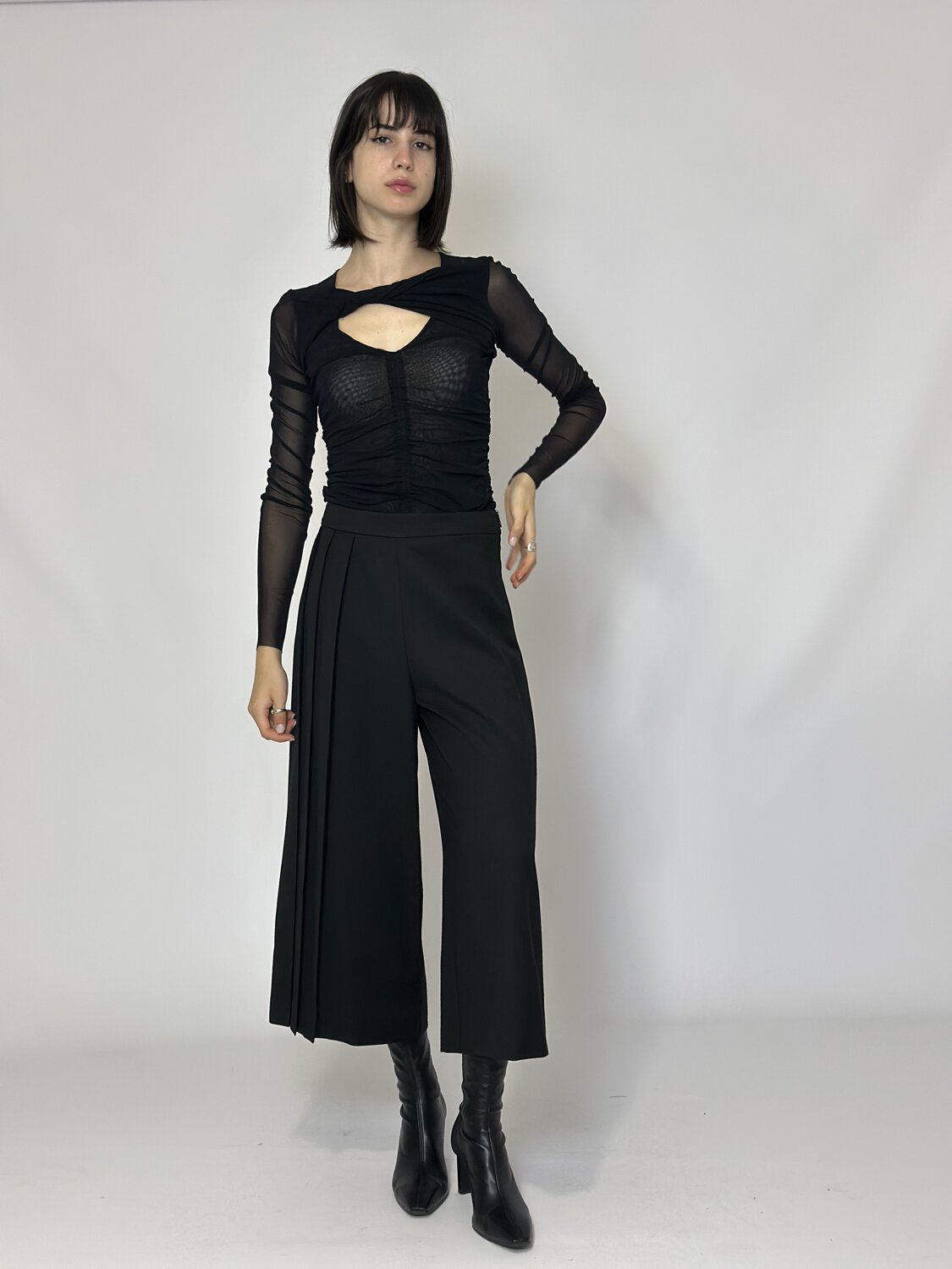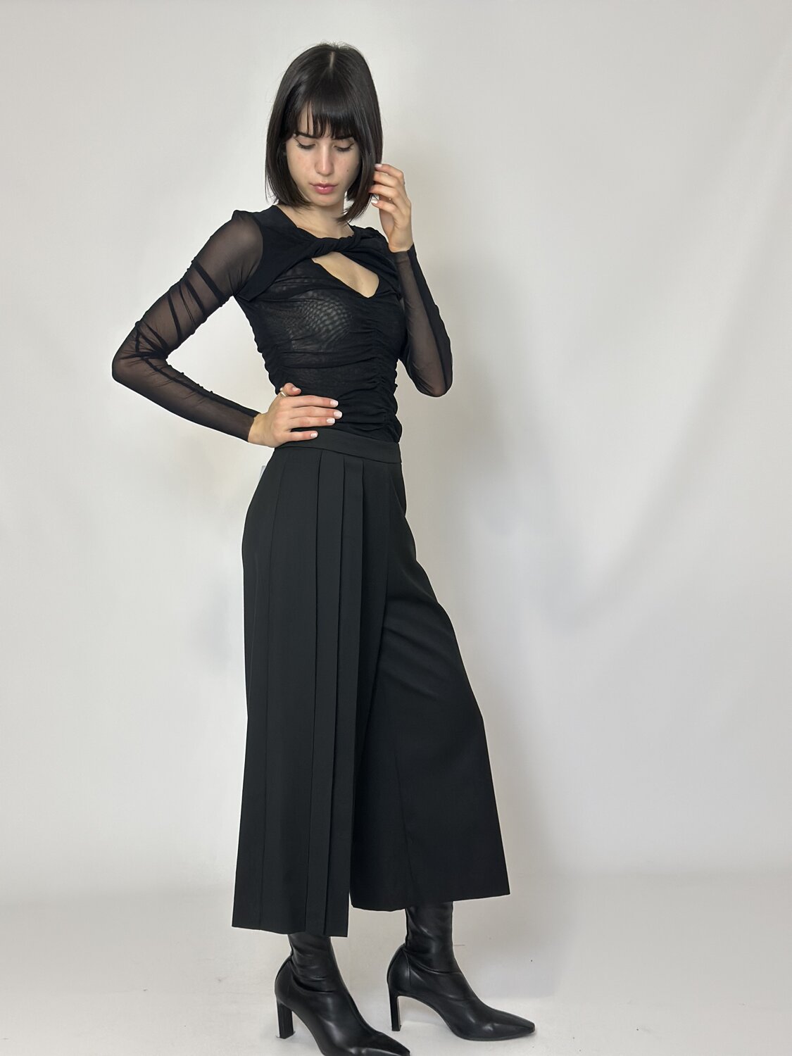 Pantagonna con pieghe nero di Meimei J. Pantagonna in tessuto con vita alta e pieghe sul lato. Tasche a filetto e vestibilità ampia e fluida. Disponibile nel colore nero.