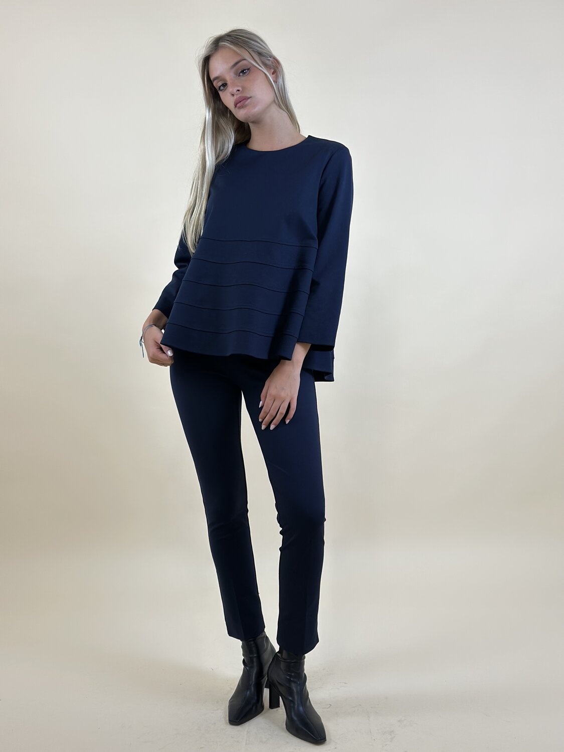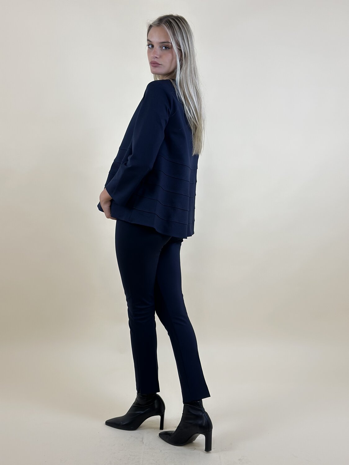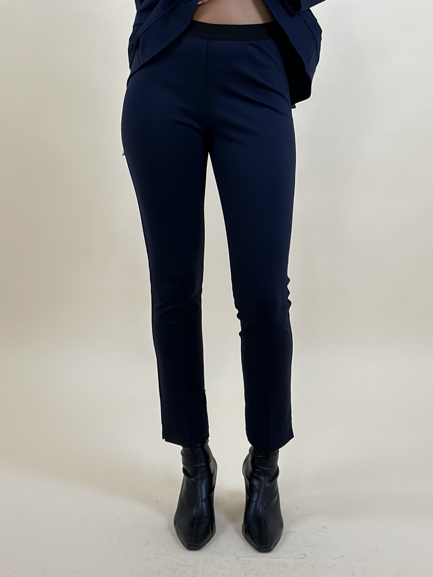 Pantalone carrot con elastico blu notte di Meimei J. Pantalone dritto lunghezza alla caviglia con elastico nero in vita. Disponibile nel colore blu notte.