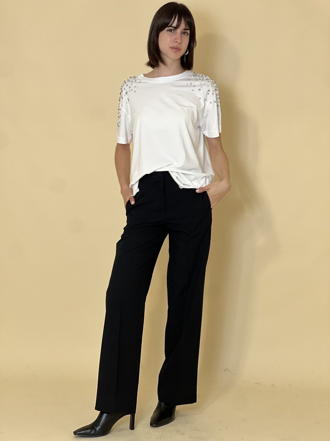 Pantalone dritto nero di Vicolo. Pantaloni a vita alta con vestibilità morbida. Chiusura con bottone e zip. Taglio dritto e tasche a filetto laterali. Disponibili in vinaccio, moro e nero.