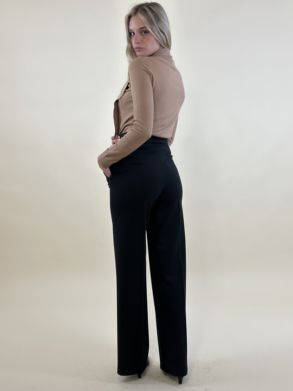 Pantalone palazzo Editore nero di Emme Marella. Pantalone palazzo con tasche a filo, chisura con bottone automatico. Tessuto tecnico. Disponibile in nero e cammello.