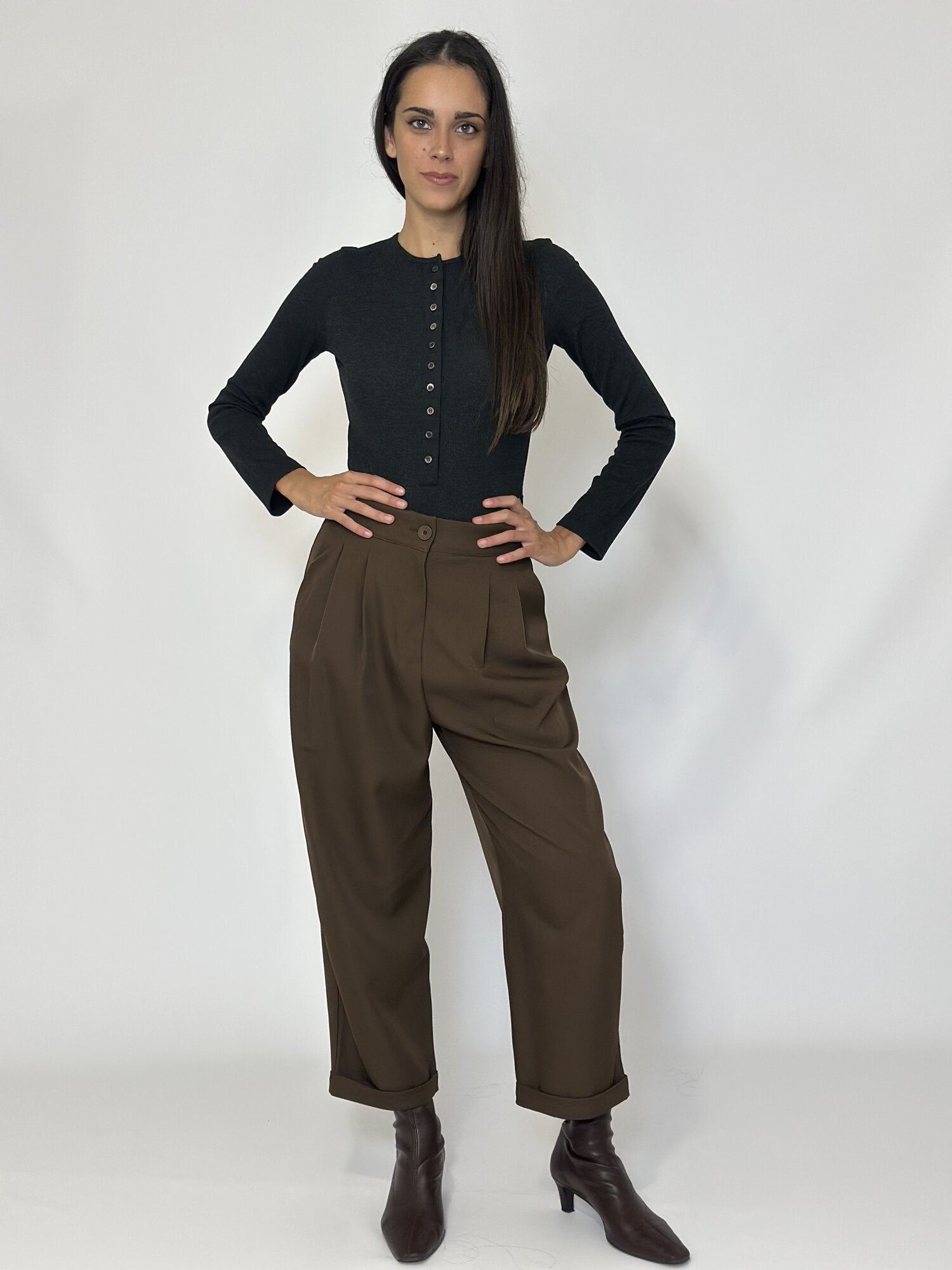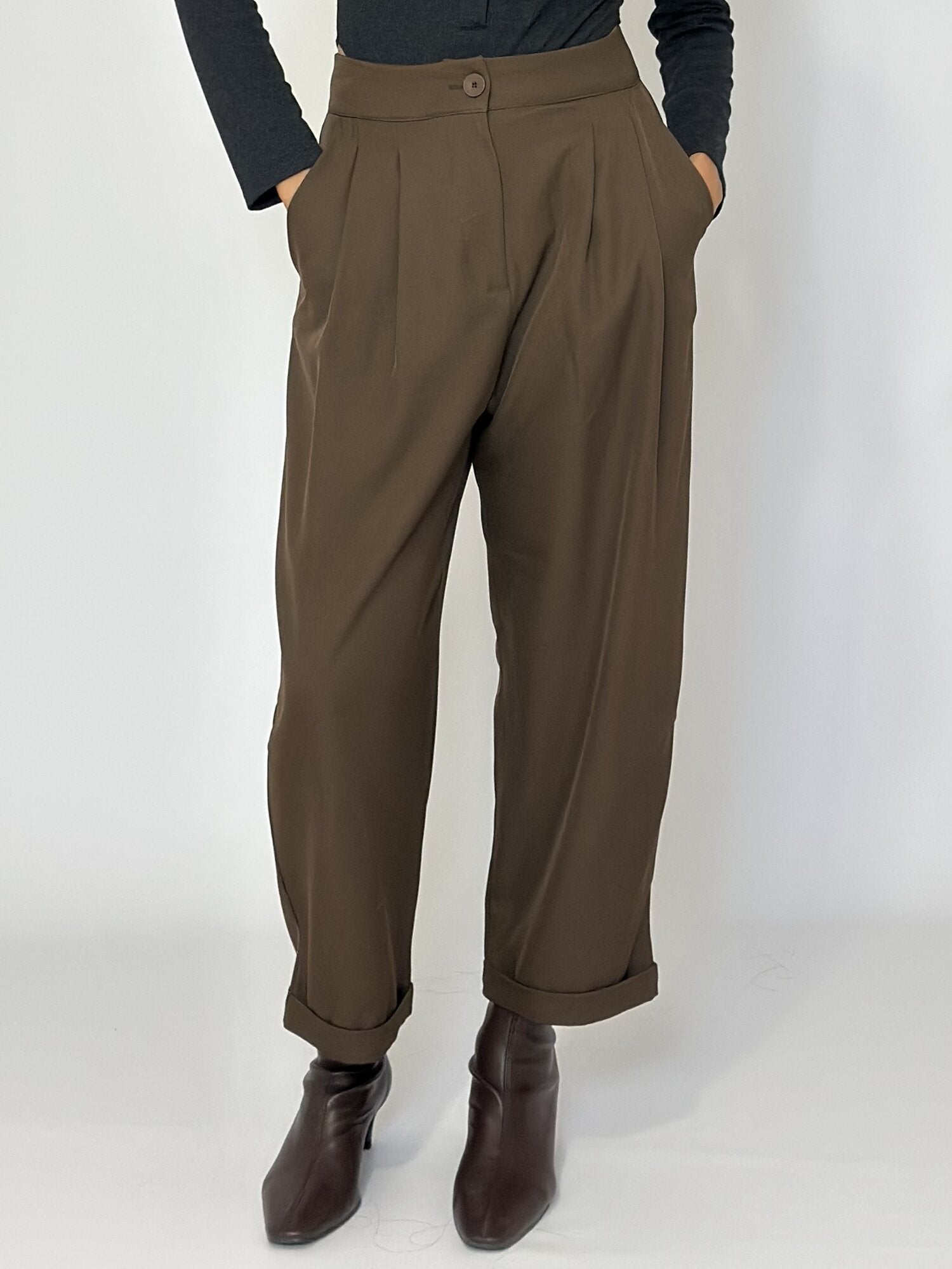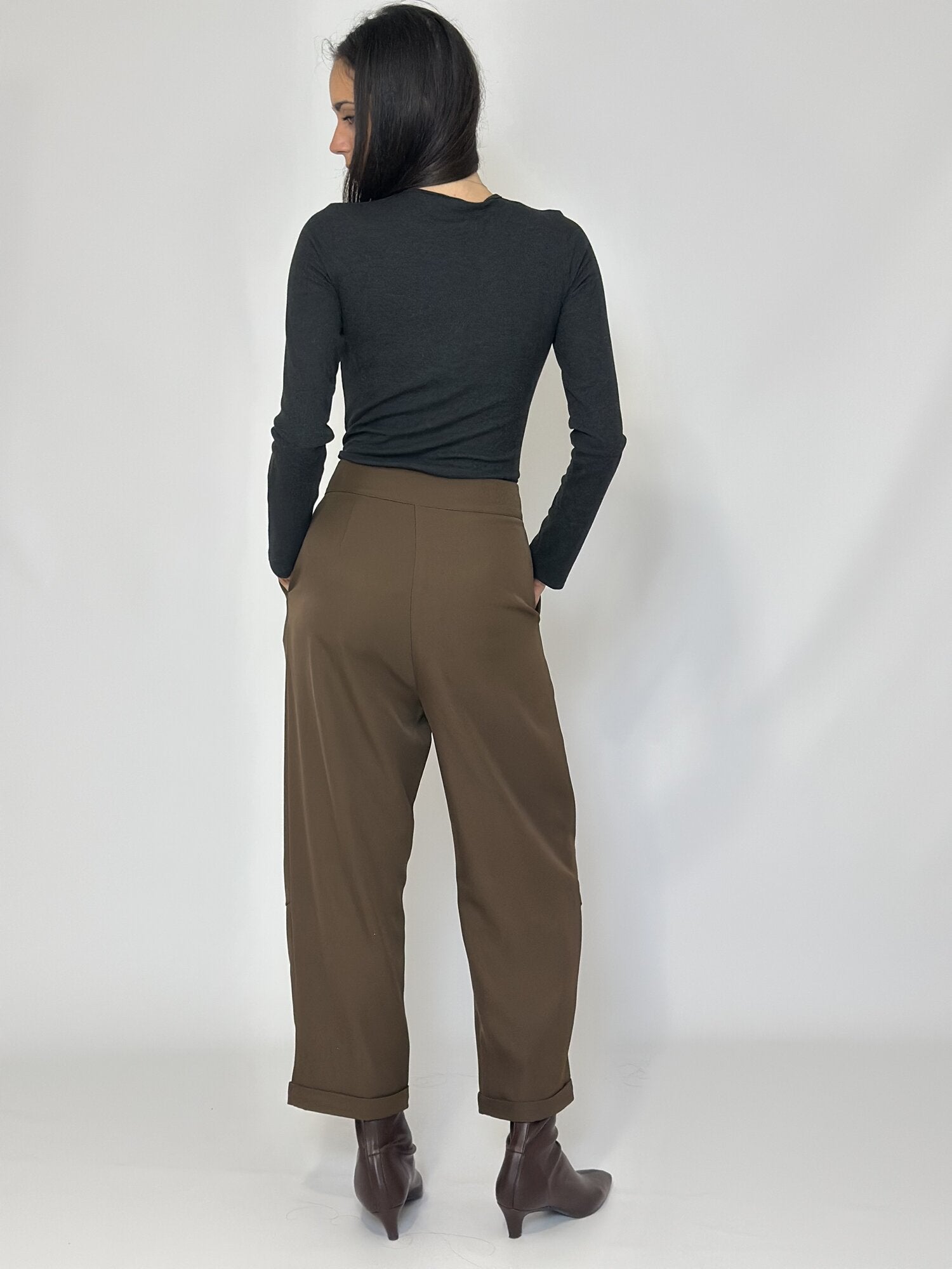 Pantalone con pences verde bosco di Vicolo. Pantalone balloon in punto milano. Pantaloni a vita alta con vestibilità morbida. Dettaglio di pieghe sul davanti e risvolto. Chiusura con bottone. Tasche a filetto sui lati e risvolto sull'orlo. Disponibile in verde bosco, marrone e nero.