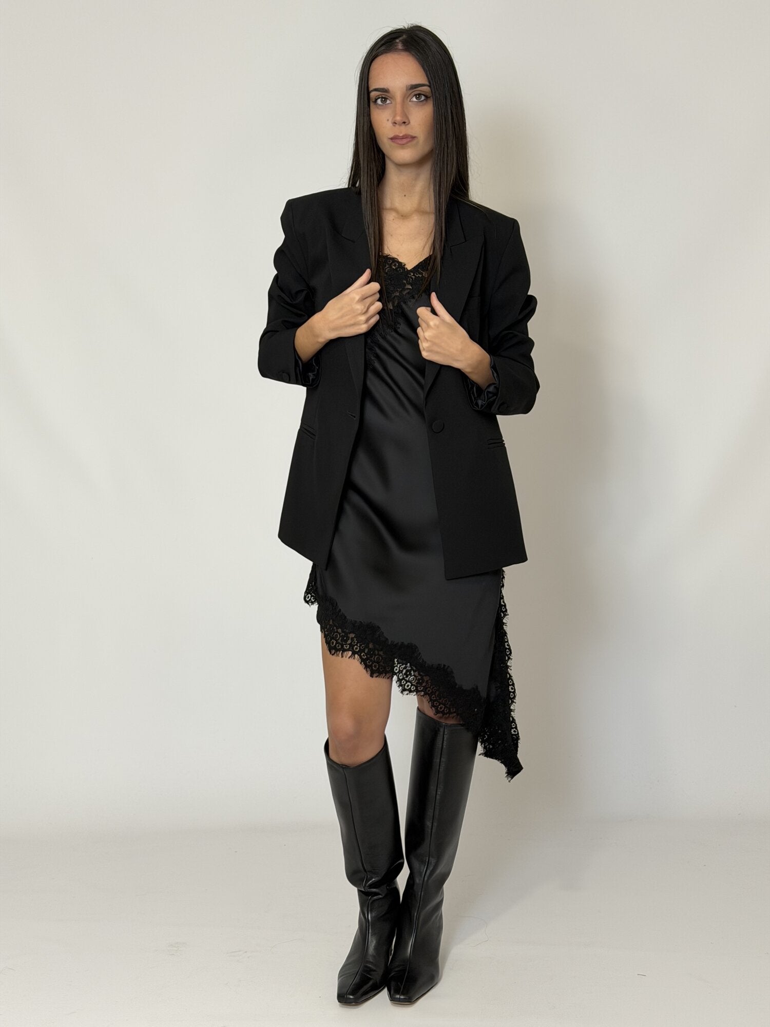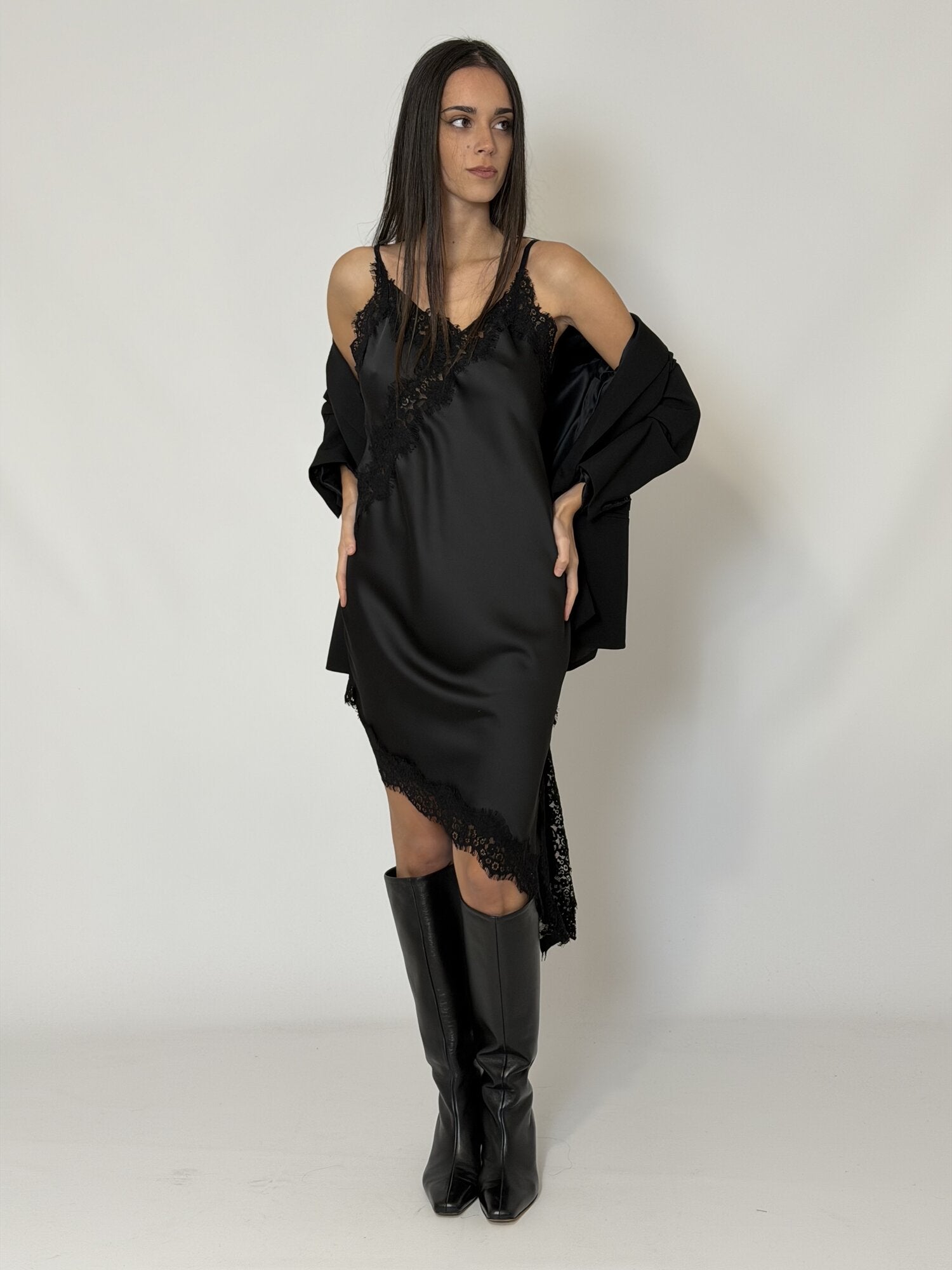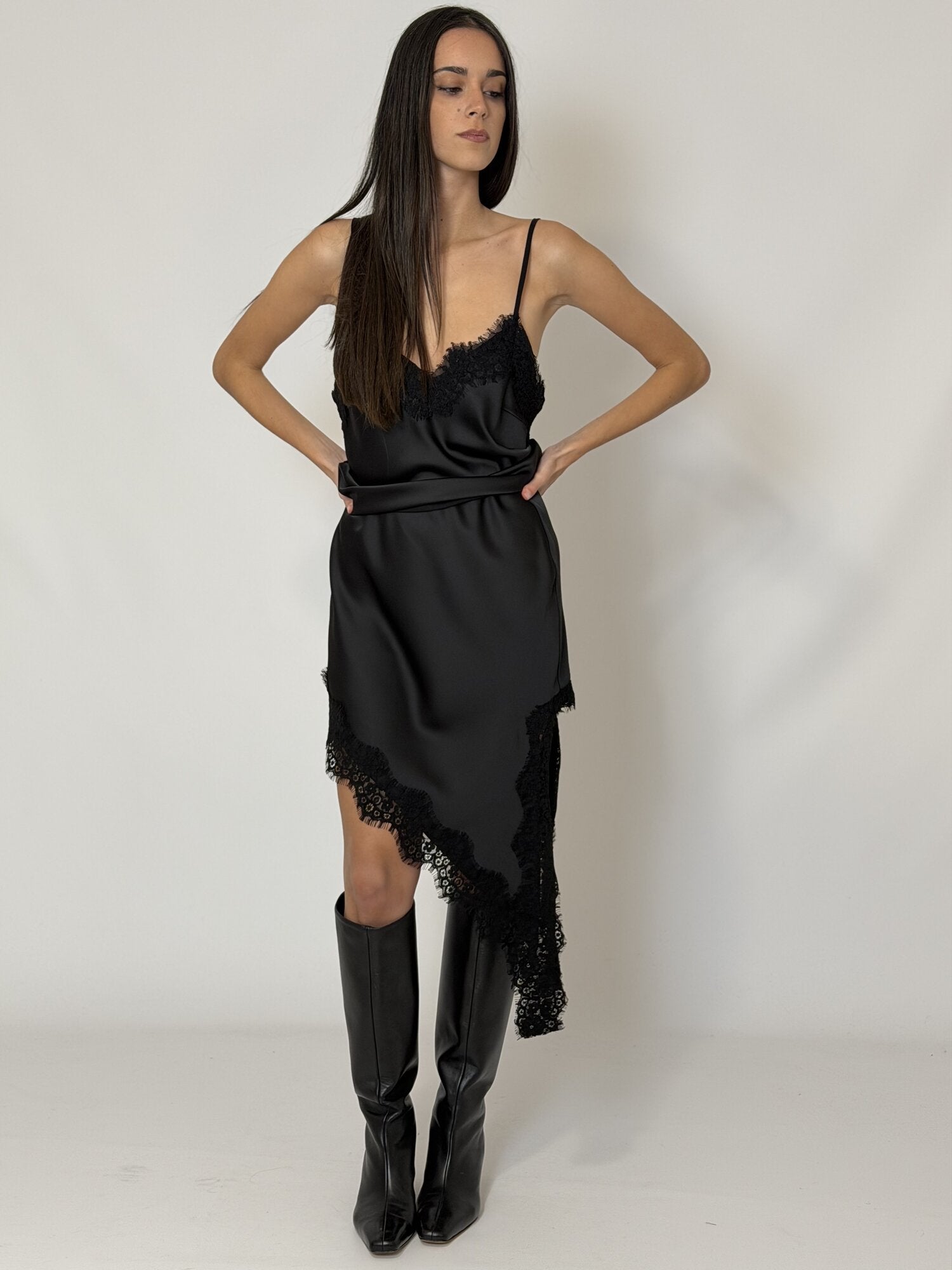 Abito asimmetrico in raso nero di Haveone. Abito corto in raso con bretellina sottile e scollo a V. Taglio asimmetrico della gonna. Pizzo sullo scollo e sul profilo della gonna. Disponibile in nero.