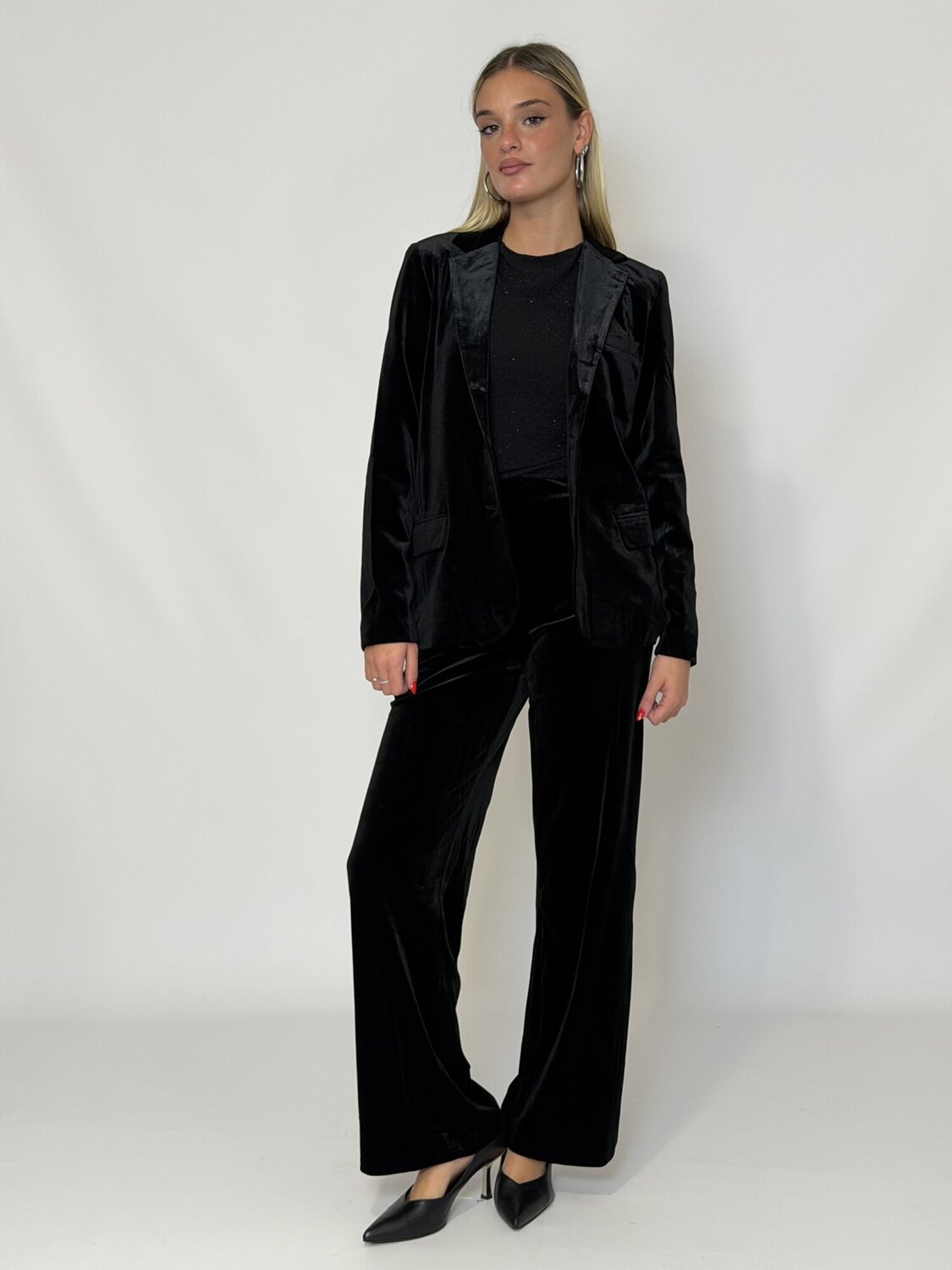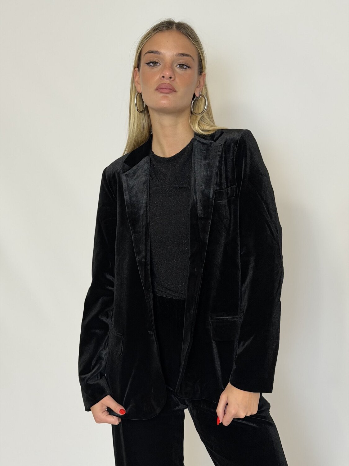 Blazer Velluto Tofu nero di Grace & Mila. Blazer vestibilità dritta. Maniche lunghe. Colletto con revers dentellati. Chiusura monopetto. Tasca a filetto sul petto. Tasche frontali con patta. Fodera con monogramma esclusivo G&M. Disponibile in nero.