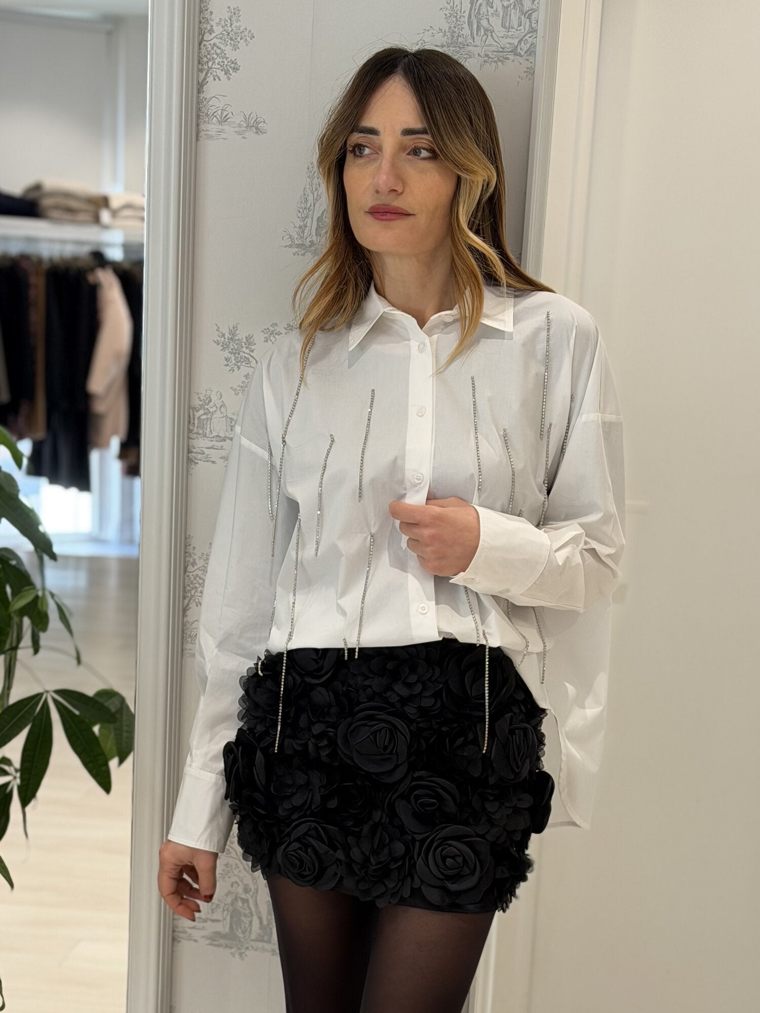 Camicia Bianca Oversize con Dettagli in Strass. Camicia a maniche lunghe tinta unita bianca. Vestibilità morbida e oversize. Scollo colletto classico. Decorata con file verticali di strass lucidi sul davanti. Disponibile in bianco.
