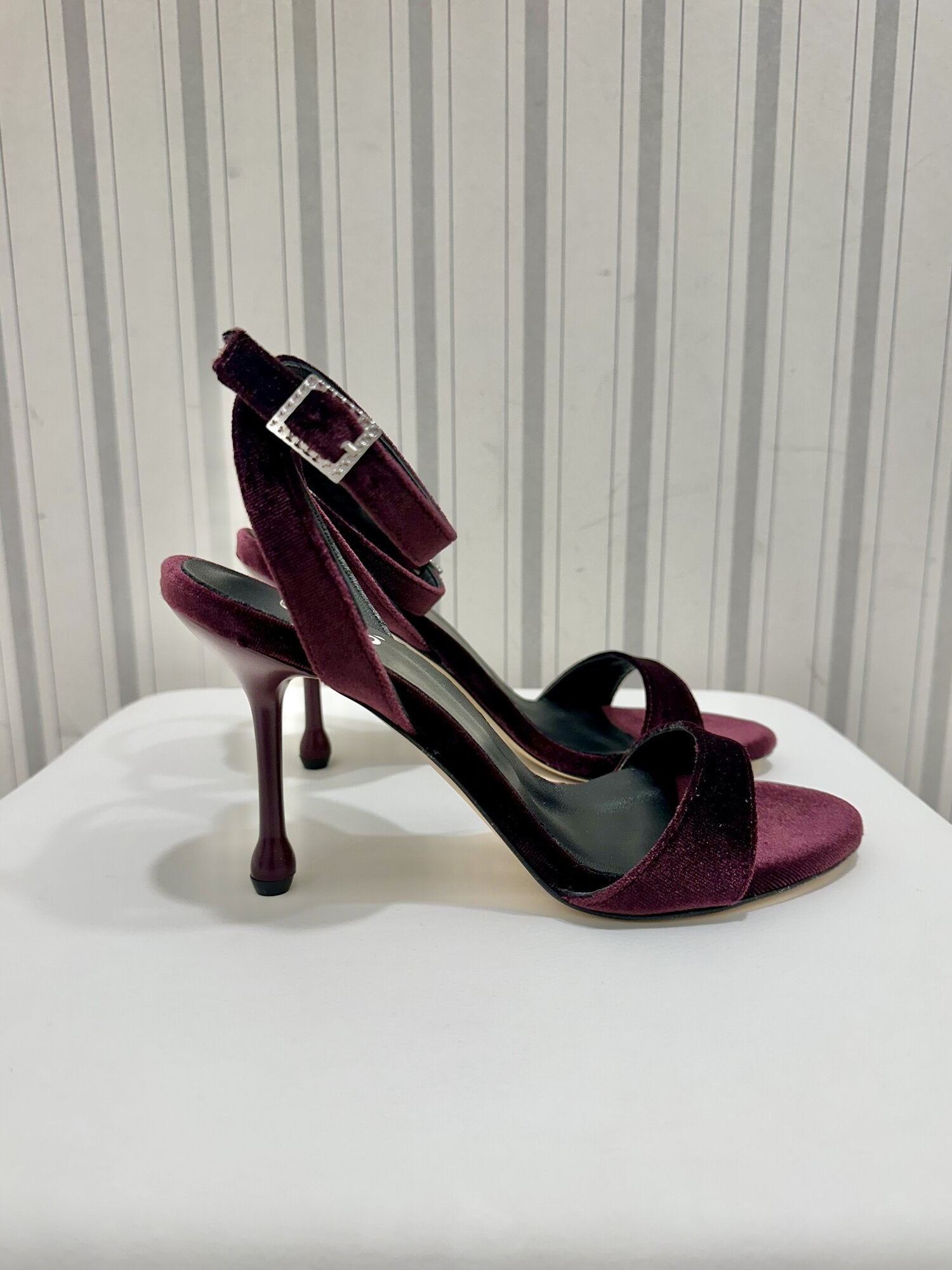 Sandalo Velluto Bordeaux di Ovyé. Sandalo con tacco in velluto con punta stondata e cinturino regolabile alla caviglia con fibbia strass argentata. Altezza tacco 10 cm. Disponibile in nero e bordeaux.