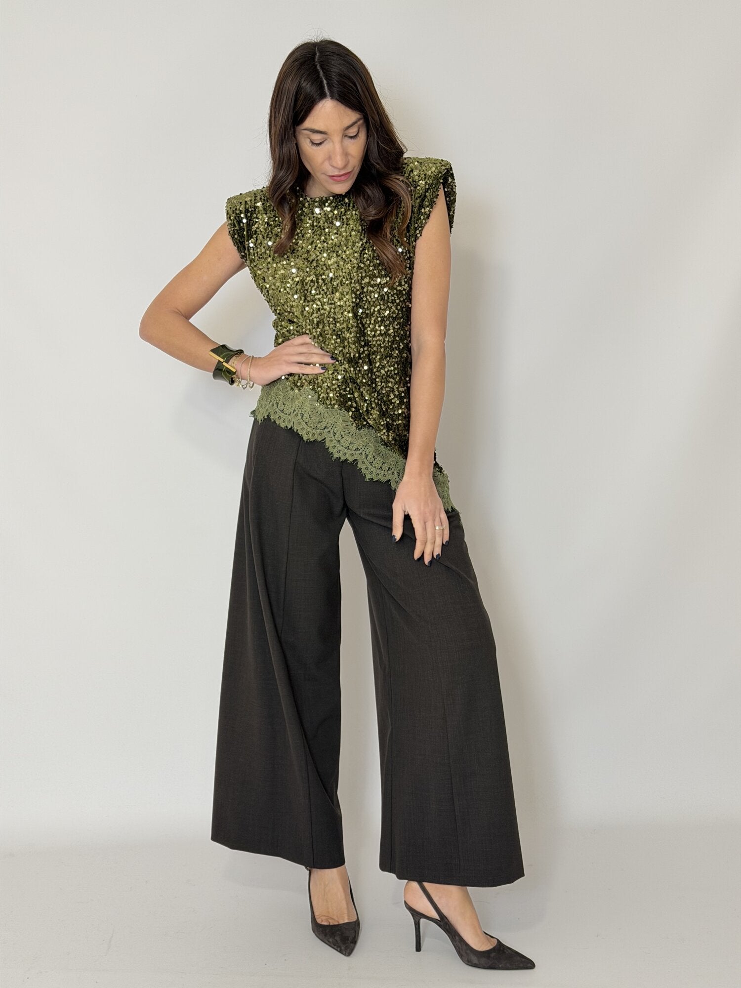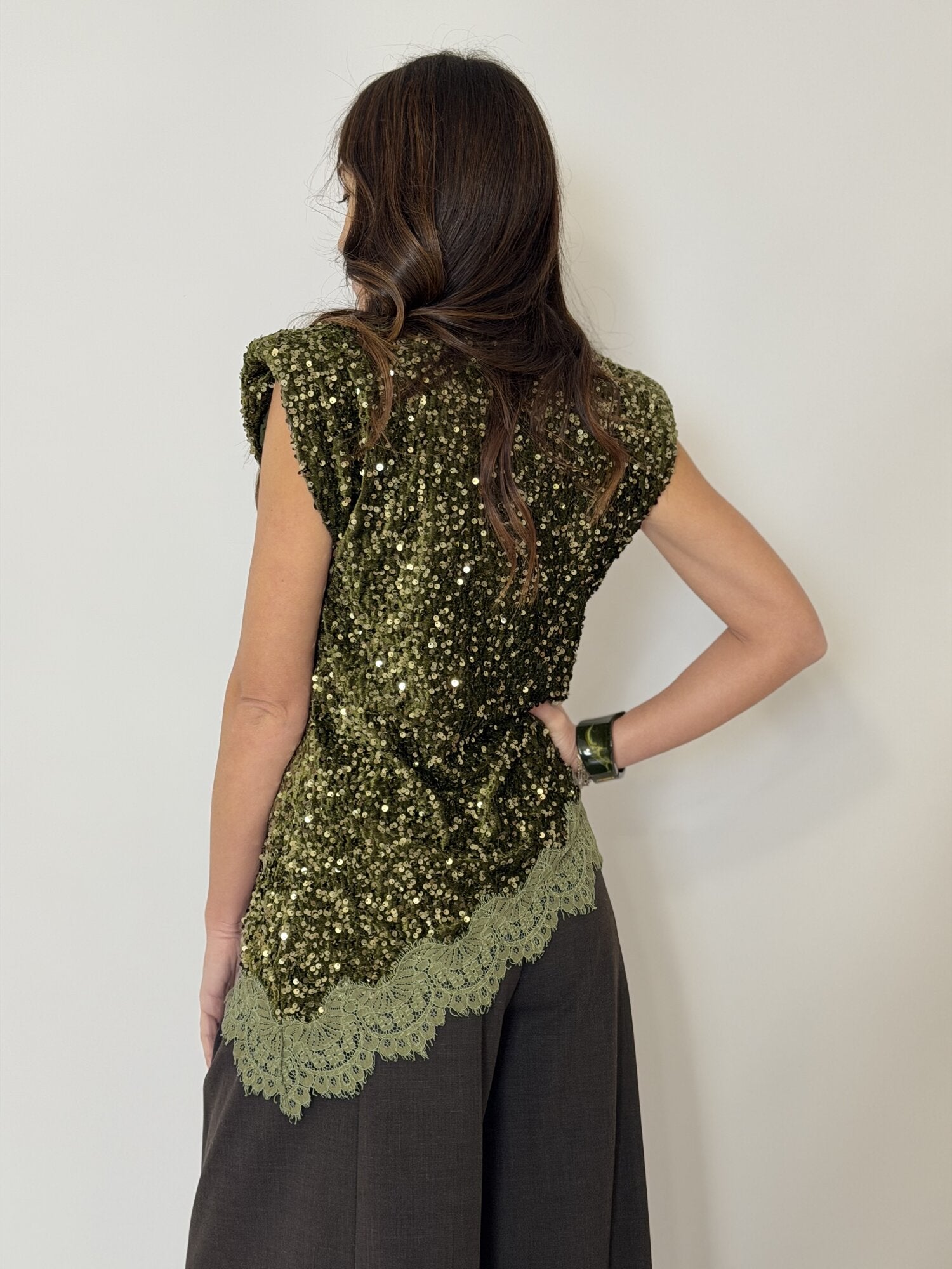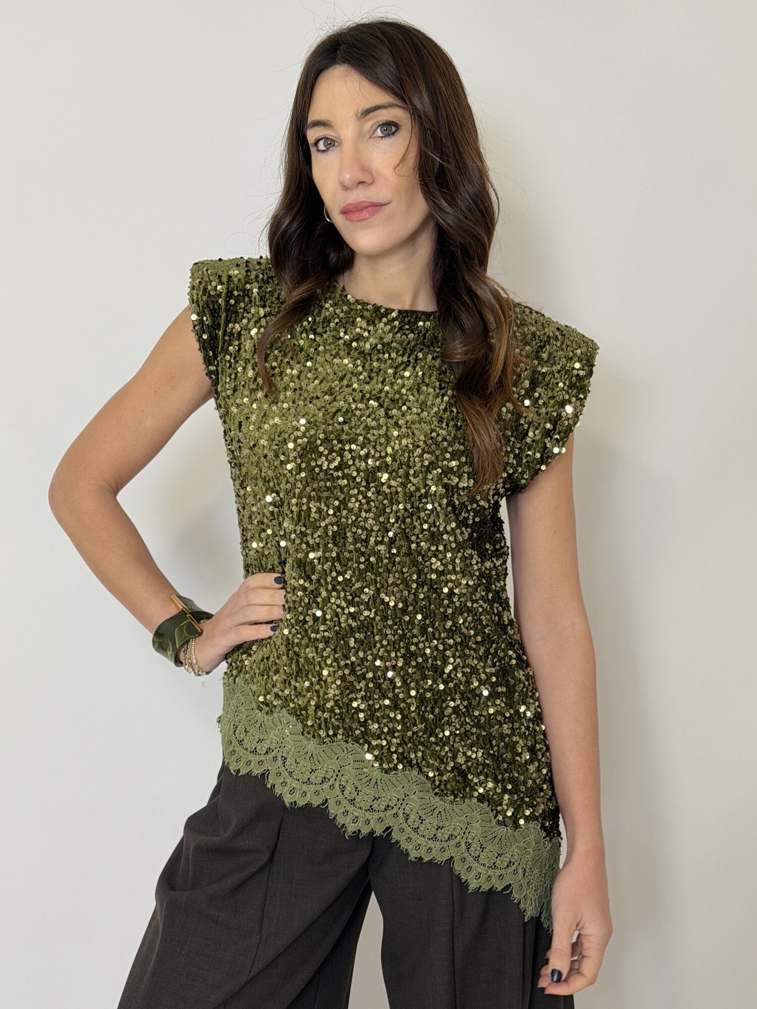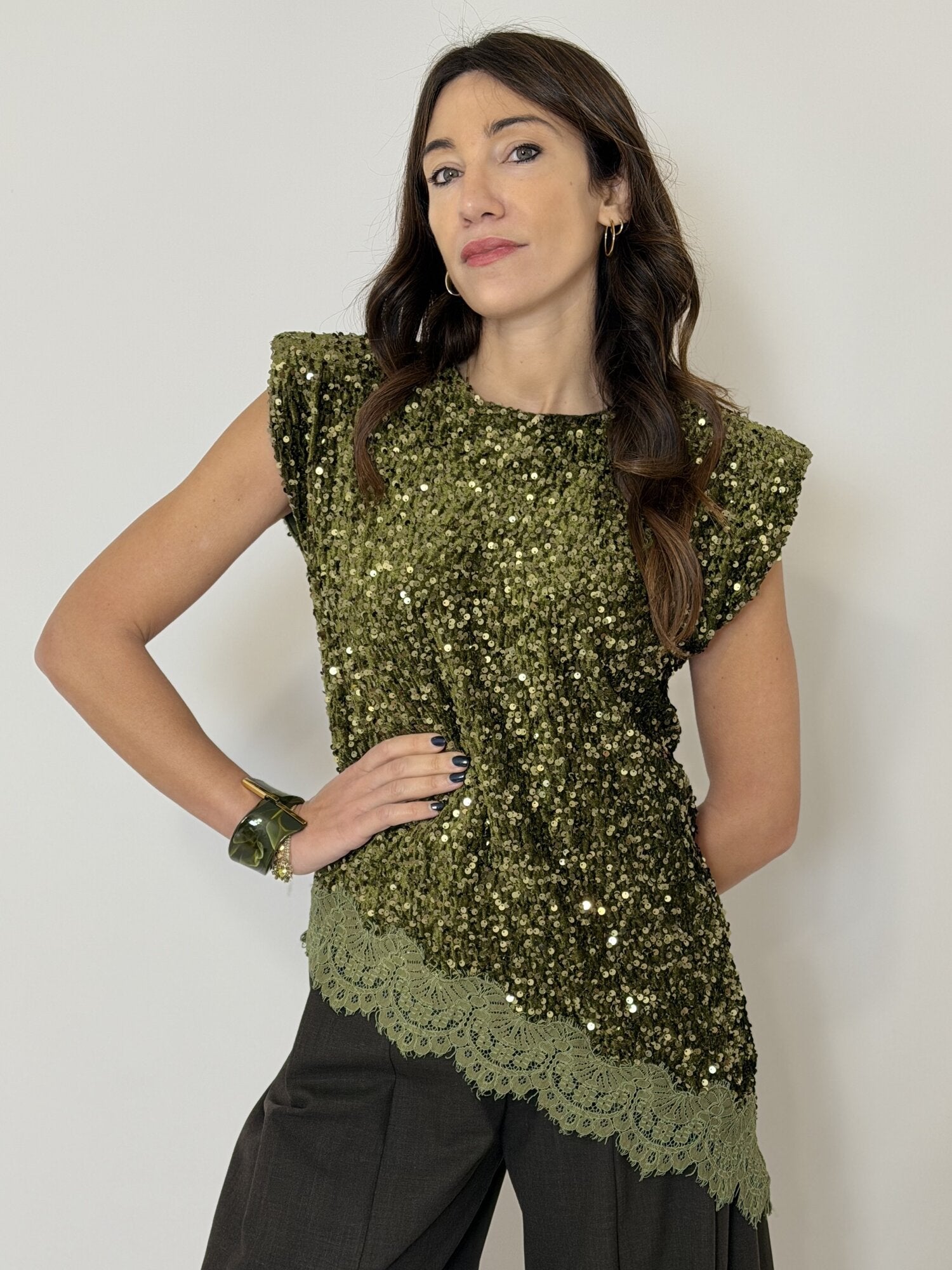 Top Paillettes Spalline Verde Militare di Tensione In. Top asimmetrico ricoperto di paillettes, modello girocollo smanicato con spalline imbottite. Dettaglio pizzo sul fondo. Disponibile in verde militare.