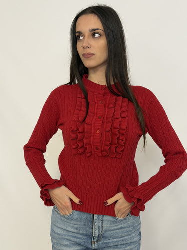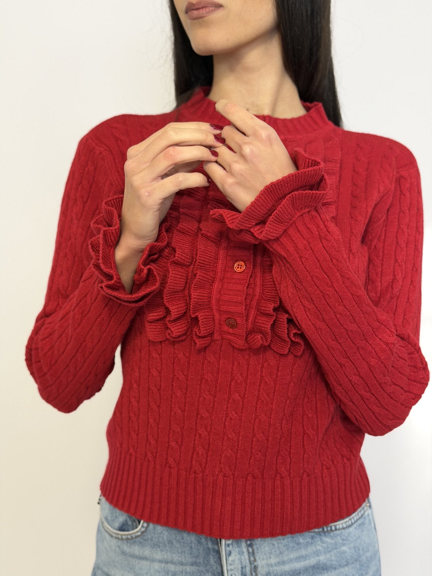 Maglia a trecce con rouches Rosso di Vicolo. Maglia a maniche lunghe con scollo girocollo e rouches sullo scollo, con bottoni frontali. Maniche lunghe con rouches sui polsi. Vestibilità aderente. Taglia unica. Disponibile in moro, rosso e panna.